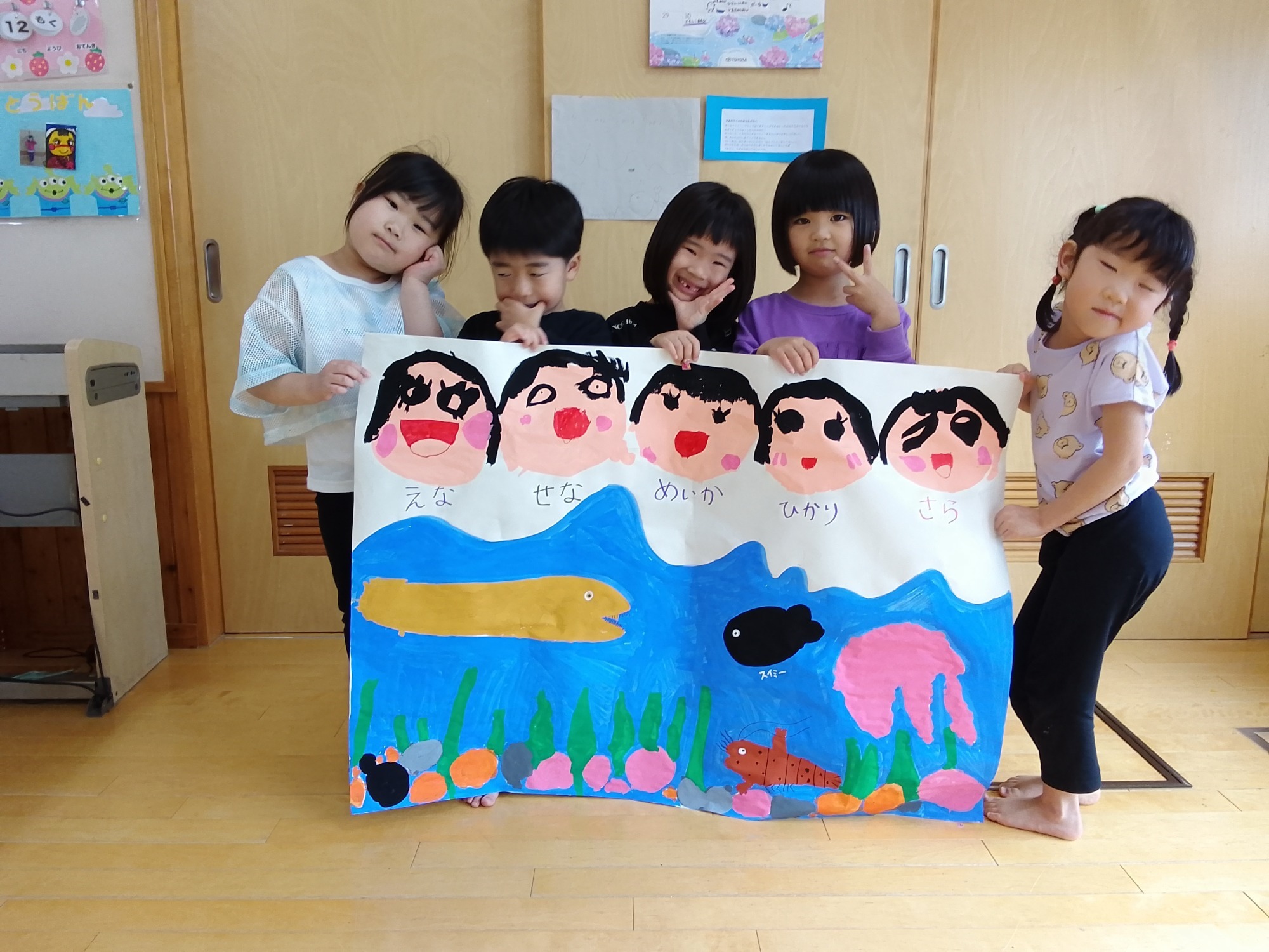 7月にあるお泊り会に向けて今年は、絵本「スイミー」をテーマに取り組んでいます。皆で協力して旗を作りました。