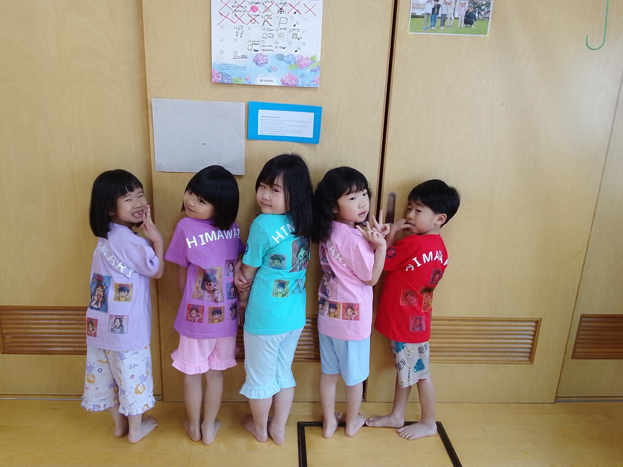参観日ではお泊り会に着るTシャツ作りをしました♪後ろにはみんなの似顔絵のイラストがプリントされています!