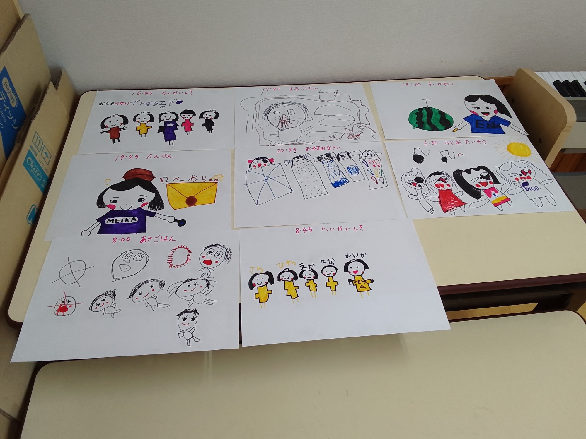 おしゃれに目覚めた女の子達。画用紙でつけまつげを作って遊びました☻4月は付け爪を作り、8月はつけまつげ。そろそろ髪の毛にも色を付けたいといってくるのではないかとドキドキしている担任です(笑)9月はどんな遊びに発展するのか楽しみですね♪