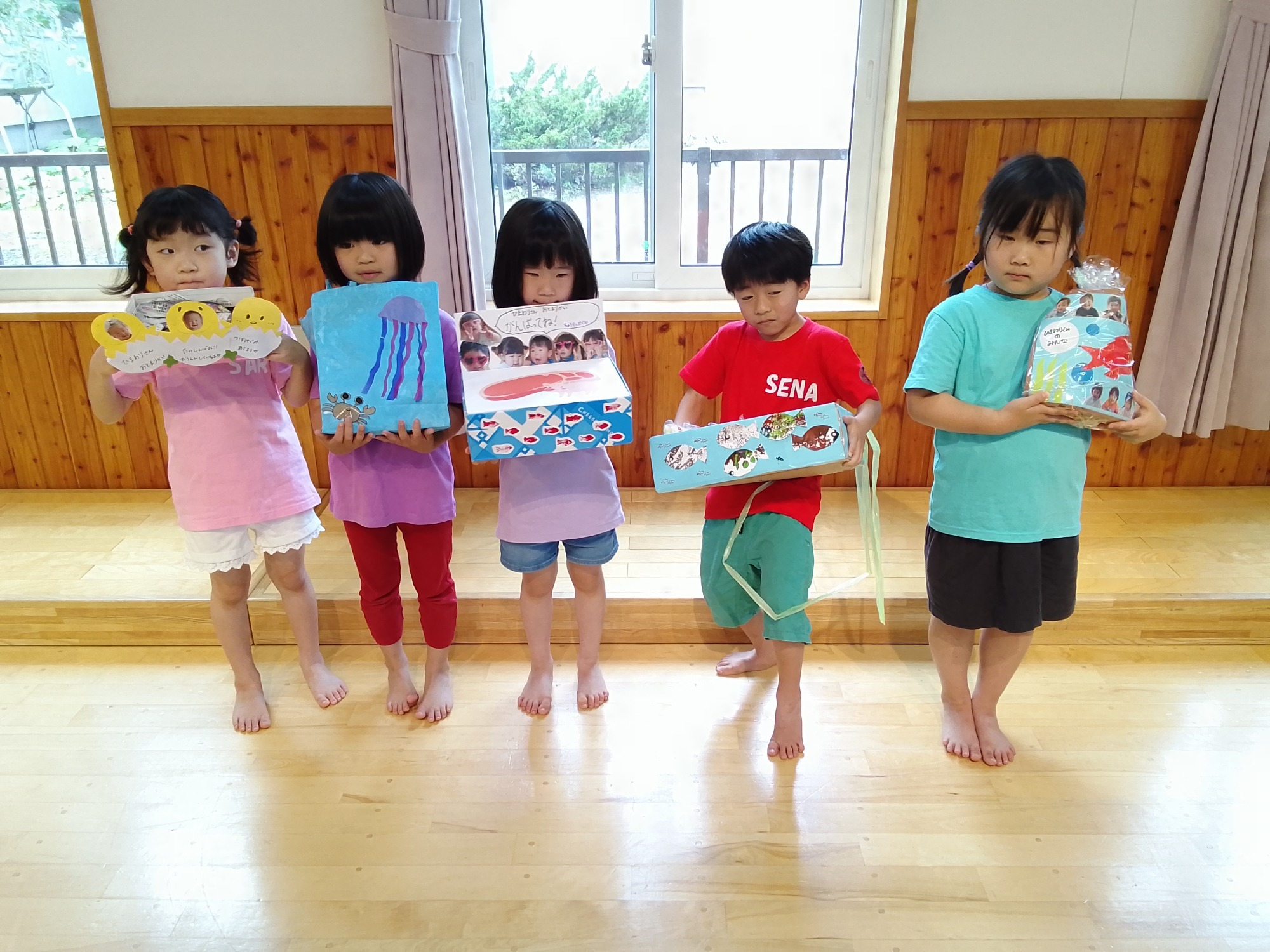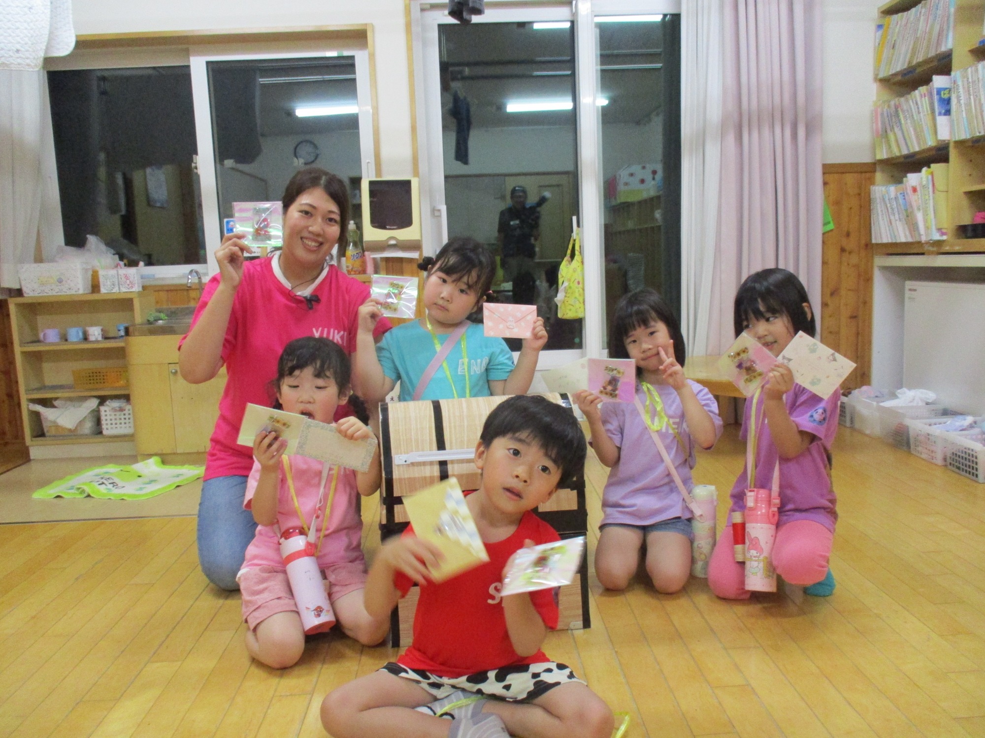 スイカ割りをしているとスイミーから手紙が届きました!スイミーを迎えに公園へ行くと、またまたスイミーからの手紙を見つけ、二つの公園へと駅に行き、最後は保育園へ!スイミーに会うことは出来ませんでしたが、お泊り会を頑張っているみんなへスイミーからプレゼントがありました✨