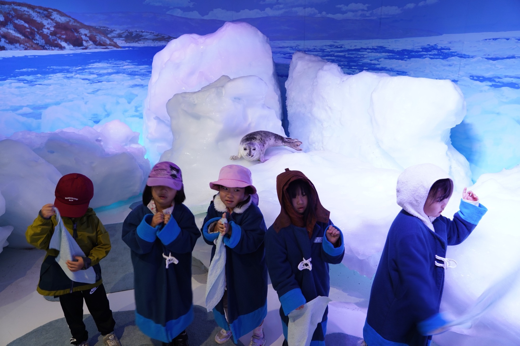 お泊まり会でゲットしたチケットでオホーツク流氷館に行ってきました。ここは氷点下のお部屋で、濡れたタオルを回して凍らせたり、流氷を触ったりしました!