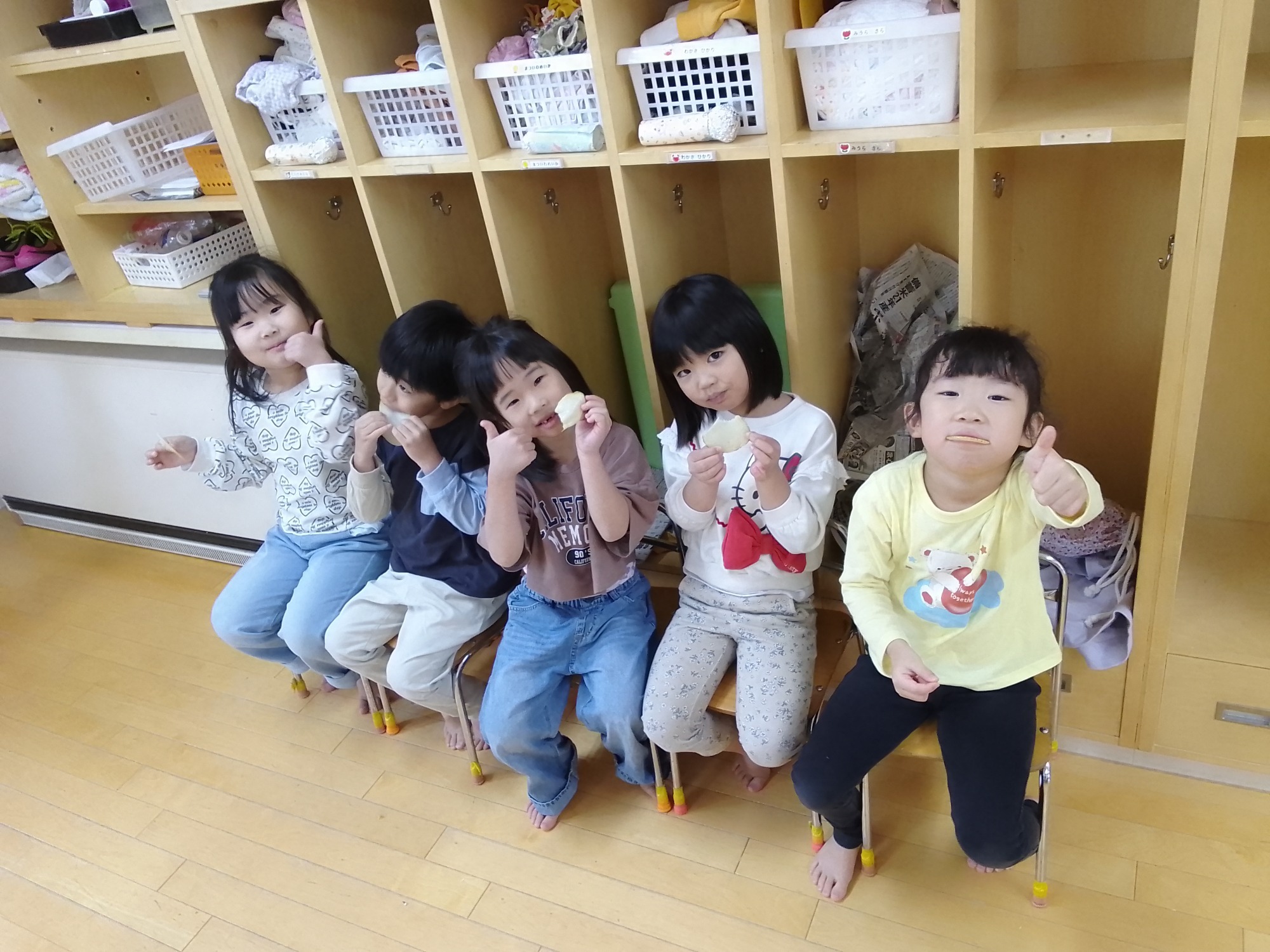 クッキングでは、じゃがいもを使ってポテトチップスを作りました!スライサーの使い方をやってみせると「手を切りそう」と言いながらもスライスされたじゃがいもをみて「わー本物のポテトチップスだ」と喜ぶ子ども達!出来立てのポテトチップスは最高だったようで大満足な子ども達でした!
