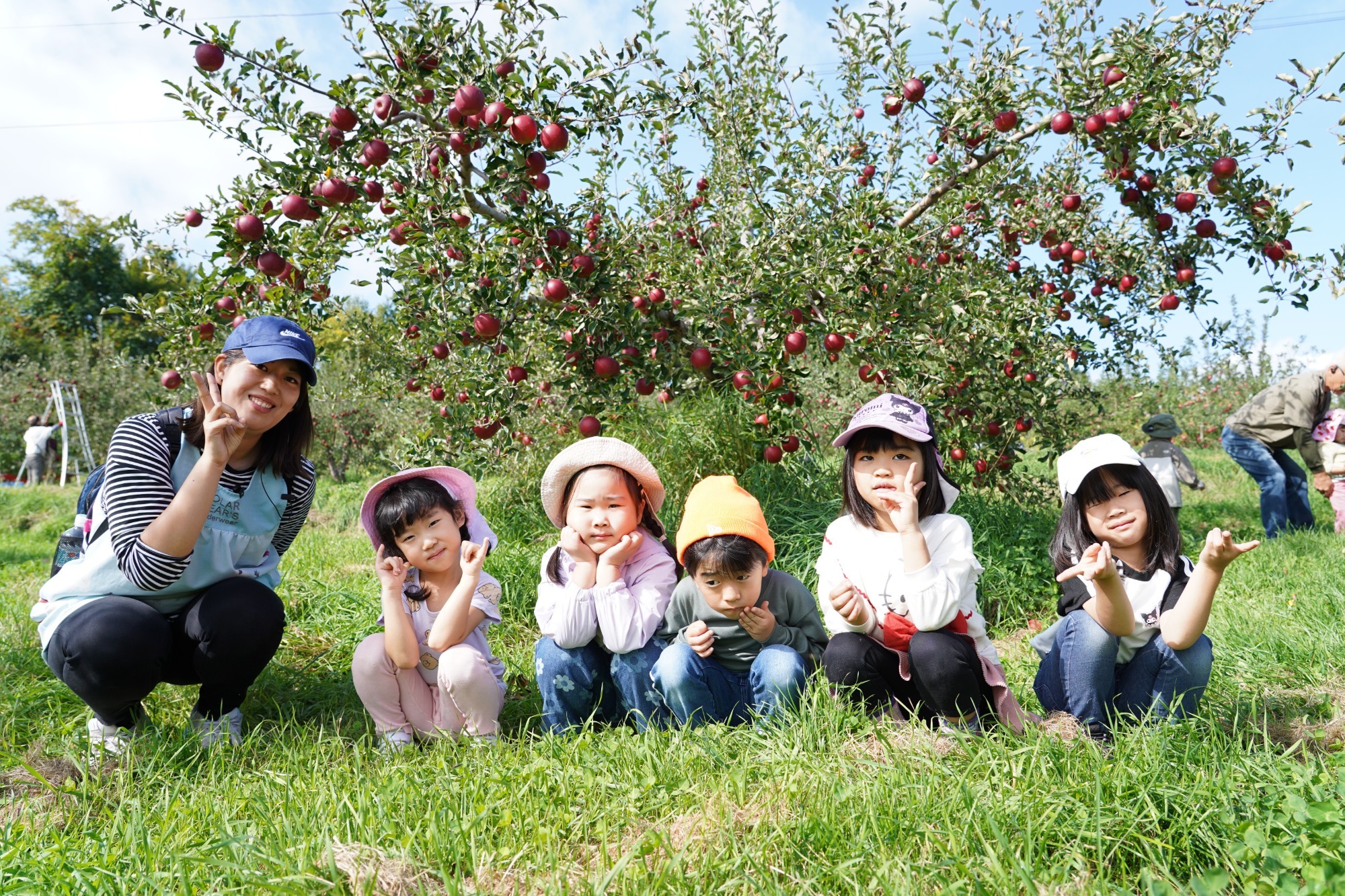 りんご狩りでは、自分達で真っ赤なりんごを選んで採りました🍎お日様がたくさんあたっているりんごが美味しいということを知ると、太陽の位置を見ながら「ここがいっぱいあたっていそう」と観察しながら選んでいました!