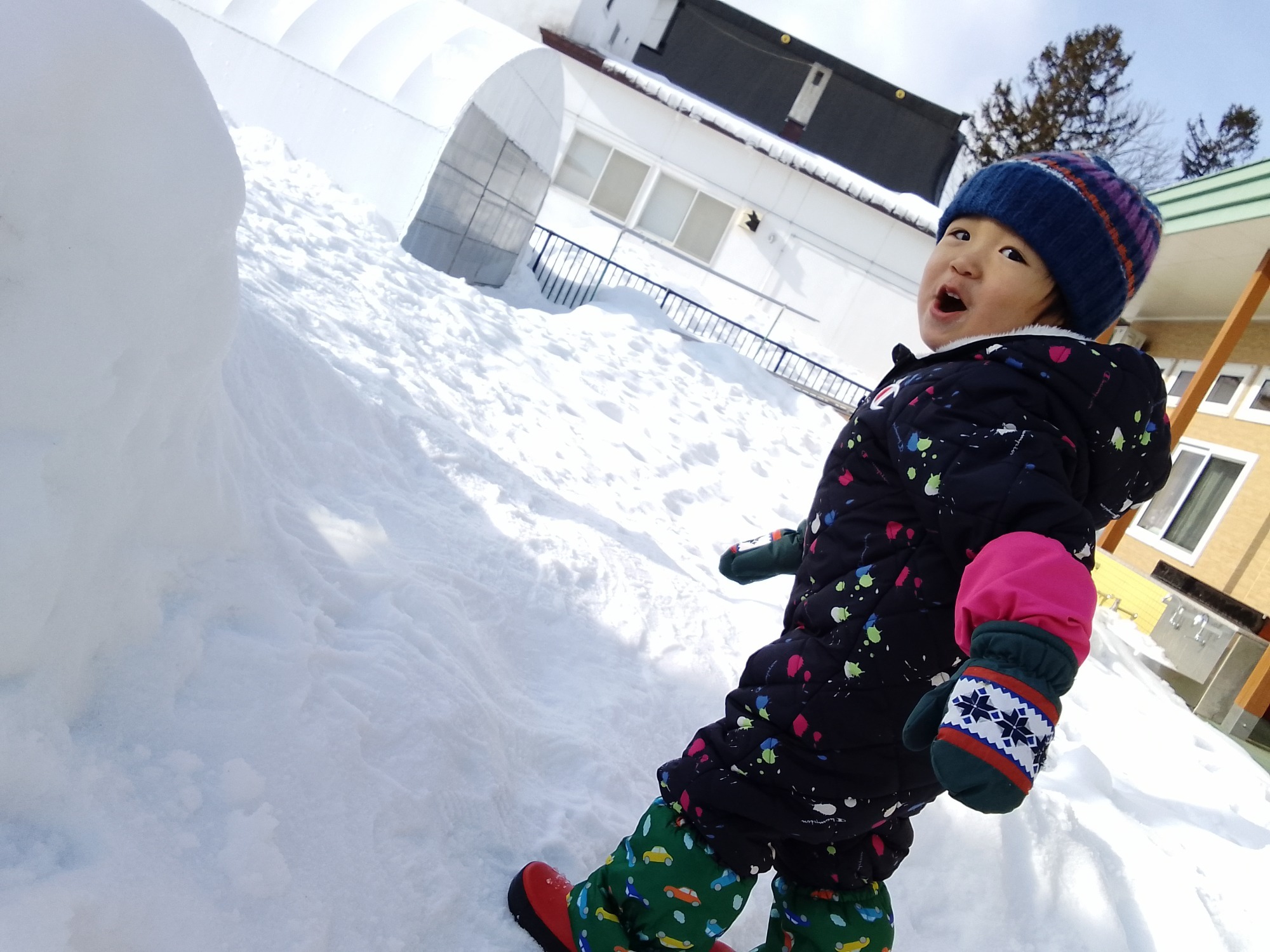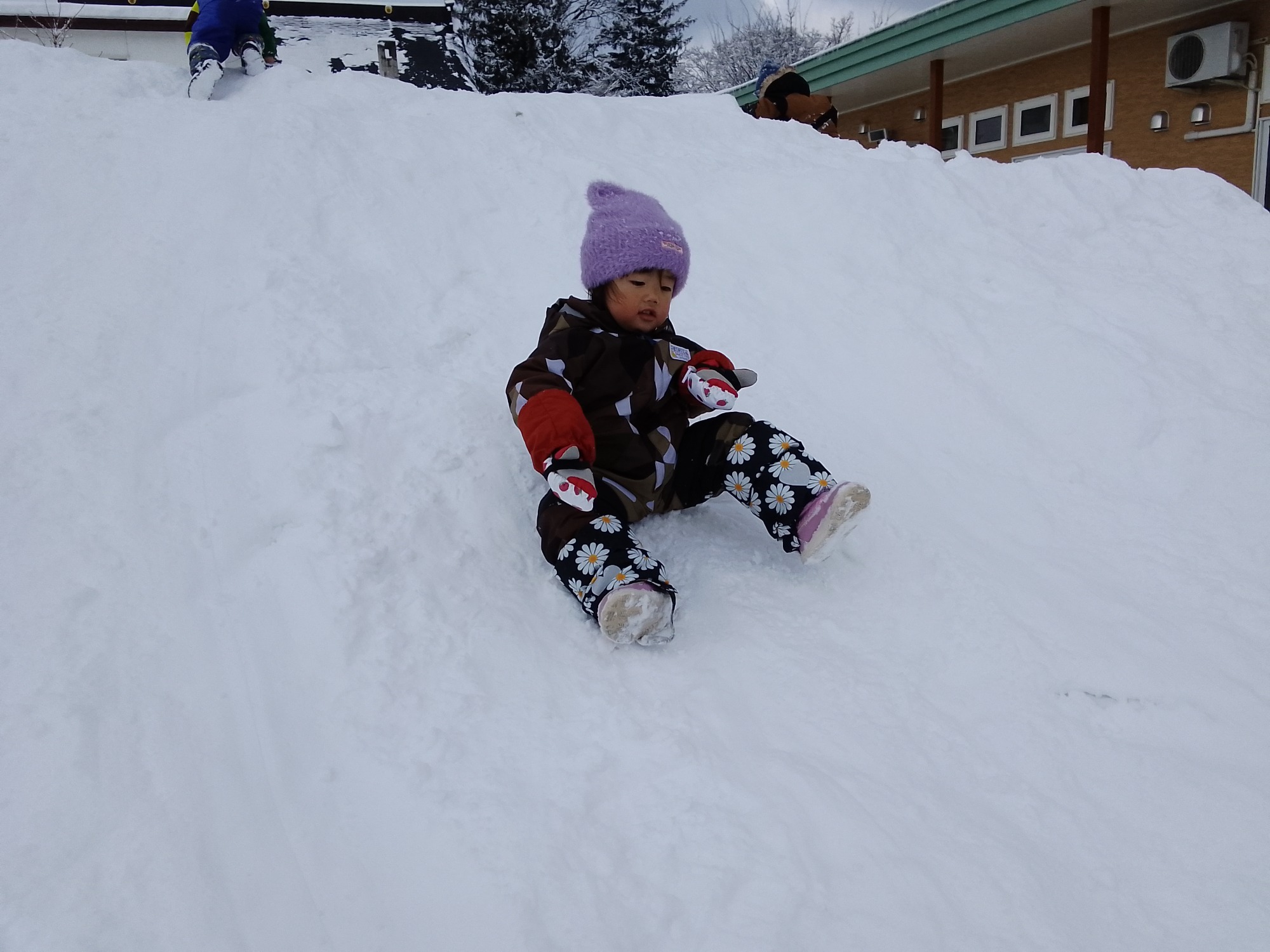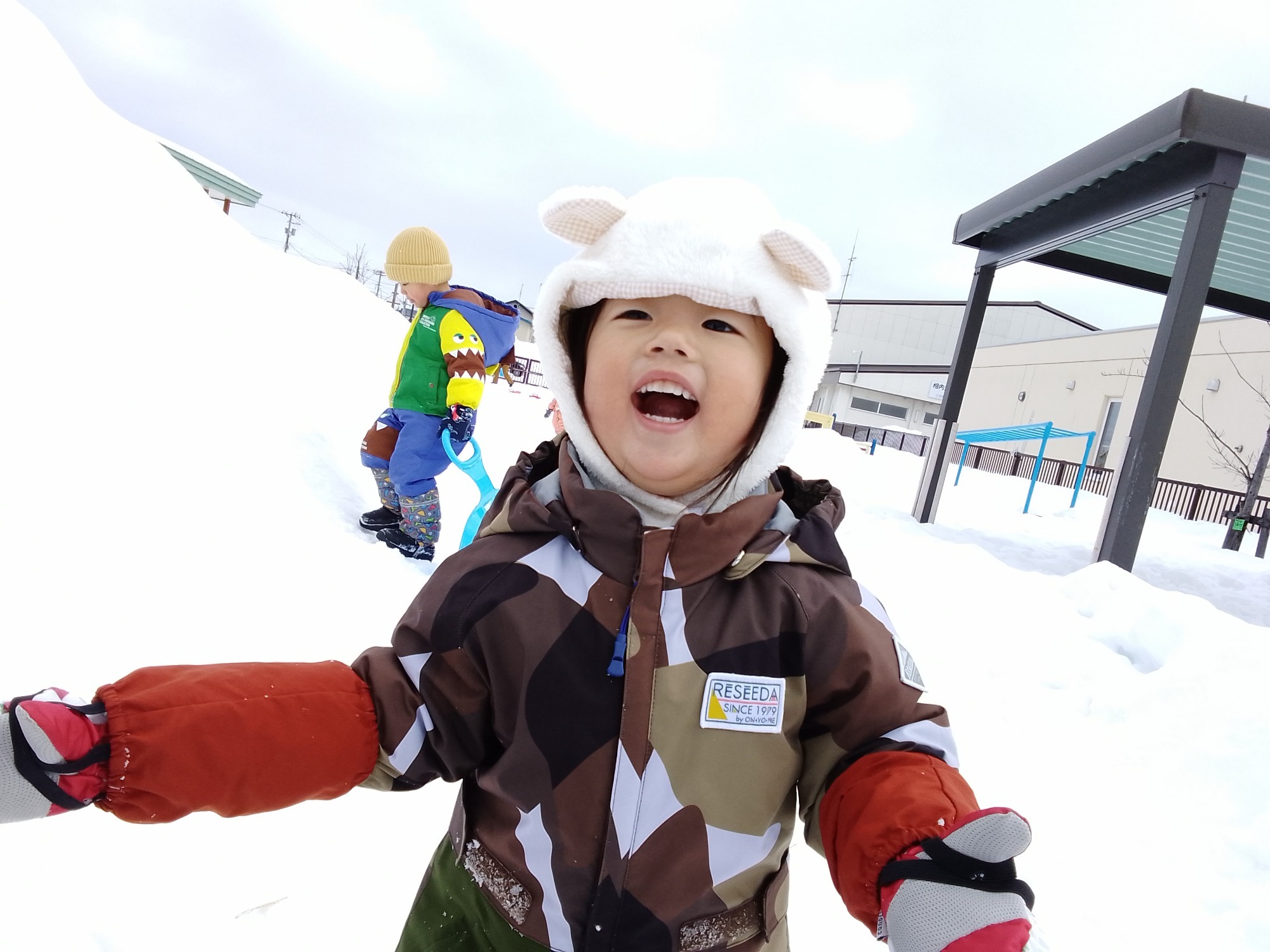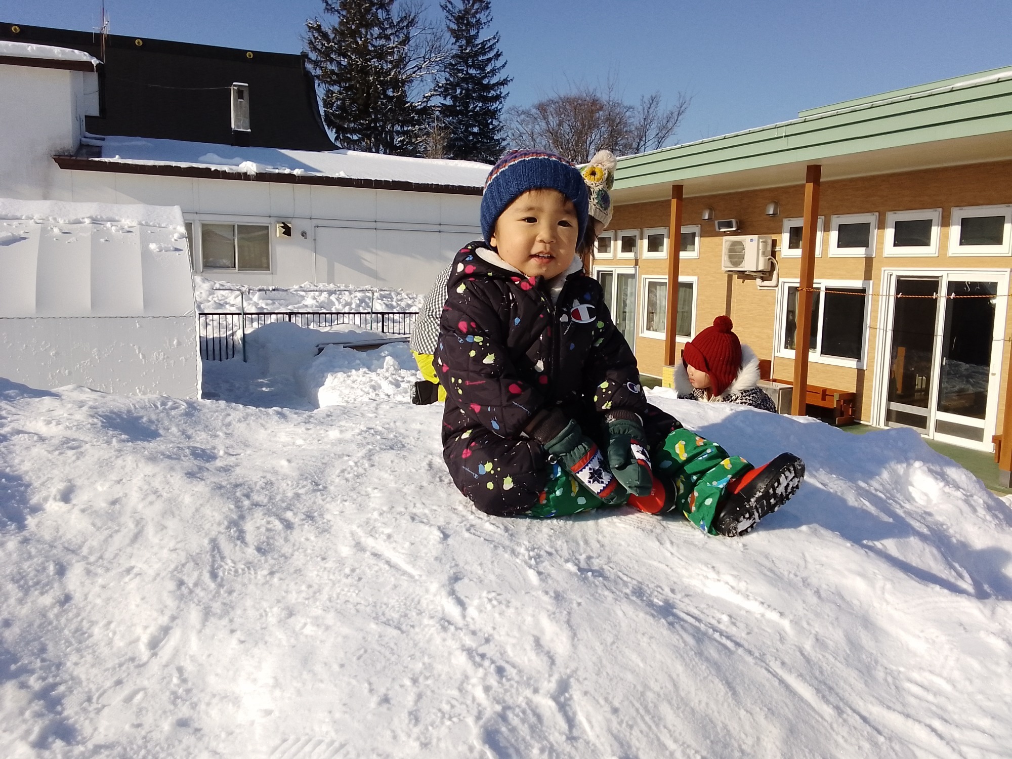 園庭には雪がたくさん積もり、雪山を一生懸命登ってはお尻で滑って、ほぼ毎日のように雪遊びを楽しんでいます⛄