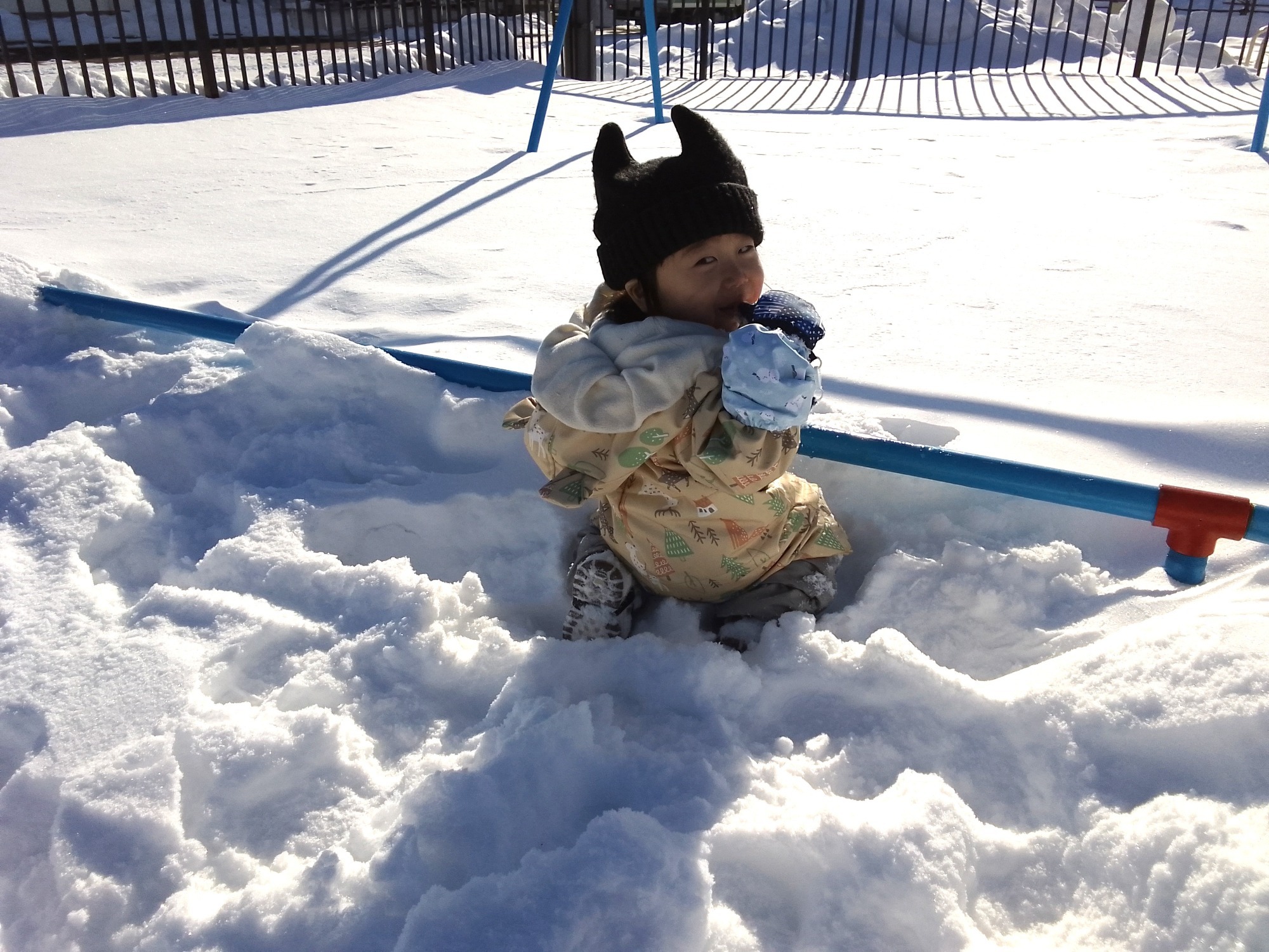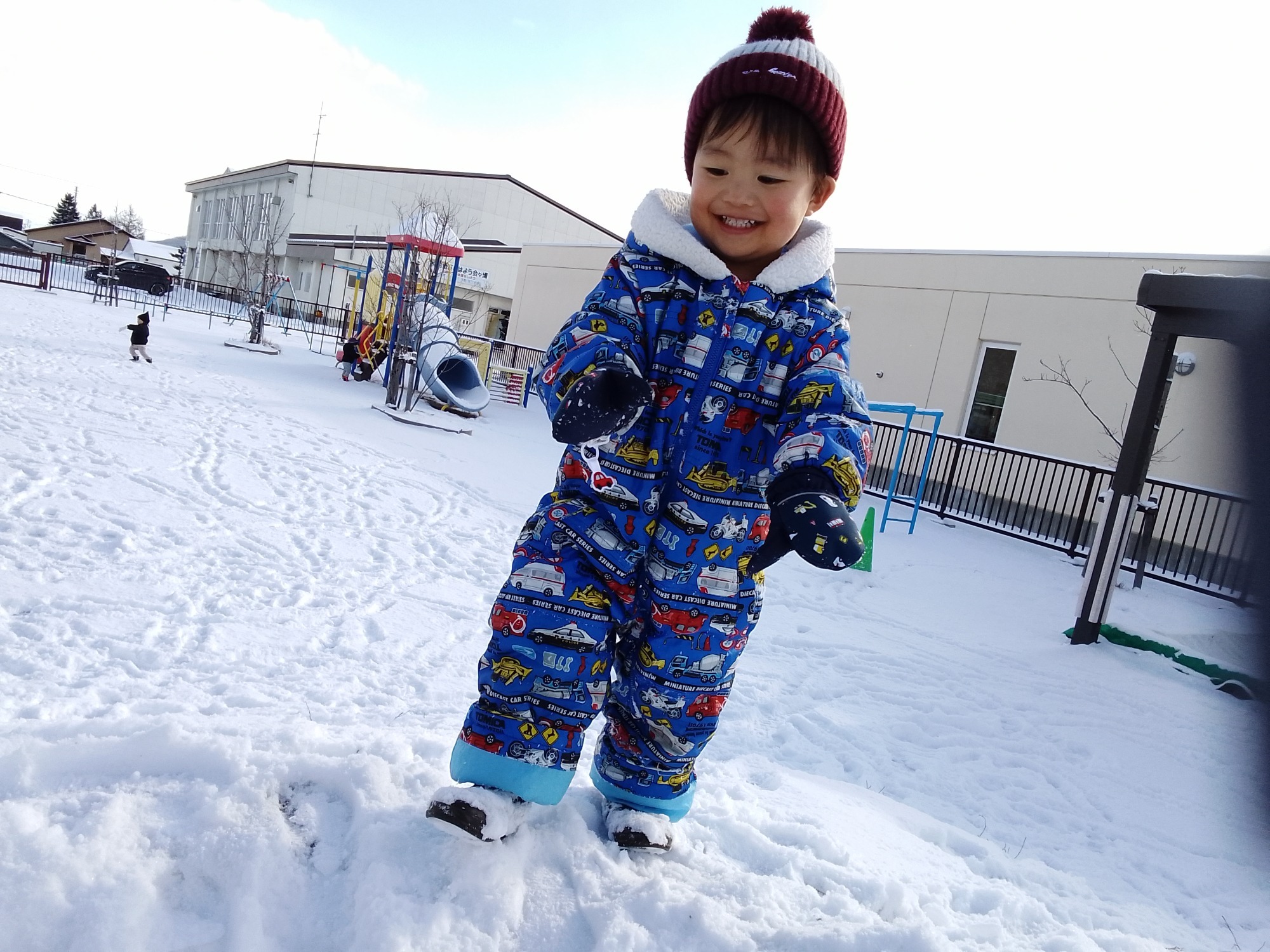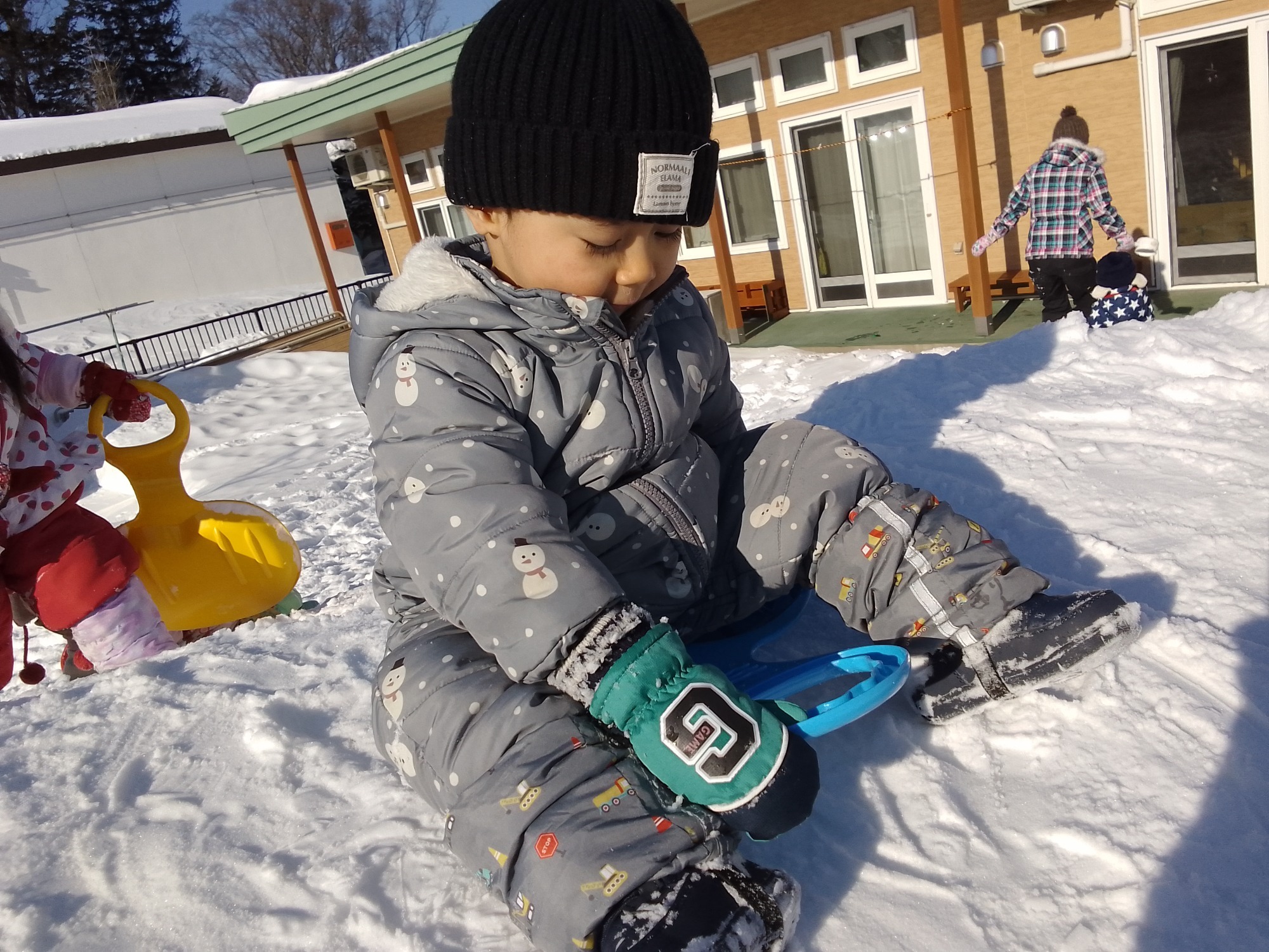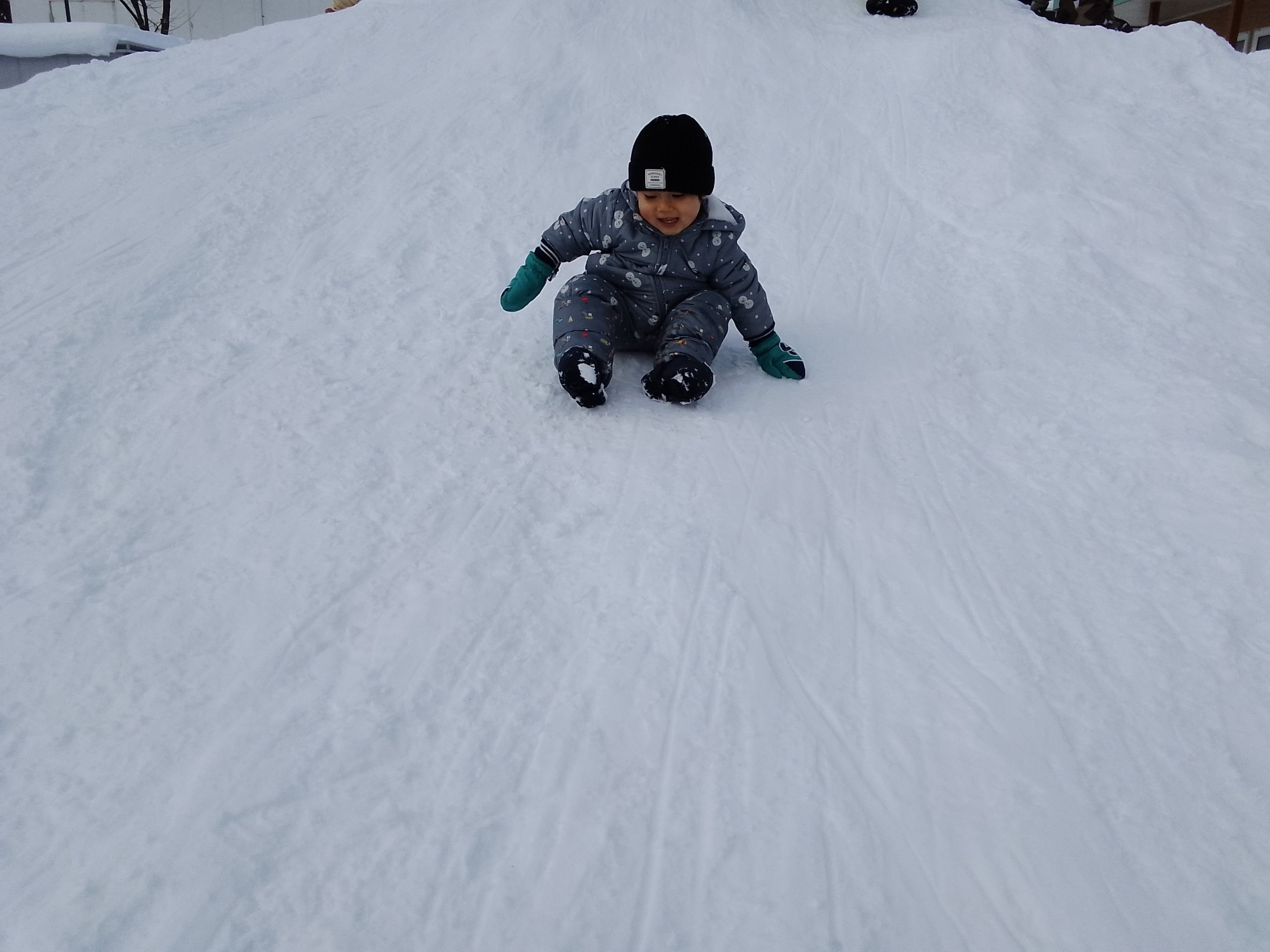 園庭には雪がたくさん積もり、雪山を一生懸命登ってはお尻で滑って、ほぼ毎日のように雪遊びを楽しんでいます⛄