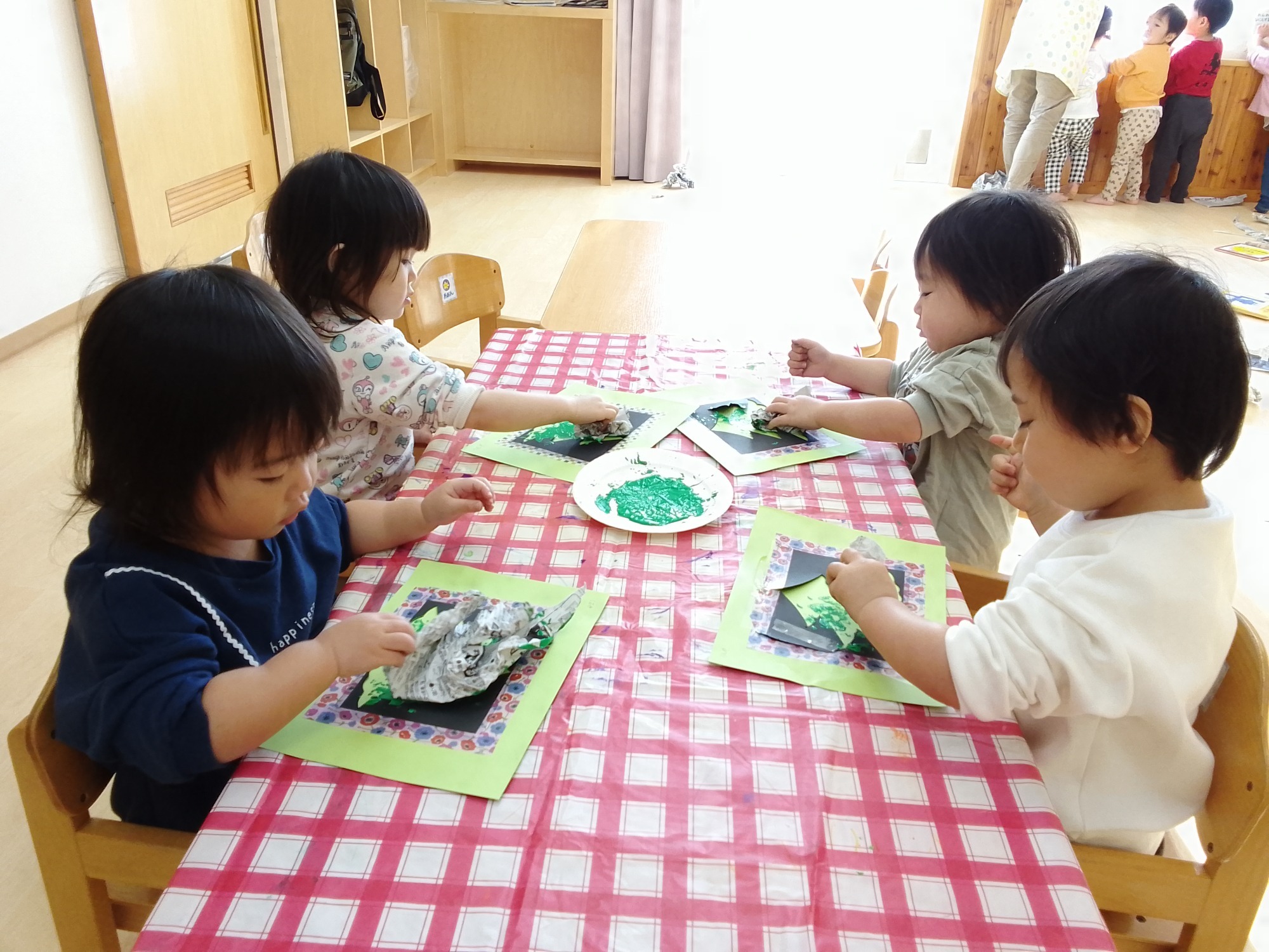 お花見お弁当の日は残念ながら肌寒く、お花を見つける散歩には行けませんでしたが、ちゅうりっぷ組さんと一緒に、手形スタンプで桜を満開に咲かせることが出来ました!!「この手触り気持ちいいな~」と思っているのか手形はせずに絵の具の感触を楽しんでいる子もいました。