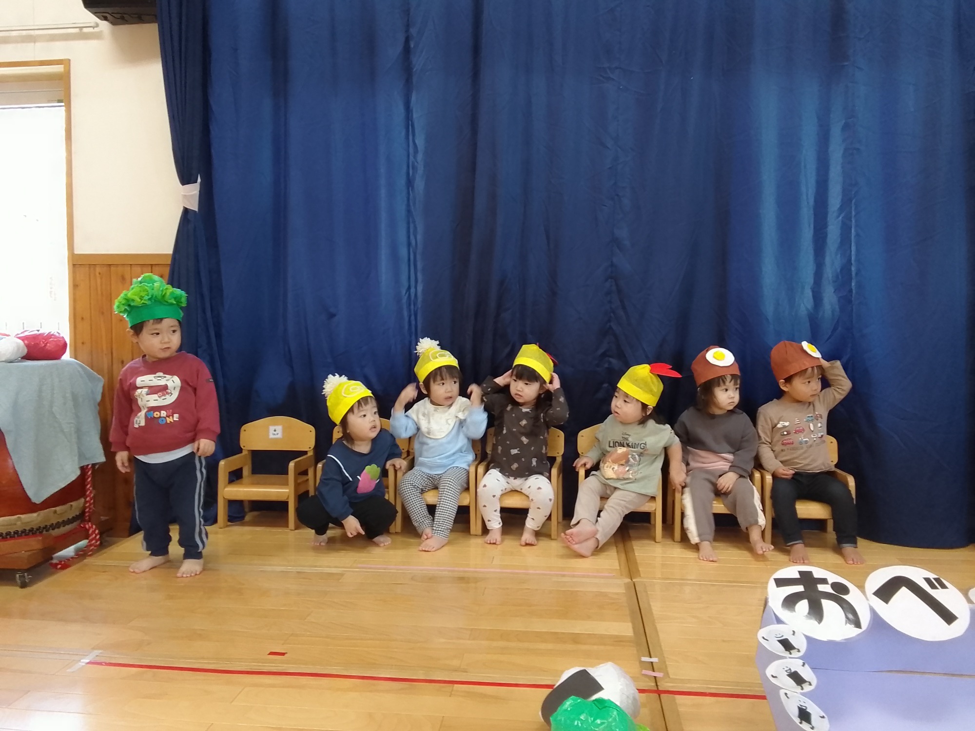 12月はお仕事の関係や体調不良などでお休みする子が多くいました。そのため写真があまり撮れなかったので、11月末に撮った写真で子ども達の様子をお伝えします。11月いっぱいで一人のお友達が退園する事になりました。発表会の練習を一緒にやってきましたが、12月の発表会には残念ながら参加する事が出来ませんでした。しかし、発表会の練習の写真をお部屋に貼ると、その子の名前を呼んでその子のお話をする姿があり、みんなの心の中にはしっかりとお友達の姿がある事が分かりました。楽しい時間を過ごした事は忘れられないですよね❤長くお休みをする子もいるので、お正月は家族でゆっくりとすごして、また保育園で元気に会いましょう!!よいお年をお過ごしください(*^^*)