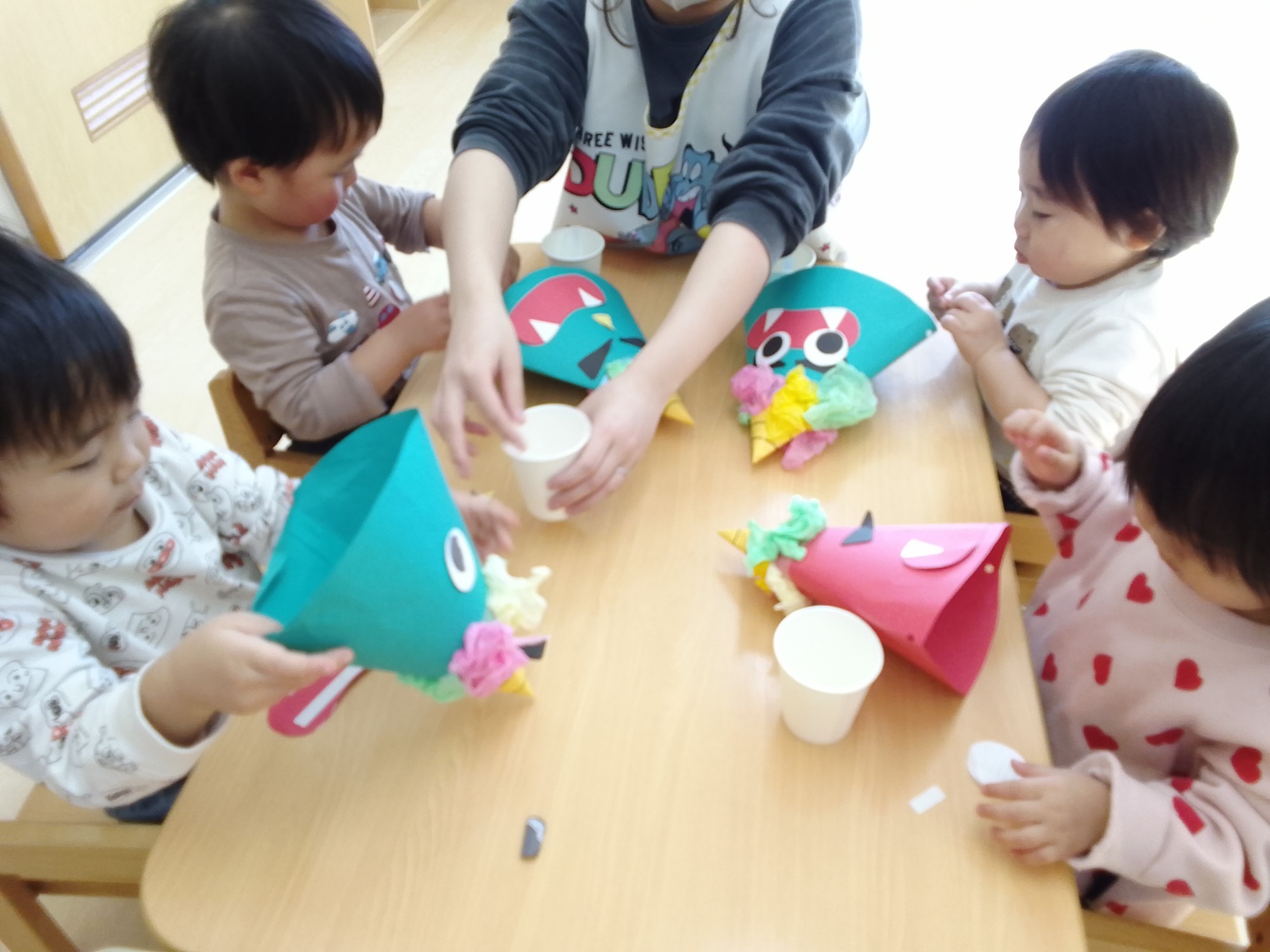 「おにはそと~ふくはうち~」と朝までは元気に豆まきごっこを楽しんでいた子ども達。赤鬼がお部屋に入ってくると…大きな声で泣き出す子、誰が来たの(・・?とじっと見ている子、怖がりながらも豆のかわりのボールをぶつけようとする子もいました。鬼が去ると「こわ~い」と教えてくれる子もいて、思いを言葉で伝えられるようになり成長を感じました。これからもっともっと成長して「鬼なんてやっつけてやるぞ!!」と言う子ども達の姿を見られるのがとっても楽しみです♪