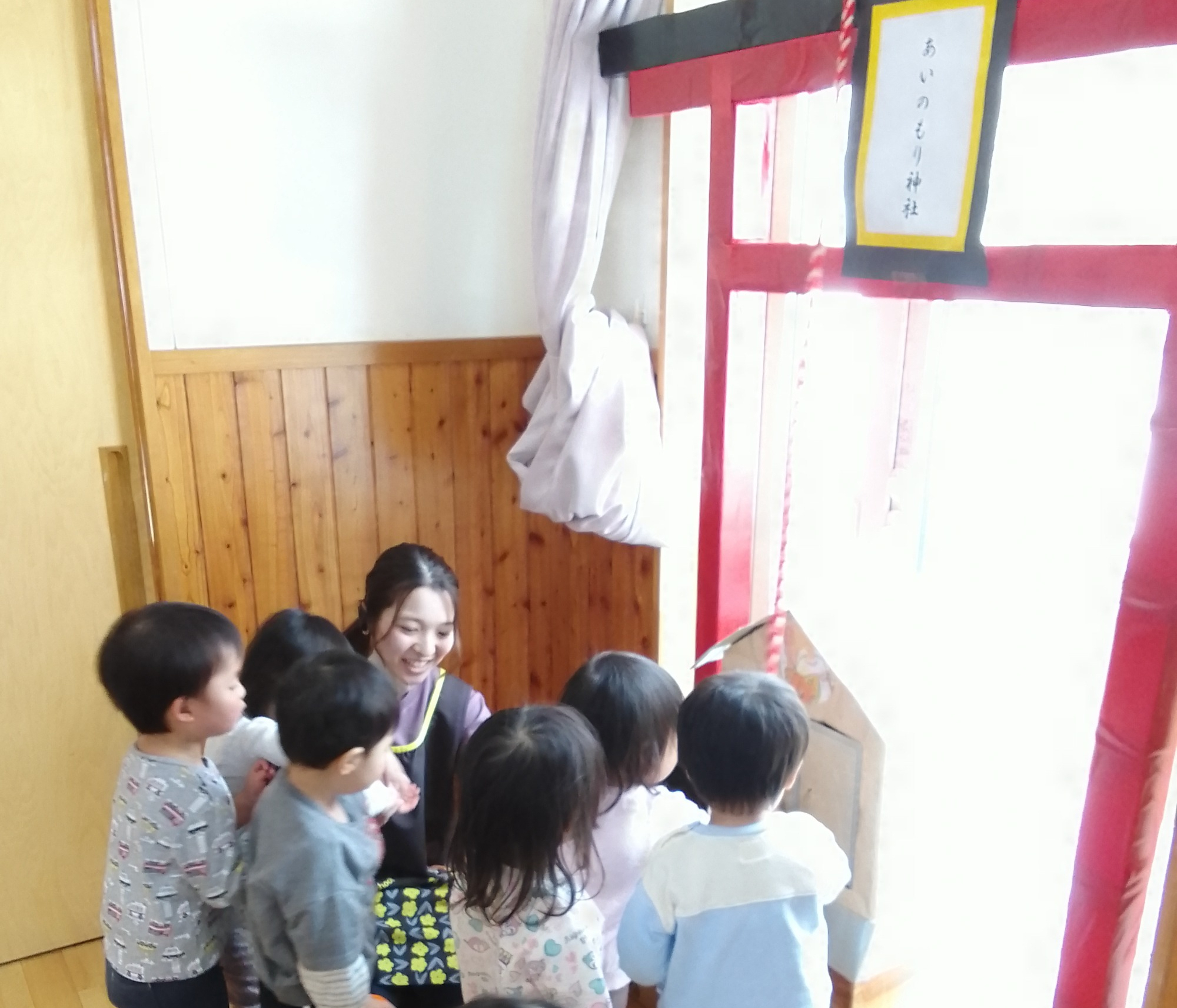 子ども新年会がありました。「あいのもり神社」の鳥居を通って、お賽銭を入れて手を合わせました。年長組さんが伝承遊びの見本を見せてくれましたよ。ひよこさんは真剣な表情で見ていました✨たこ揚げ、紙コップけん玉、コマ回しなど異年齢児でお正月遊びを楽しみました。