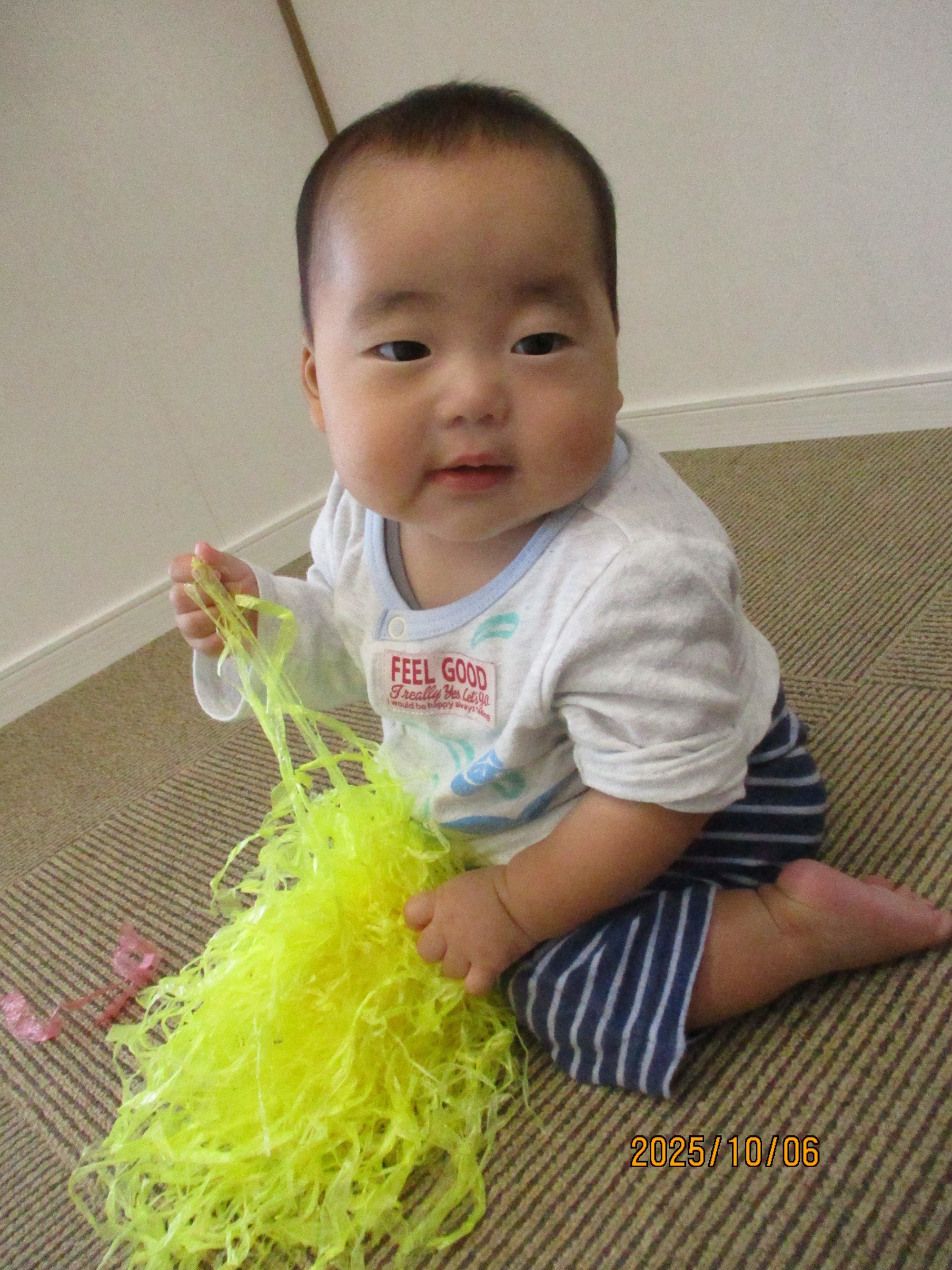活動の中で様々な感触遊びをしていますが、スズランテープ遊びもお気に入りなりす組さんです。シャカシャカとした感触を全身で楽しんでいます。スズランテープのポンポンを両手に持ってフリフリと振ってみたり、スズランテープのトンネルから顔を出し上手にハイハイや歩行でくぐったりする姿がとてもかわいいです♪これからも様々な素材に触れて、素材の感触を楽しみながらたくさん遊びたいと思います。