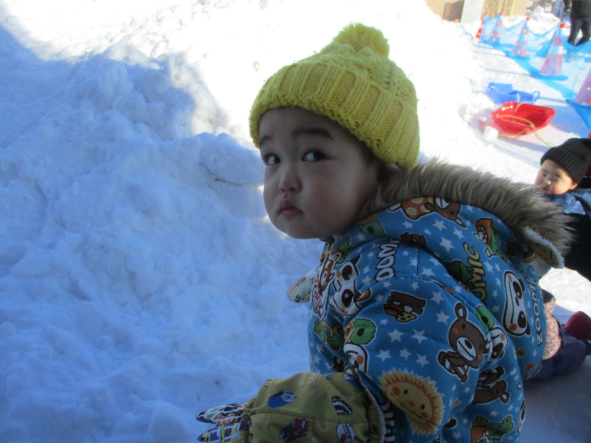 自分で雪山の斜面をはいはいしたり歩いたりして上まで登ろうとする姿があり、逞しいなぁと感じています。雪山の上からそり滑りをすると、ちょっとびっくりした表情の子や「おっ!おっ!」と言いながら乗っている子、滑り終わると笑顔を見せる子と色々な反応が見られました。