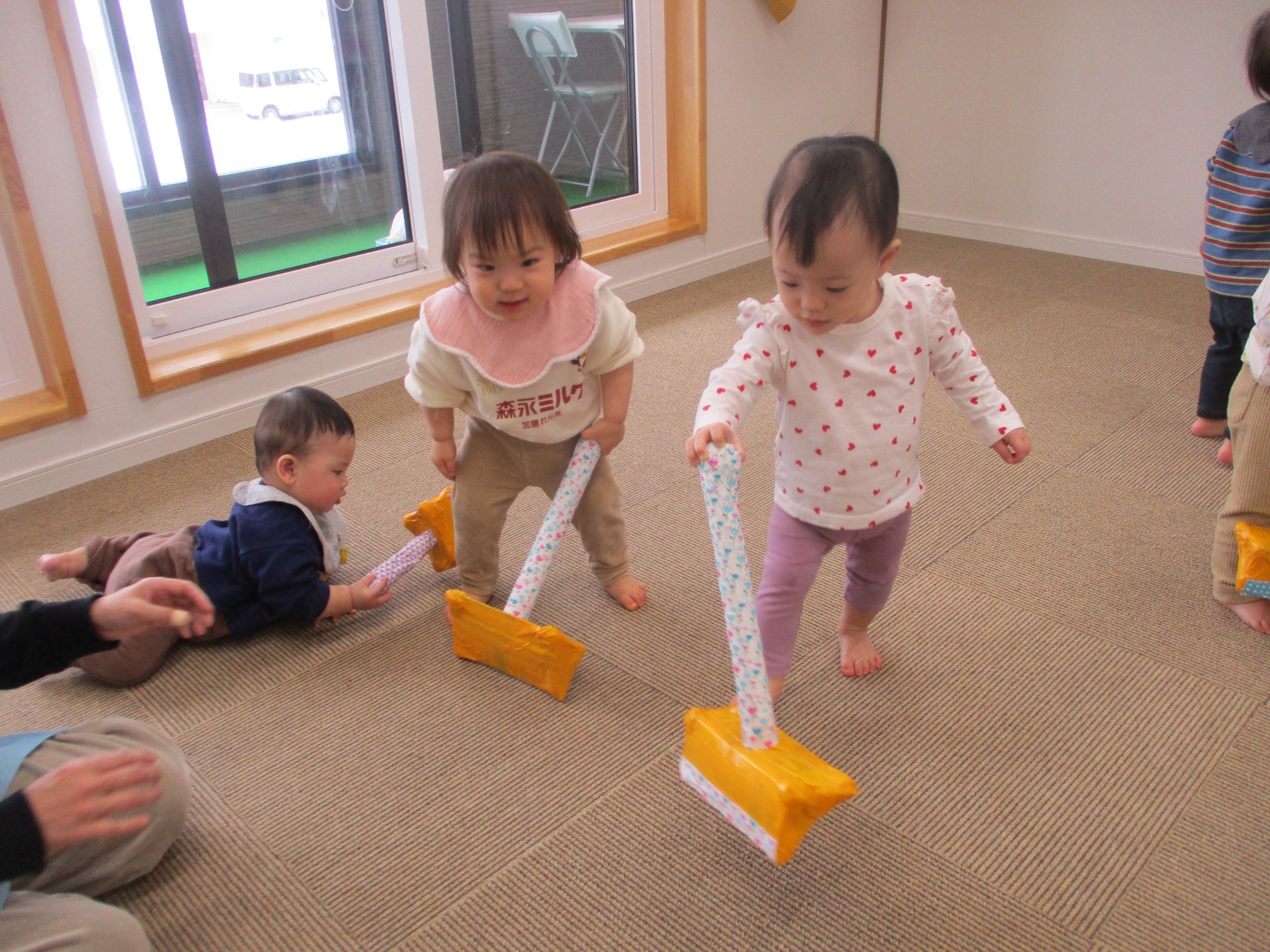 手作り玩具の掃除機を使って、みんなでお掃除ごっこをして遊びました。日頃から、保育者がお部屋の掃除機掛けをしている所を楽しそうに見ている子ども達なので、掃除機の玩具を見てみんなとても大喜びでした。スズランテープをゴミに見立てて、お掃除開始です。いつも保育者や保護者が掃除をしている姿を見ているからか自分で掃除機を前後に動かしたり、壁や部屋の隅まで掃除機掛けをする子もいて驚きました。大人の姿をよく見ていますね。子ども達の好きなことを遊びに繋げて、遊びを楽しむことが出来て良かったです。これからも、様々なごっこ遊びを楽しんでいきたいと思います✨