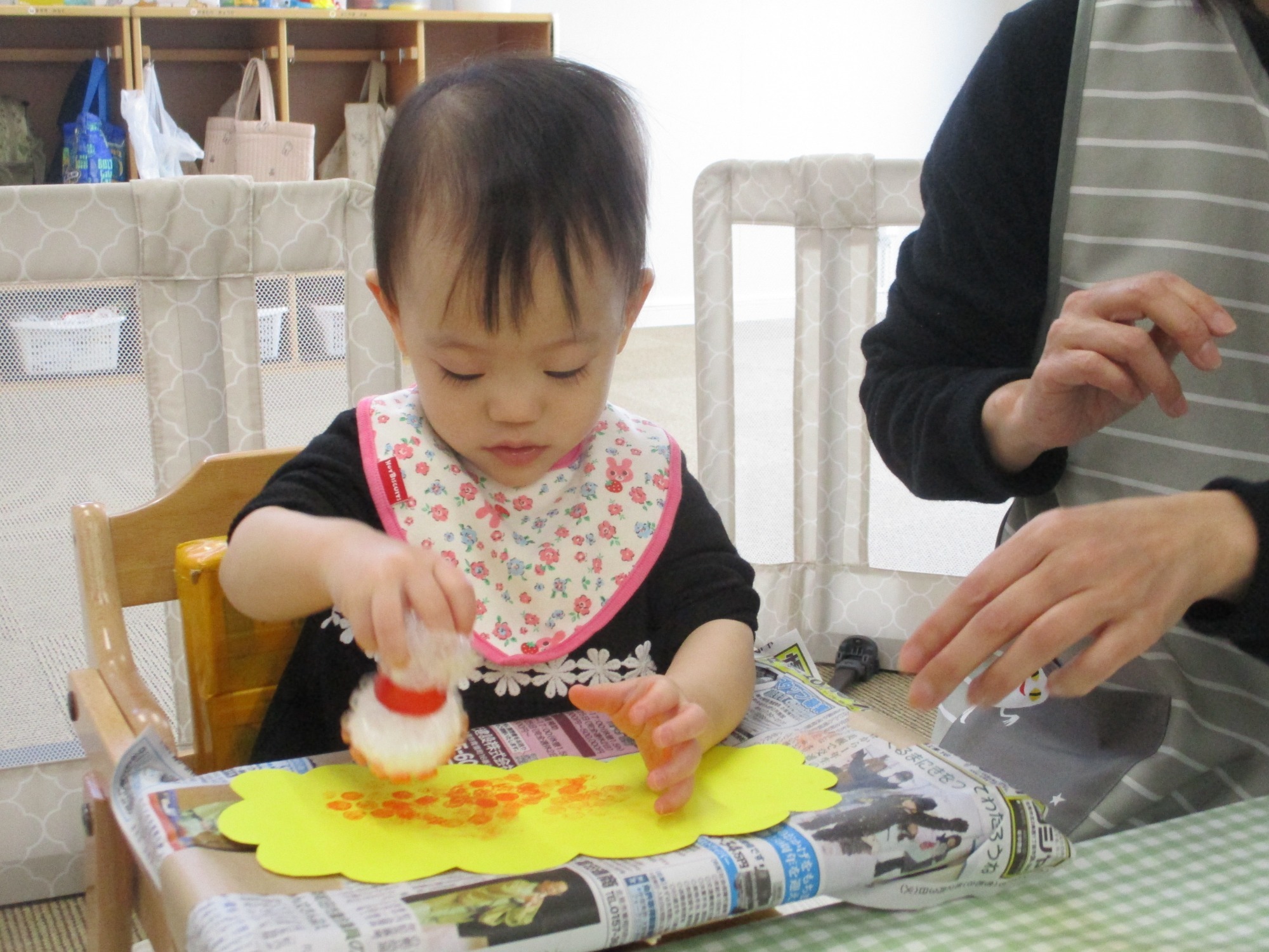 りす組さんも4月から製作活動を行っています!主に手形足形スタンプや絵の具を使って製作を楽しんでいますよ!なんだろう?と不思議そうに絵の具などを見つめる子ども達ですが、保育者が手を添えて一緒に製作をすることで、感触や色を楽しみながら取り組んでいます★これからシール貼りやクレヨンなど様々な素材を使用しながら、製作活動をどんどん楽しんでいきたいと思います!
