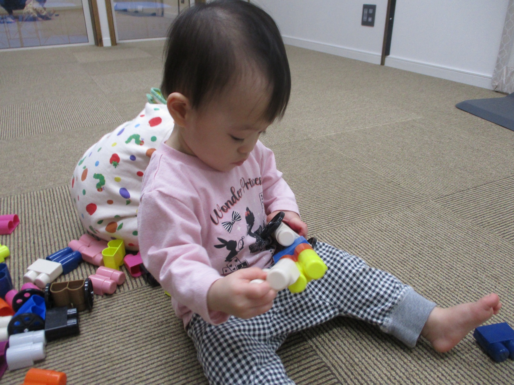 布遊びでは、大きな布を床に敷いてその上に座り、紙コップに布を入れてジュースに見立てて、みんなでピクニックごっこをしました。ぽかぽかと暖かい太陽の日差しを浴びながら、みんなで紙コップを持って何度も乾杯をしました。飲む真似や食べる真似を楽しむ子も増えてきましたよ。また、ブロックを上手に繋げたり、掃除機に見立ててお掃除をしてみたりと、想像力を膨らませながら遊びを楽しんでいます。