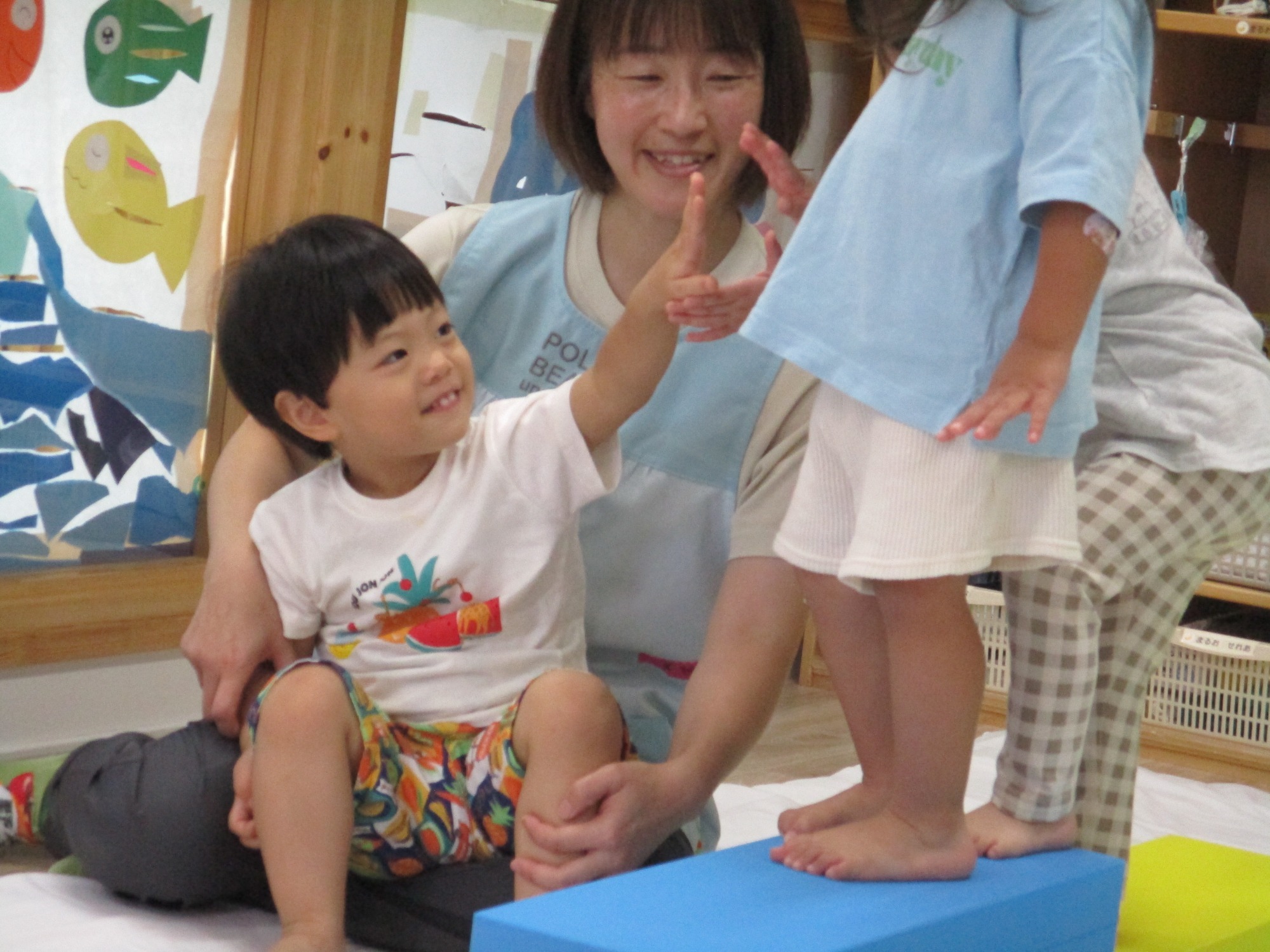 うさぎ組は、床に貼ってあるサメとワニの絵を飛び越えて、足形マークに片足や両足を合わせて通り、その後は積み木を2つ重ねた台に登り、ジャンプをして飛び降りる。という運動でした。みんな腕や足首、ひざを使って上手にジャンプをしていましたよ。体を動かすことが大好きなうさぎさんは、ダイナミックに楽しんでいましたね!