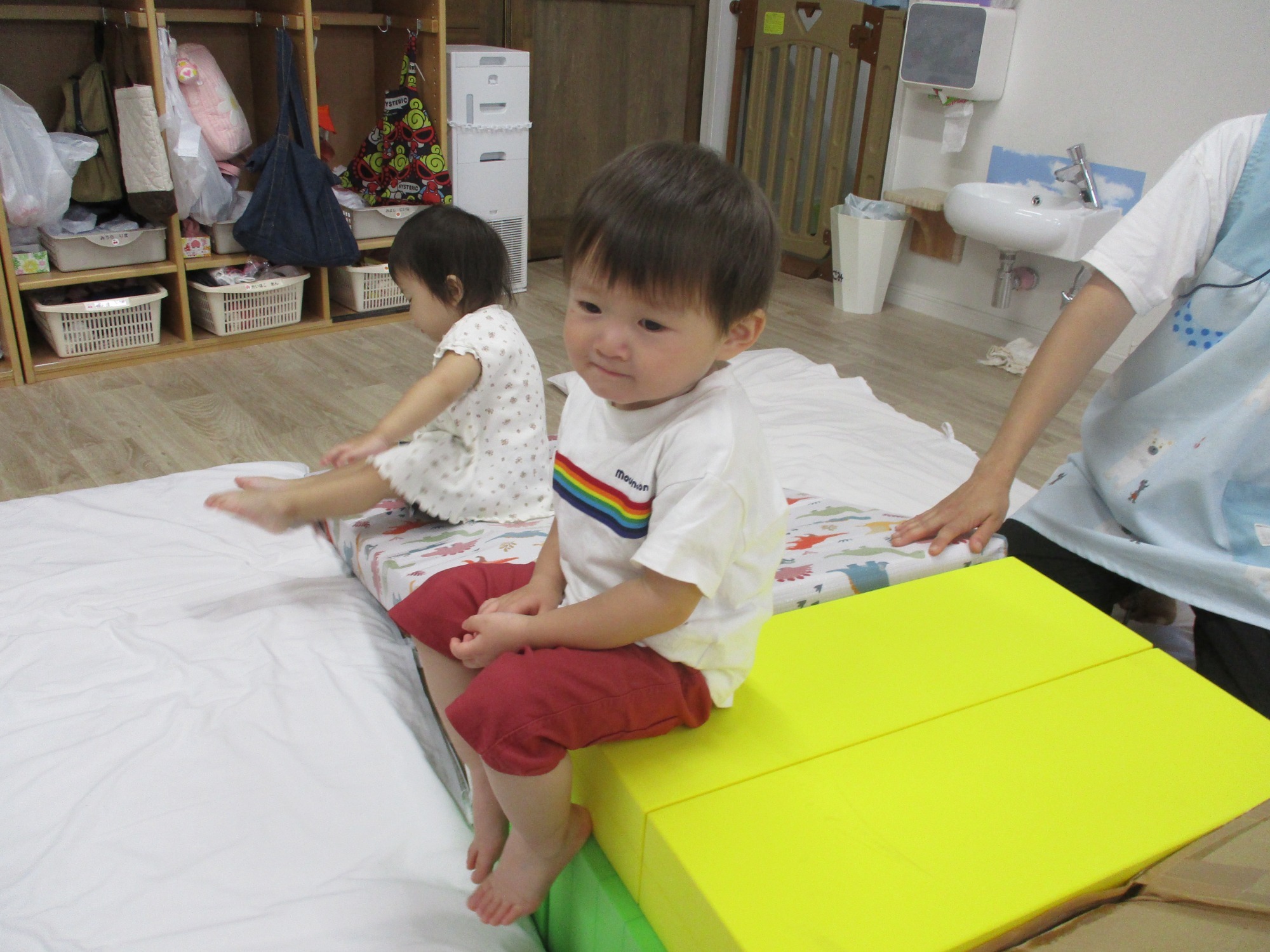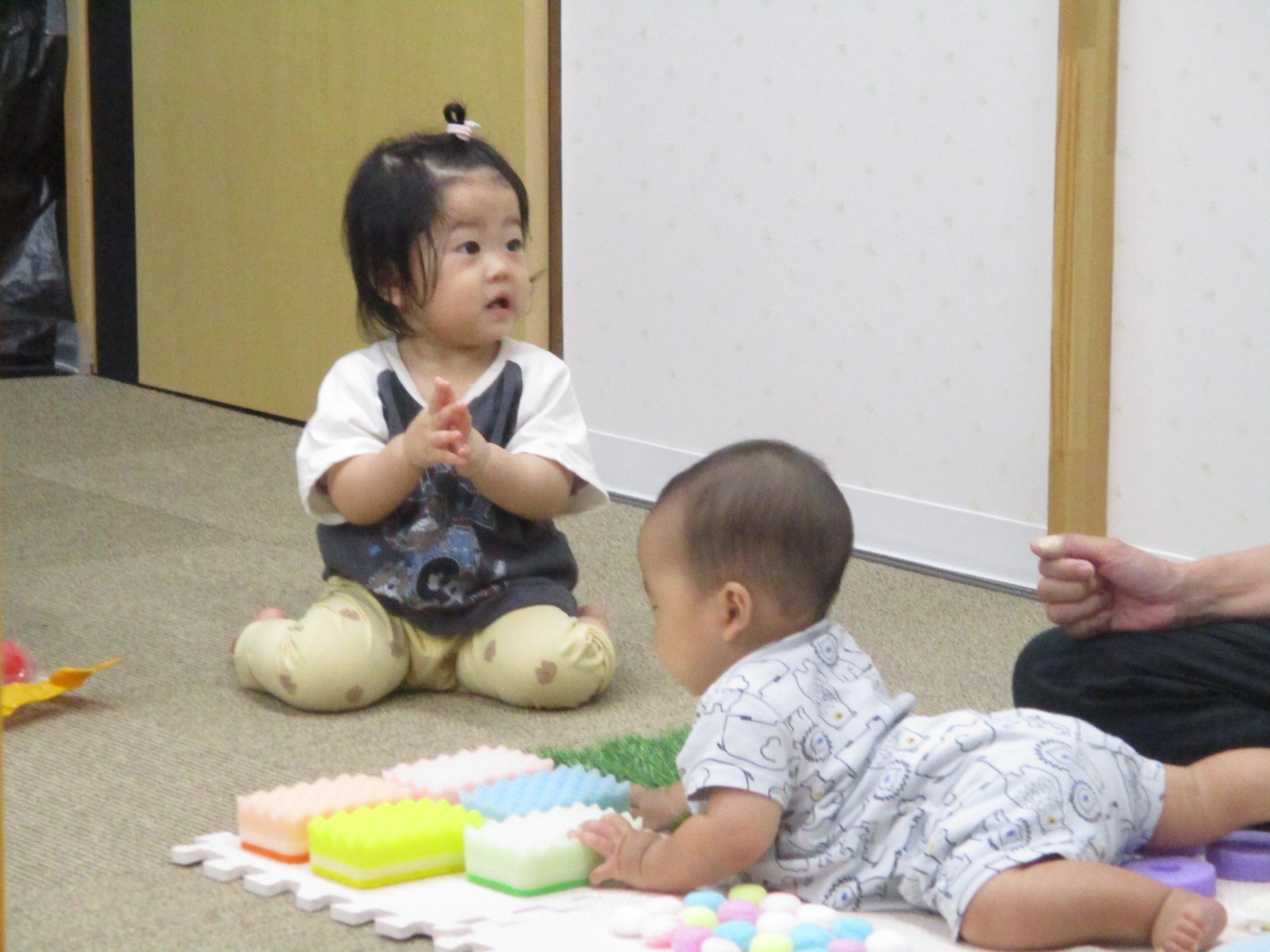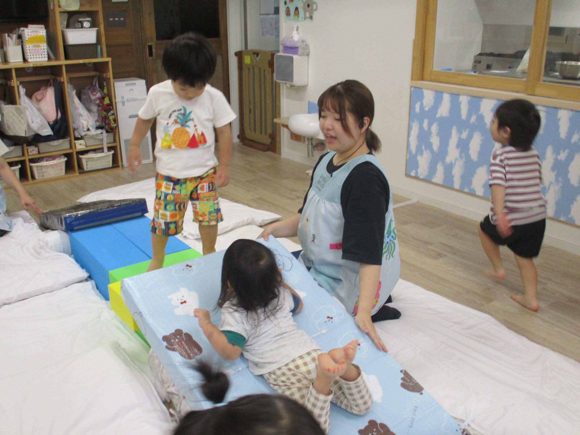 4月は4名の新しいお友だちをお迎えしました。進級したお友だちも含め、みんな新しい環境に少しずつ慣れ、好きなおもちゃを手に取り保育者やお友だちと関わりながら、楽しく遊ぶ姿が見られるようになりました。りす組さんは自分から玩具を目指してずりばいをしたり、音が鳴るおもちゃを振ってカラカラと鳴らしながら笑顔を見せてくれたりと、とても穏やかに過ごしていました。こあら組さんは昨年2階にはなかった新しい玩具に興味を示し遊び方を色々と模索したり、暖かかった日も多かったので裏の公園まで手を繋ぎ歩いて行ったりして楽しんでいました。うさぎ組さんは粘土・折り紙・ひも通しなどで遊んだり、ボール・風船遊びやわらべ歌などで沢山身体を動かしたりして楽しんでいました。また、りす組やこあら組のお友だちにも興味津々で、頭をなでなでしたり優しく声を掛けたりしてくれていましたよ。