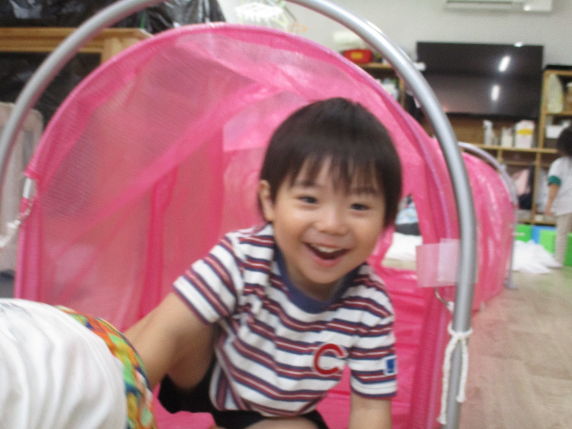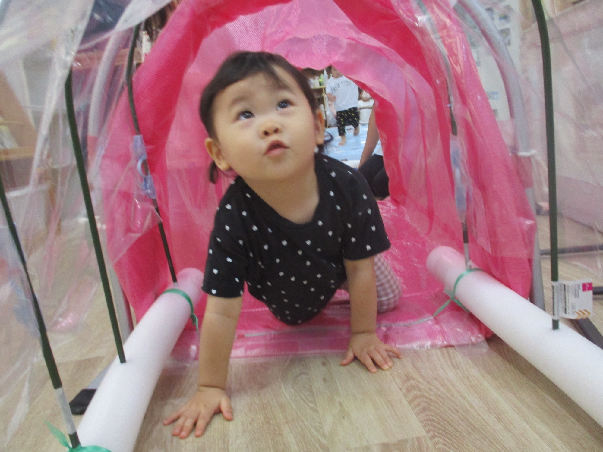 こあら組は、お花が書いてあるスタートからバランスを取りながら積み木を渡り、トンネルをくぐって戸板の坂道へ。みんなスタート位置のお花を目指して戻って来ては、おっとっと~と上手にバランスを取りながら一歩一歩進んでいました。トンネルでは入り口からのぞくと、途中まで進んでいるお友だちが振り返ってにこっと微笑んでくれましたよ!