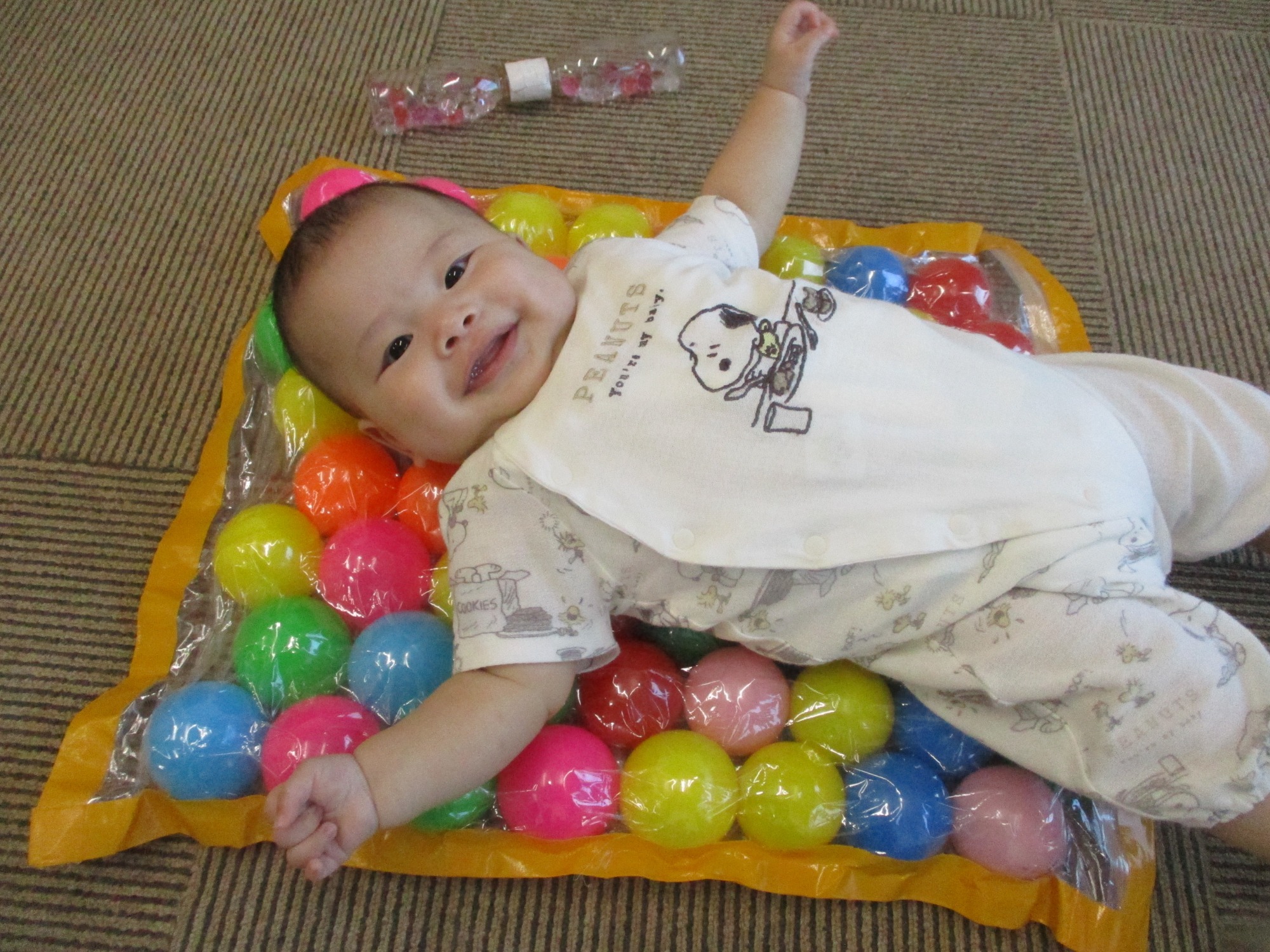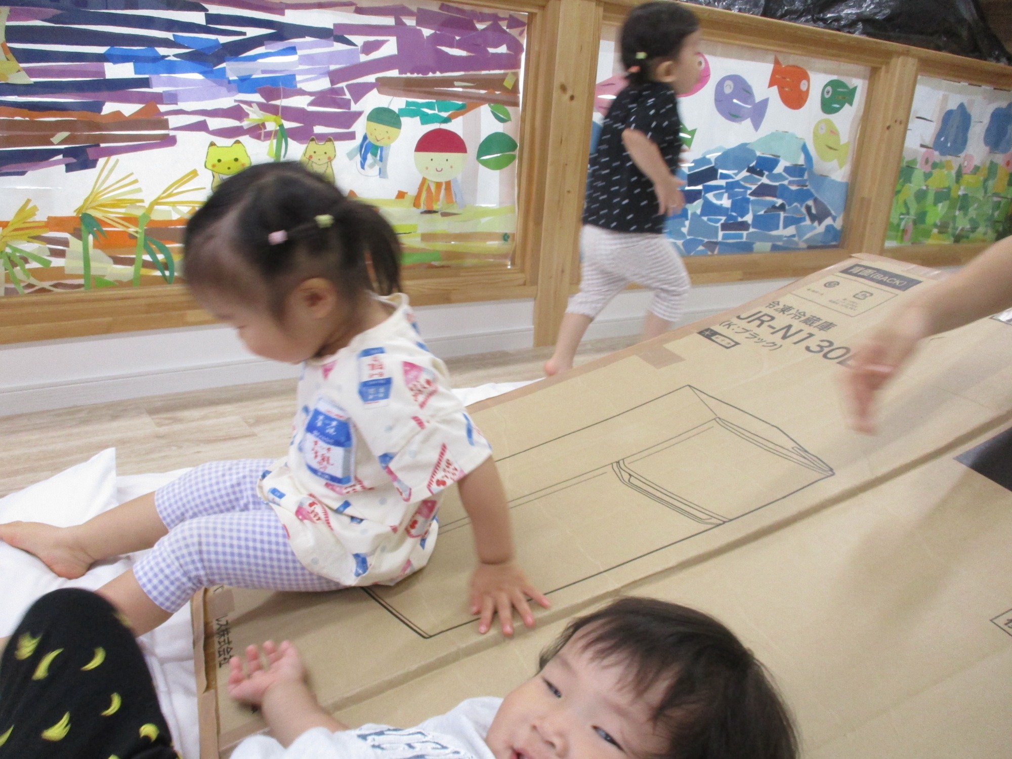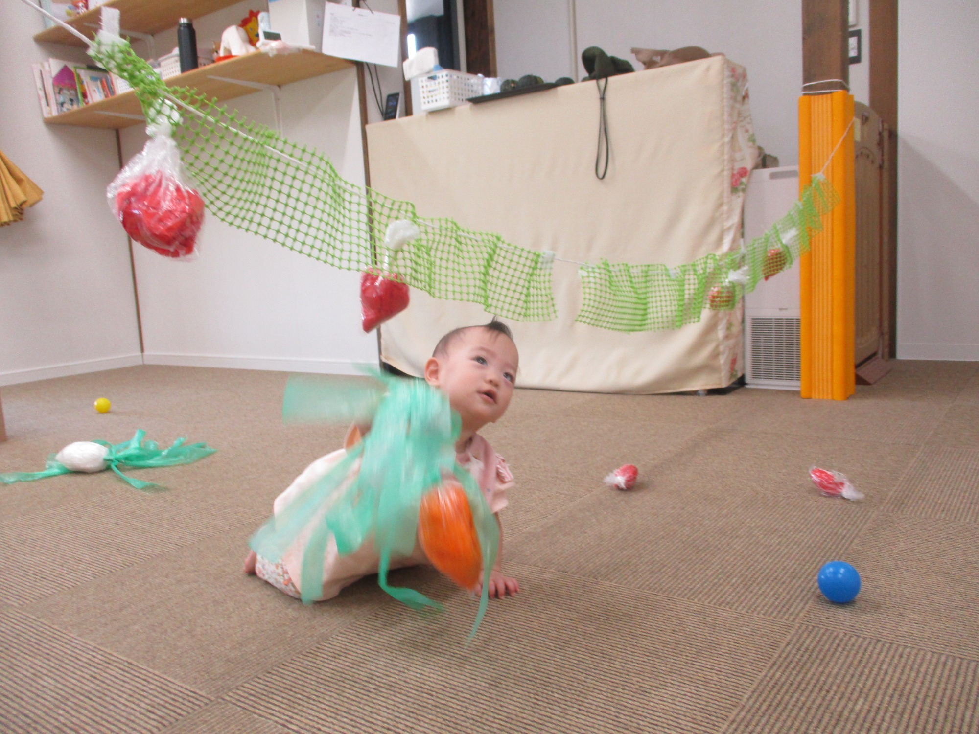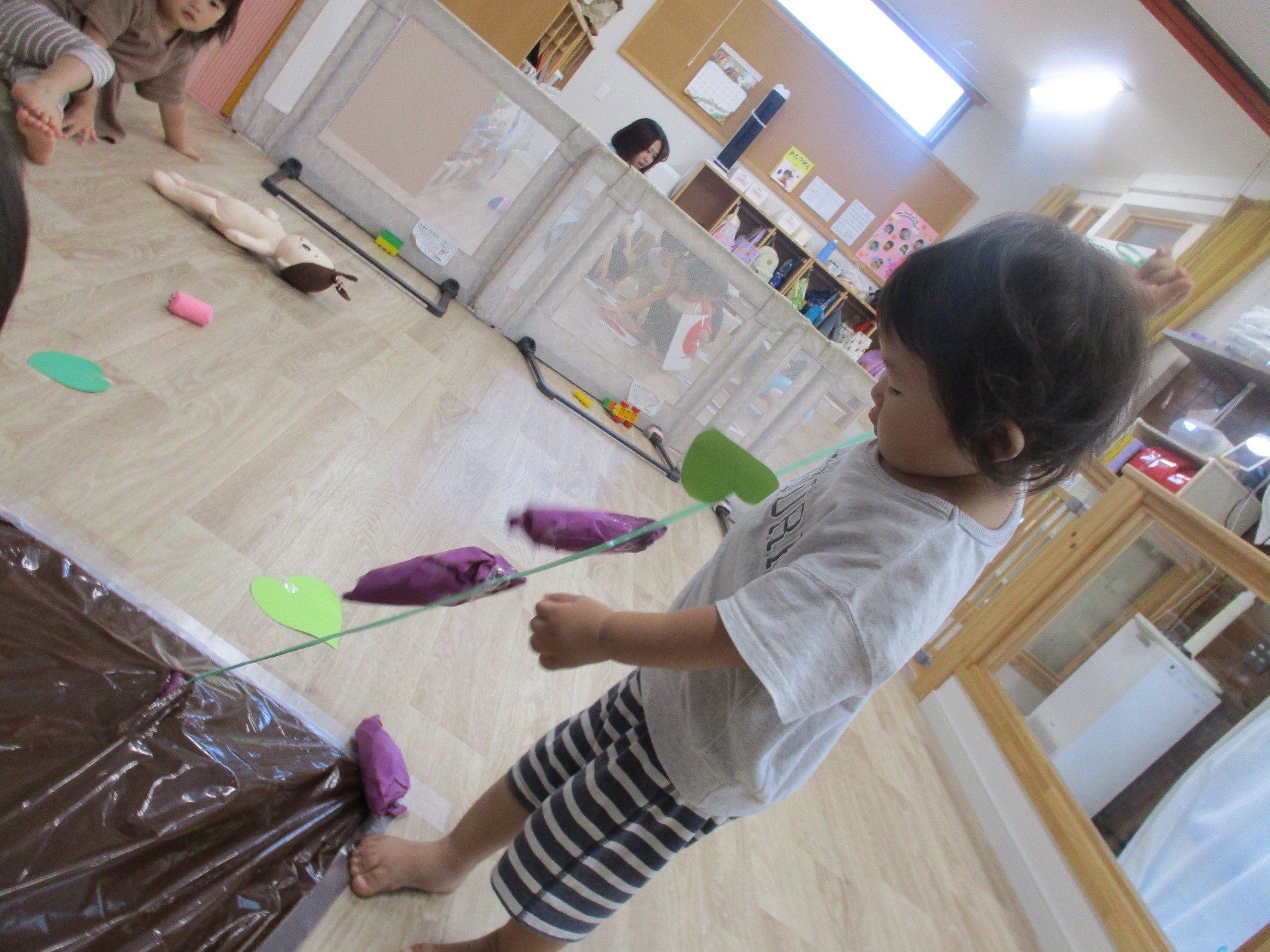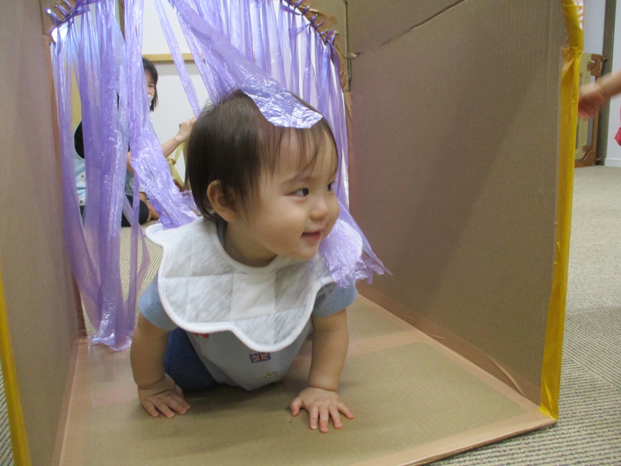 9月は各クラスの運動遊びを行いました。0歳児クラスは、牛乳パックで作った戸板の坂道をハイハイで上り下りしたり、スズランテープがカーテンのようについている段ボールの穴を通ってみたりと、手足の指先を使った運動遊びをしました。いないいないばぁ~と言ったら顔を出し、目と目が合うとにっこり笑ってくれてとてもかわいらしい表情を見せてくれました。また、カラーボールを壁に当てると、あら不思議!魔法がかかったようにくっつきました!(透明の養生テープが貼ってあるのでくっつきます。(笑))