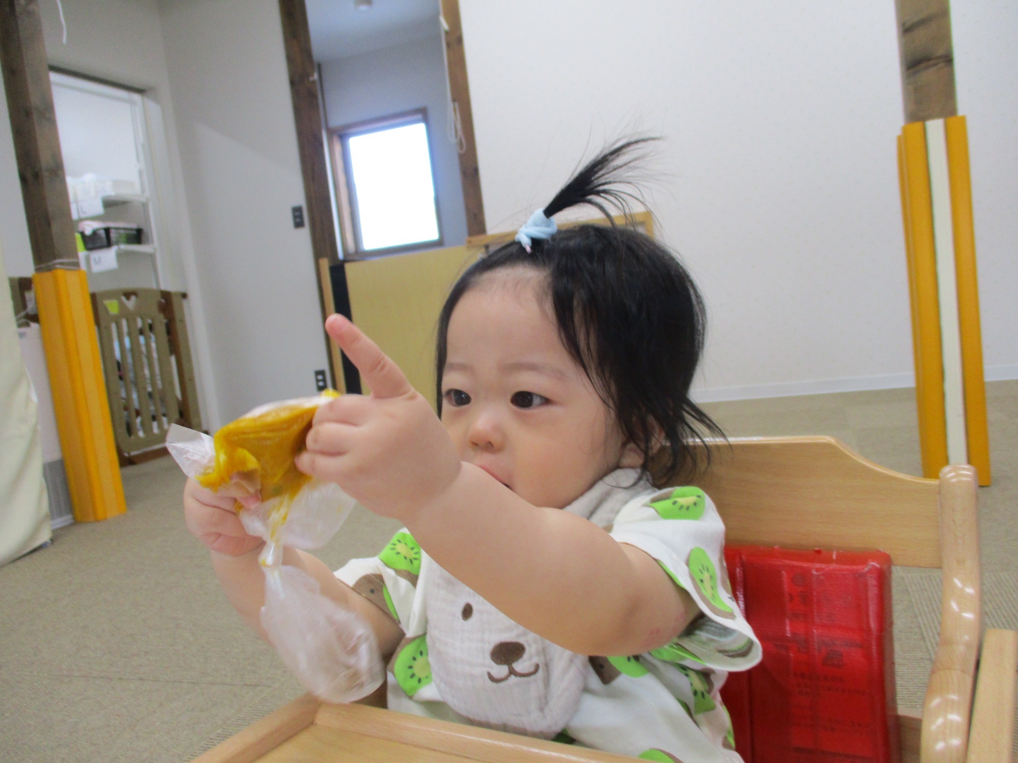 それから、園外保育では木のプラザに行ってきました。色々な遊具があるので、自分の好きなコーナーに行き思う存分楽しんでいました。滑り台では回数を重ねるごとにバランスを取りながら上手に滑れるようになっていましたし、おままごとコーナーでは真新しい食材や道具に釘付けで、両手にたくさん持ちながら色々な料理を作り楽しんでいましたよ。6月は雨で公園には行けませんでしたので、7月9日(火)に小泉東公園に行く予定です。遊具や芝生の広場でたくさん体を動かして遊んできましょうね。(雨天の場合は11日(木)に予定しています。)