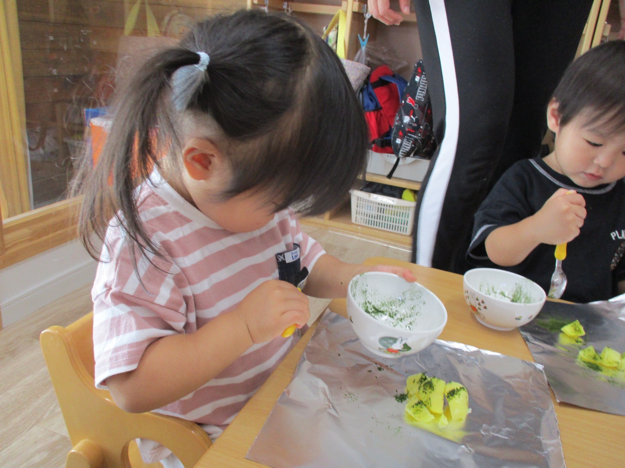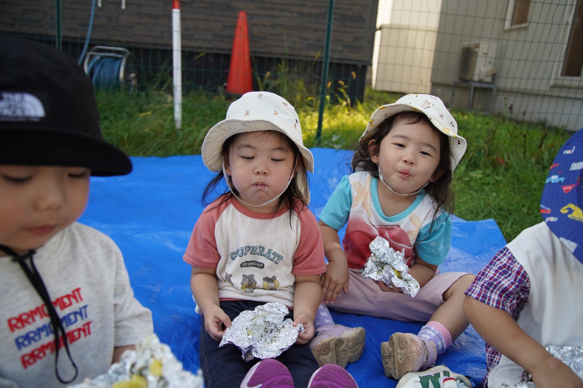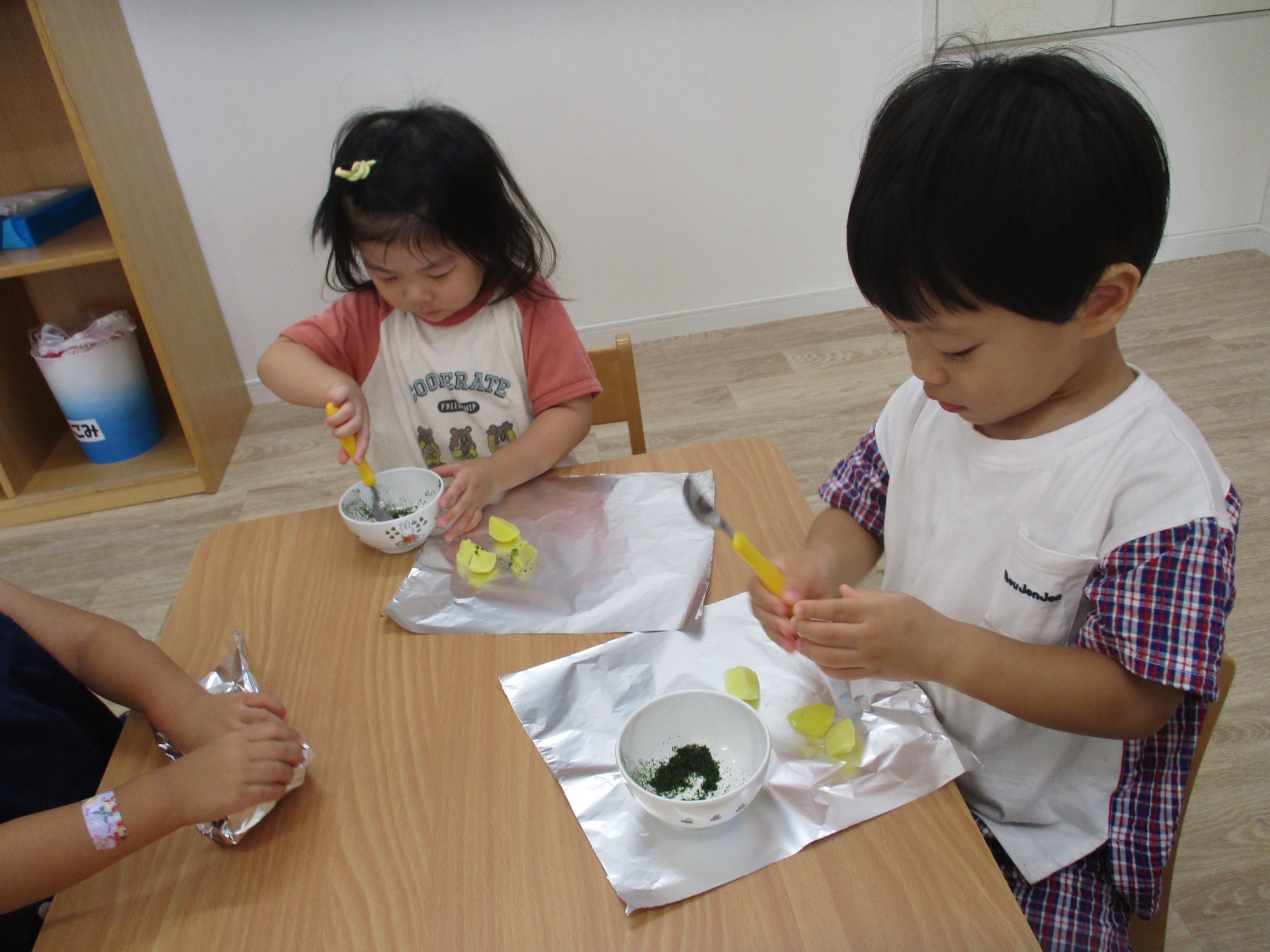 味覚祭では、茹でたじゃがいもと片栗粉をジップロックに入れたものをみんなでコネコネし、芋団子を作りました。また、さつまいもをアルミホイルに包み、焼き台の網の上に置いて焼き、みんなで美味しくいただきましたよ。みんなで作ったお芋を一緒に食べると味も格別だったようで、ペロッと食べていました。そして、その日の給食もみんなほぼ完食!もりもり食べていましたよ(笑)