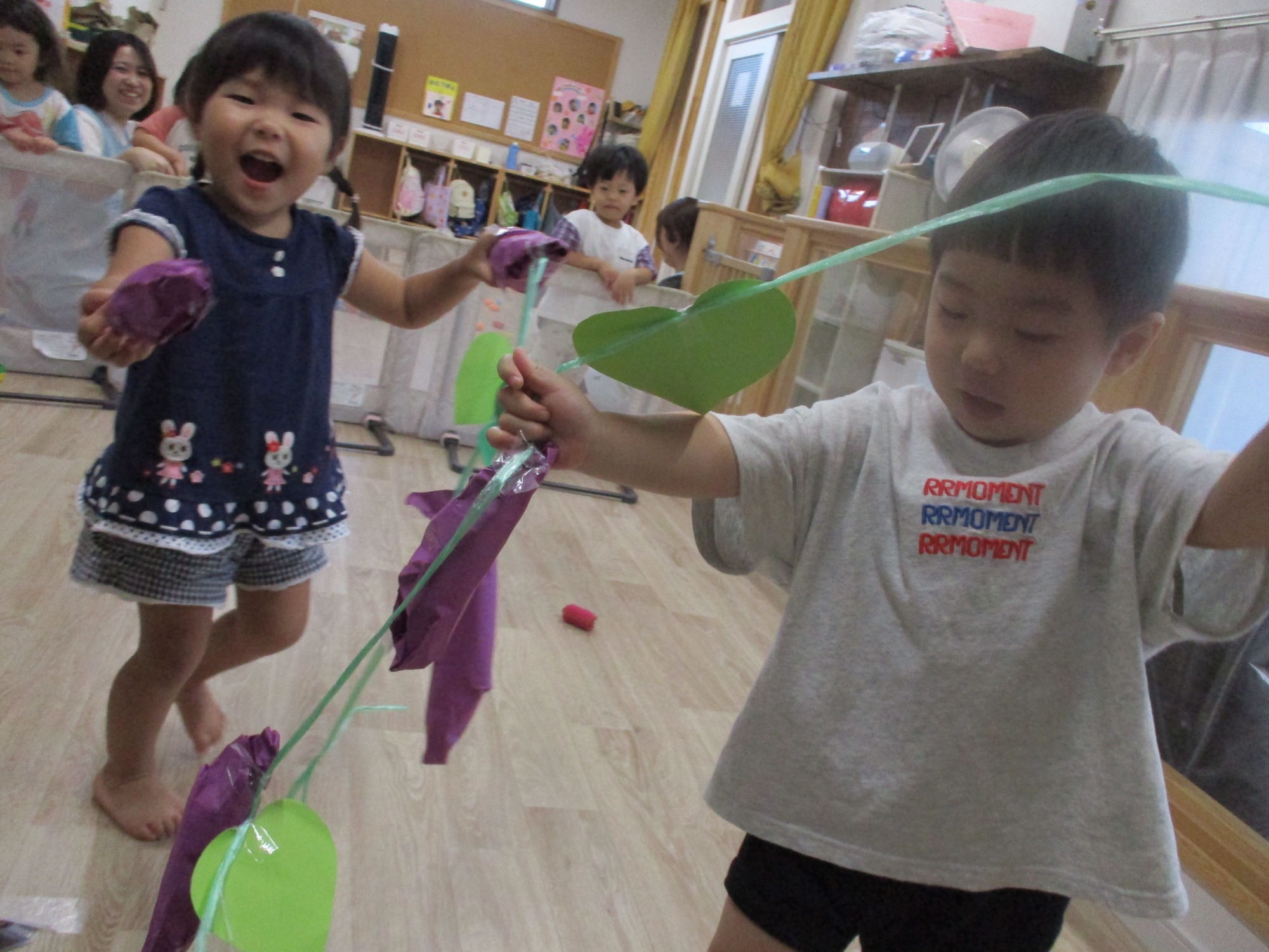 会場の園庭には笹の木が置かれ、お願い事を書いた短冊を飾りましたね。「飛行機に乗って動物園に行きたいな」「お友達とたくさん遊べますように」などなど。みんなのお願い事が叶いますように☆