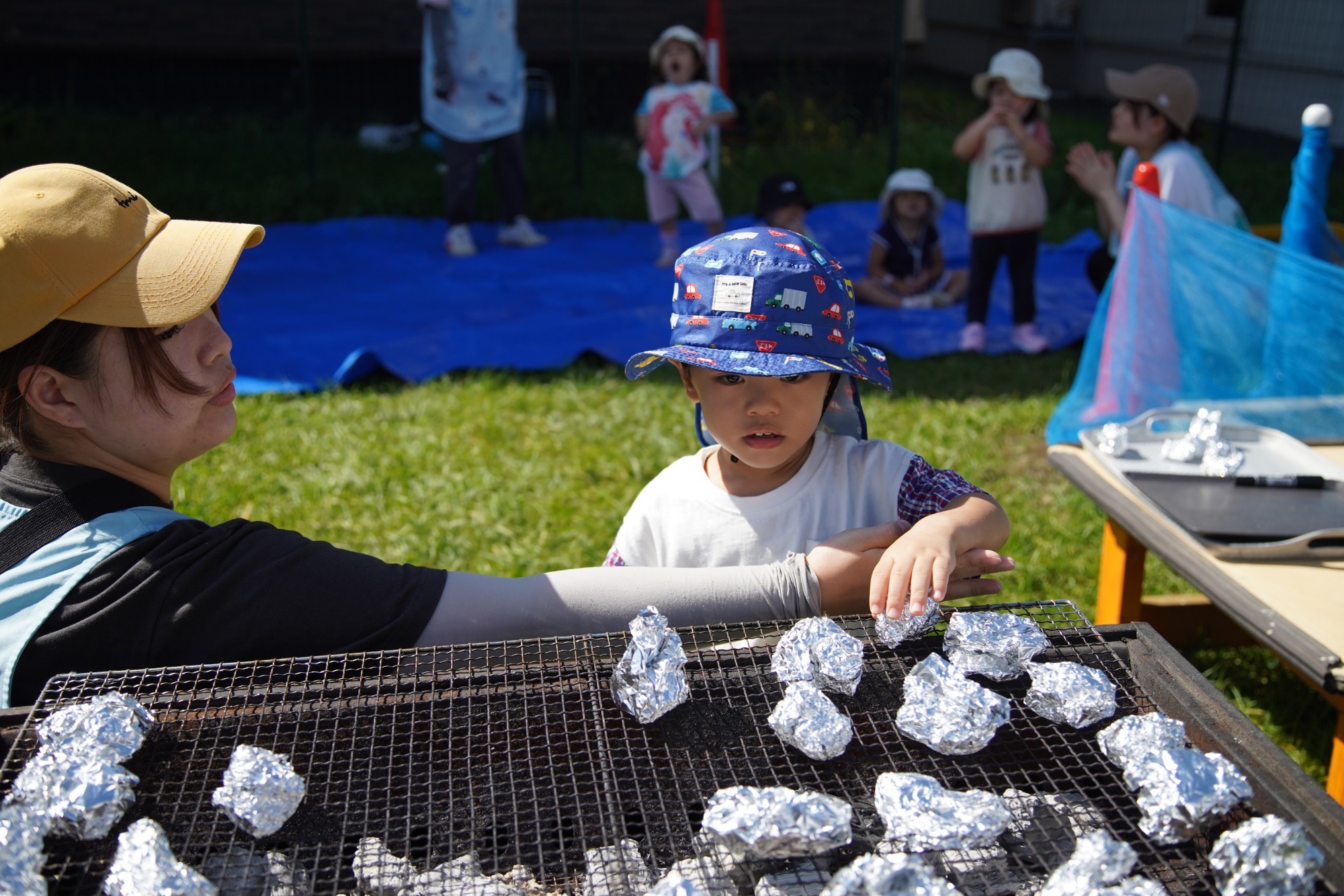 収穫祭ではりす組はかぼちゃだんご作りをしました。袋の中のかぼちゃをぎゅっと握ったり指でつぶしたりと、かぼちゃの感触を楽しみながら作っていましたよ。こあら組とうさぎ組は、ホイルにじゃがいもを乗せてスプーンで青のりをパラパラとかけ、保育者のお手本を見ながら包んで、青のりポテトを作りました。うさぎ組のお友達は、りす組や保育者の分も作ってくれました✨とっても頼もしいお兄さん、お姉さんです!園庭へ移動し、ホイルに包んだ青のりポテトを一人ずつ焼き台に乗せて「おいしくなあれ!」と焼き上がりを楽しみに待ちました。焼き上がった青のりポテトはとってもいい香りがして、みんな「おいしい!」「おかわり!」とあっと言う間に完食。かぼちゃだんごは給食室でおいしい豚汁の具材になり給食で食べました。自分達で育て、クッキングをし、おいしく食べ、とても楽しい収穫祭となりました😋