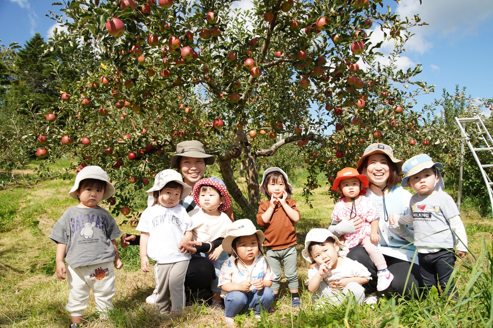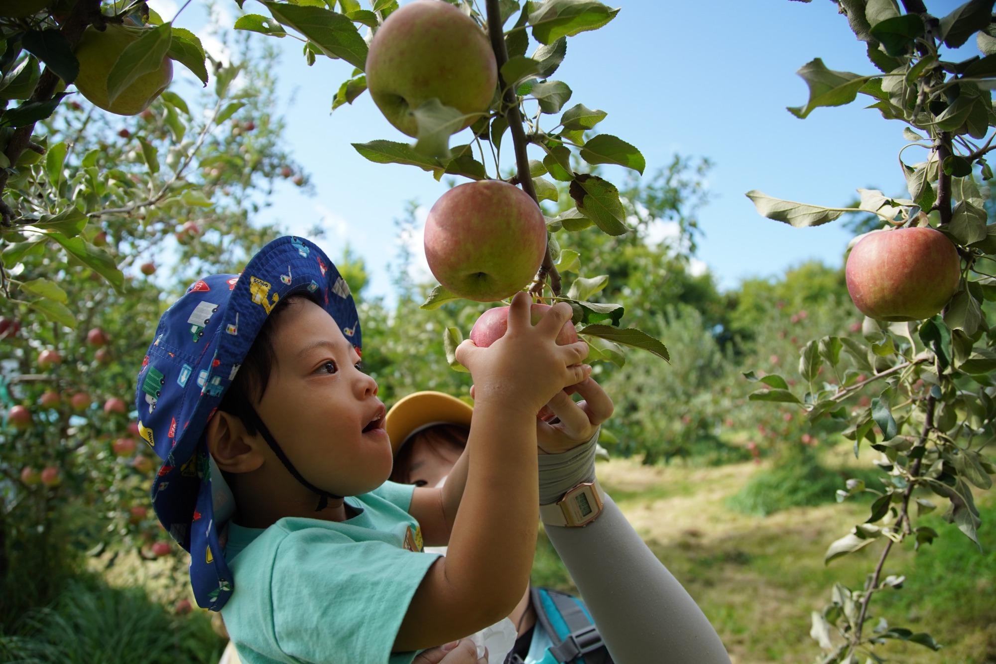 りんご狩りは篠根園さんに今年もお邪魔しました。バスを降りて歩いて行くと、木にたくさん生っている赤や緑色のりんごが見えてきました。すると気持ちもぐっと盛り上がり「あかー」「りんご~」と言いながら、早く採りたい様子でした。枝から上手にもぎ取る方法を教えていただき、みんなで箱いっぱいになるまでりんごを収穫しました。お家で食べた感想はどうだったかな?