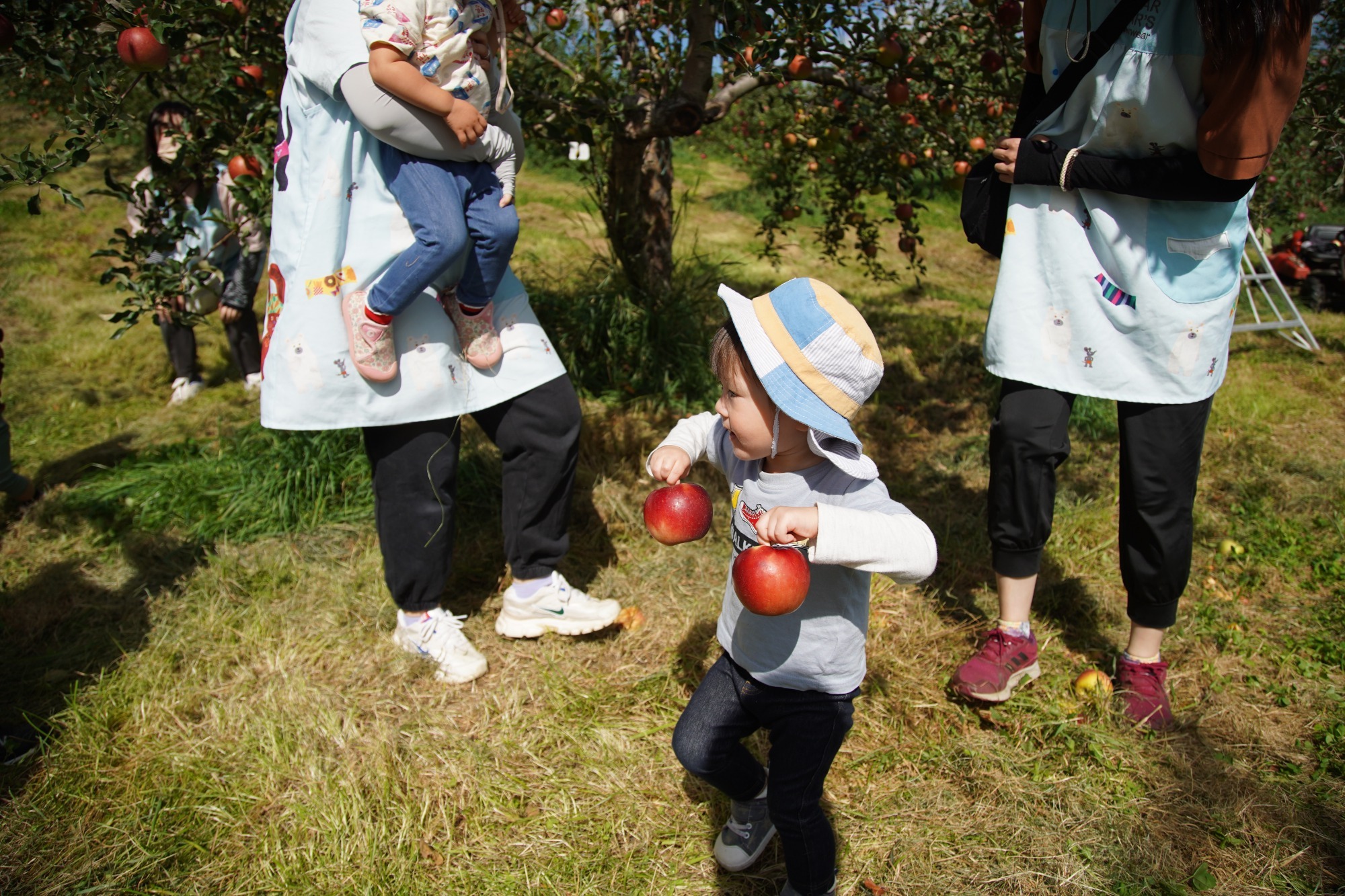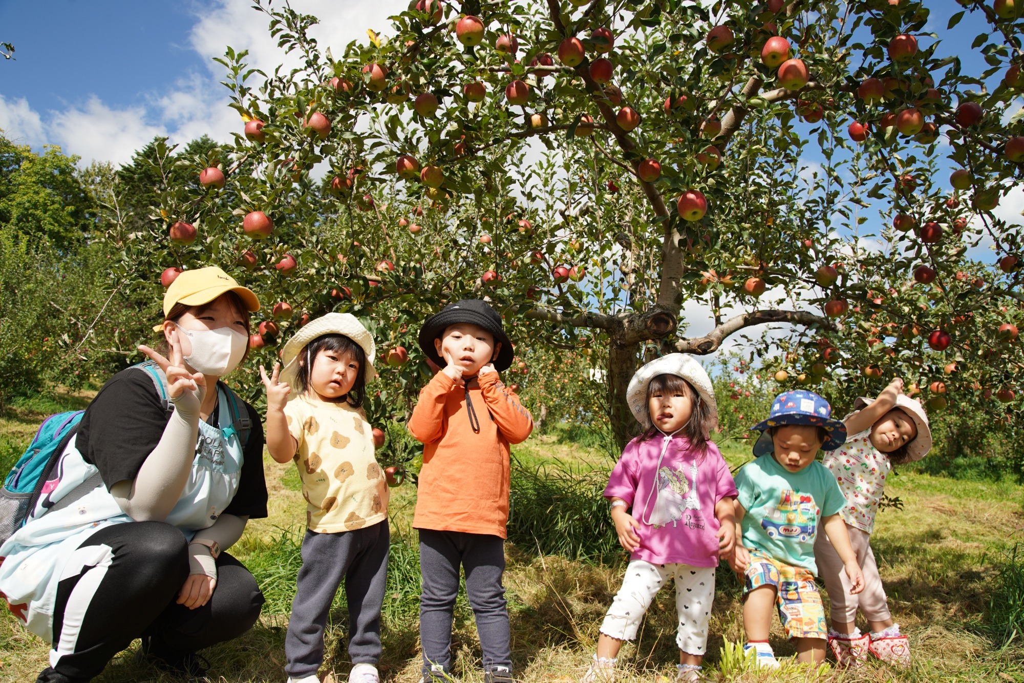りんご狩りでは、こあら組とうさぎ組がパンダバスに乗ってしのねアップルファームへ。赤い実が成っている木が見えてくると「りんごだ!」と、嬉しそうに窓の外を見つめる子ども達。わくわくしている様子が伝わってきました☆保育者と一緒に枝からりんごを採ると、みんな嬉しくて笑顔が弾けていました😊そんな笑顔に私たちも嬉しくなりました。ダンボール箱がいっぱいになるまで採り、園に戻ってから採りたてのりんごをみんなで食べました。普段とは違う皮つきのりんごを、すいかのように食べるお友達が多かったですが、食べられると分かると、おいしそうに食べていましたよ。とても甘いりんごでした🍎りす組のお友達は3時のおやつの時に食べました。おうちに持ち帰ったりんごも、甘くておいしかったでしょうか?また来年も甘くておいしいりんごが採れますように。