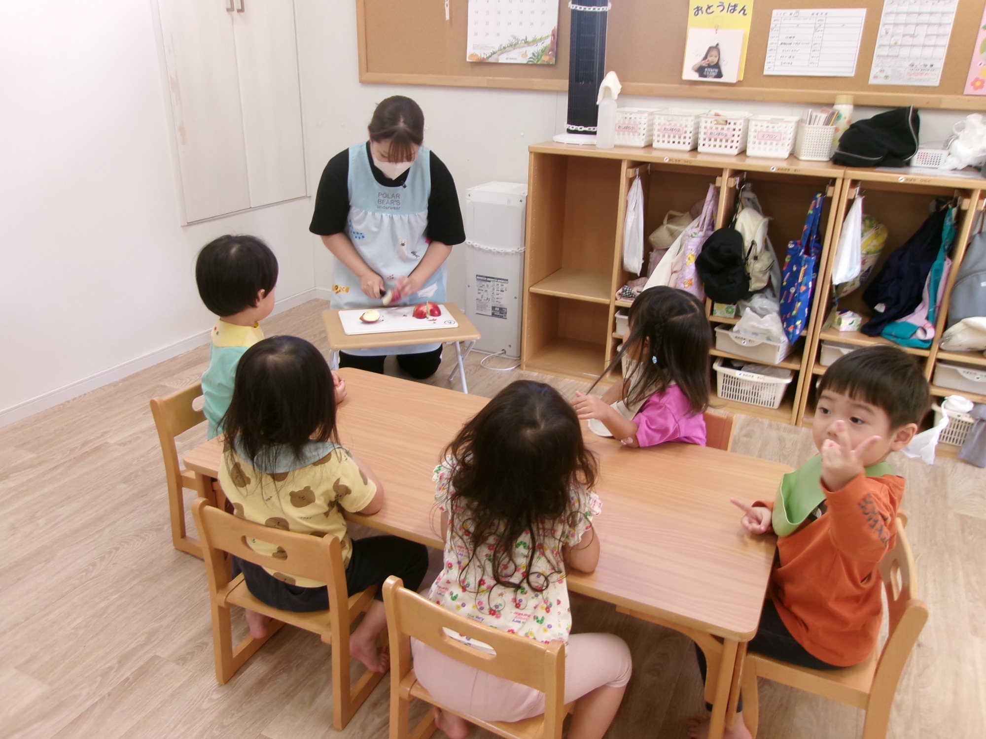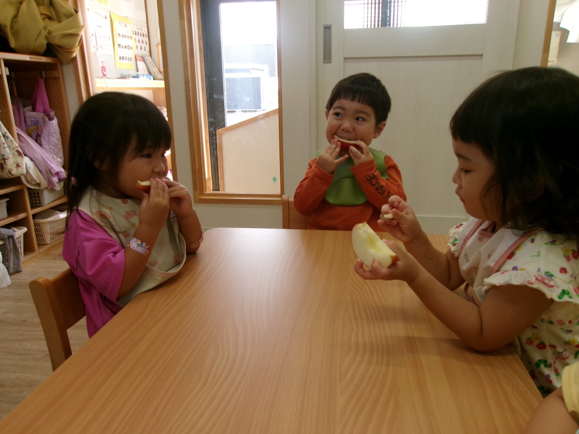 そして、9月22日(金)は法人バスに乗ってりんご狩りに行ってきました。りす組はお留守番だったので保育室で上から吊るしてある手作りりんごを収穫して楽しみました。こあら組とうさぎ組は、本物の木からくるっと捻って段ボールいっぱいになるまで上手に収穫していました。もぎたてのりんごはとても美味しかったですね!