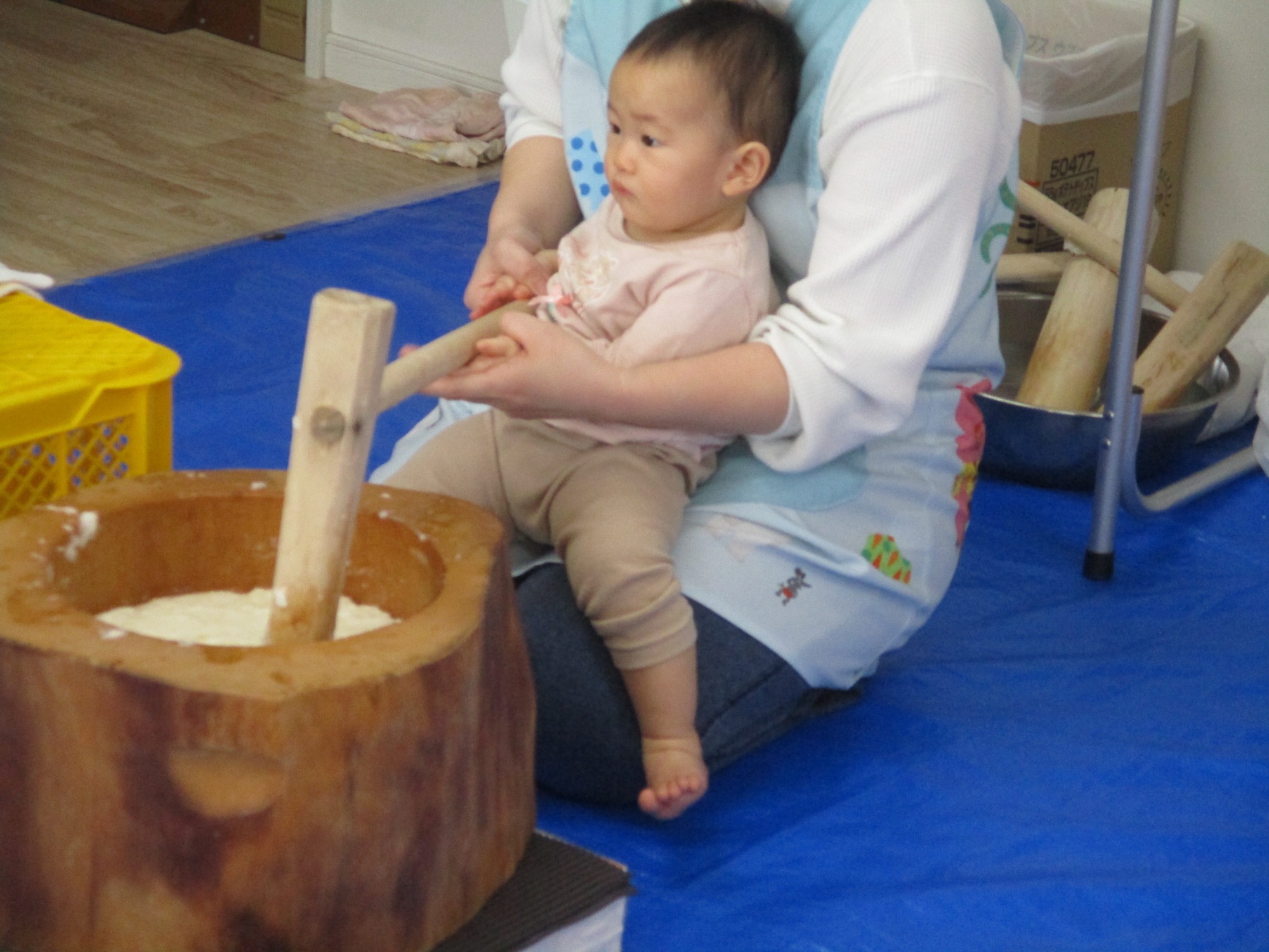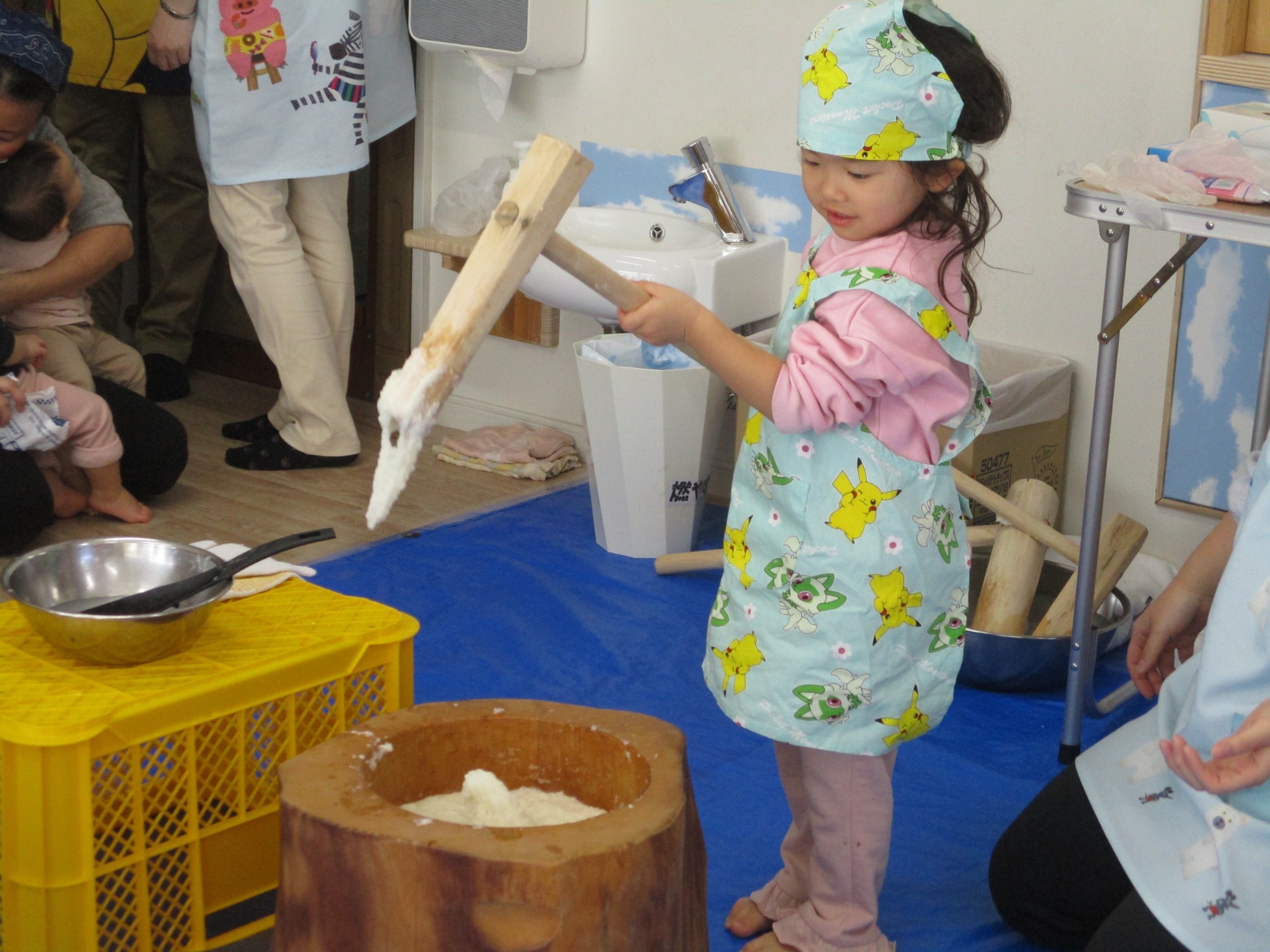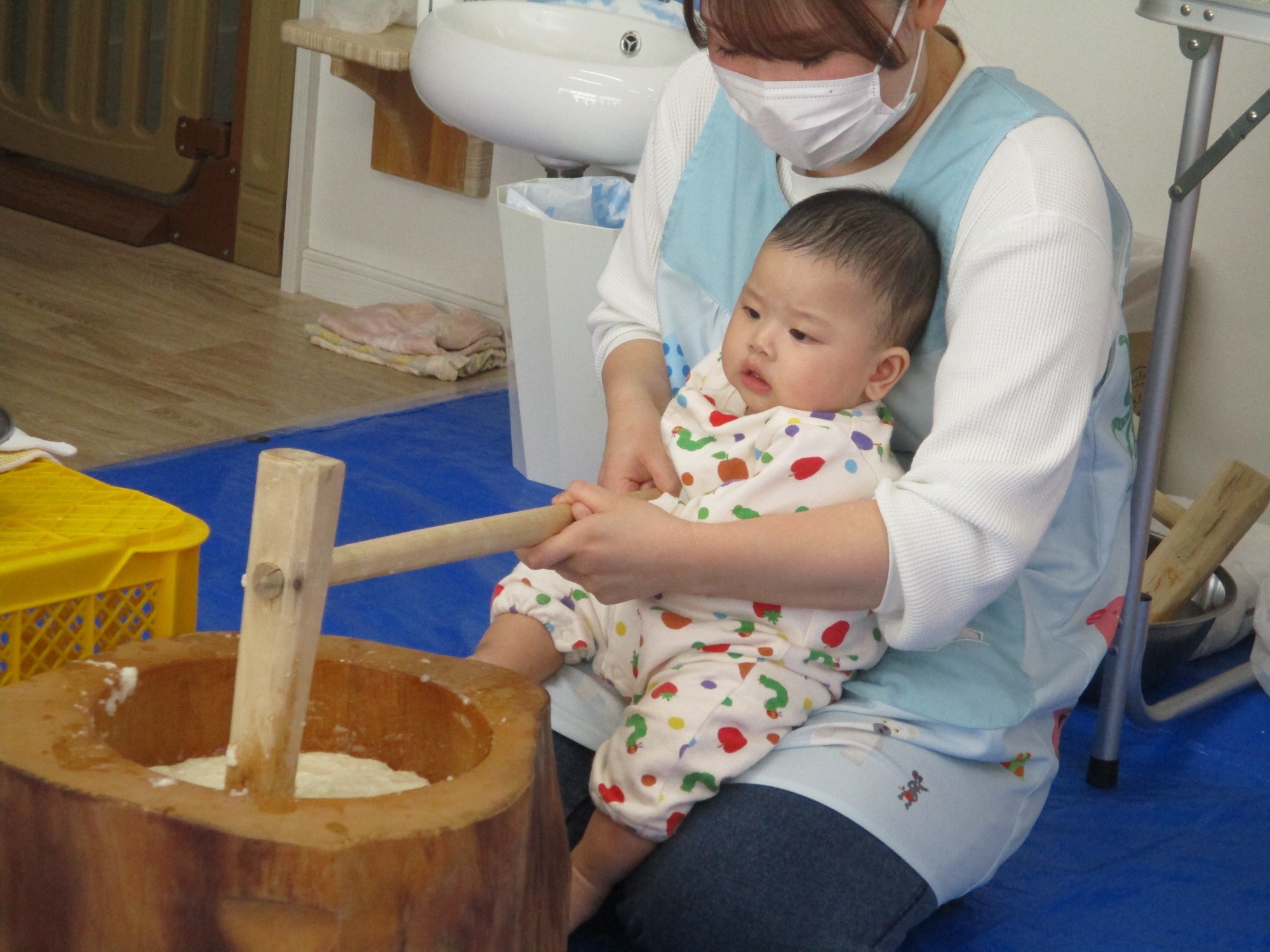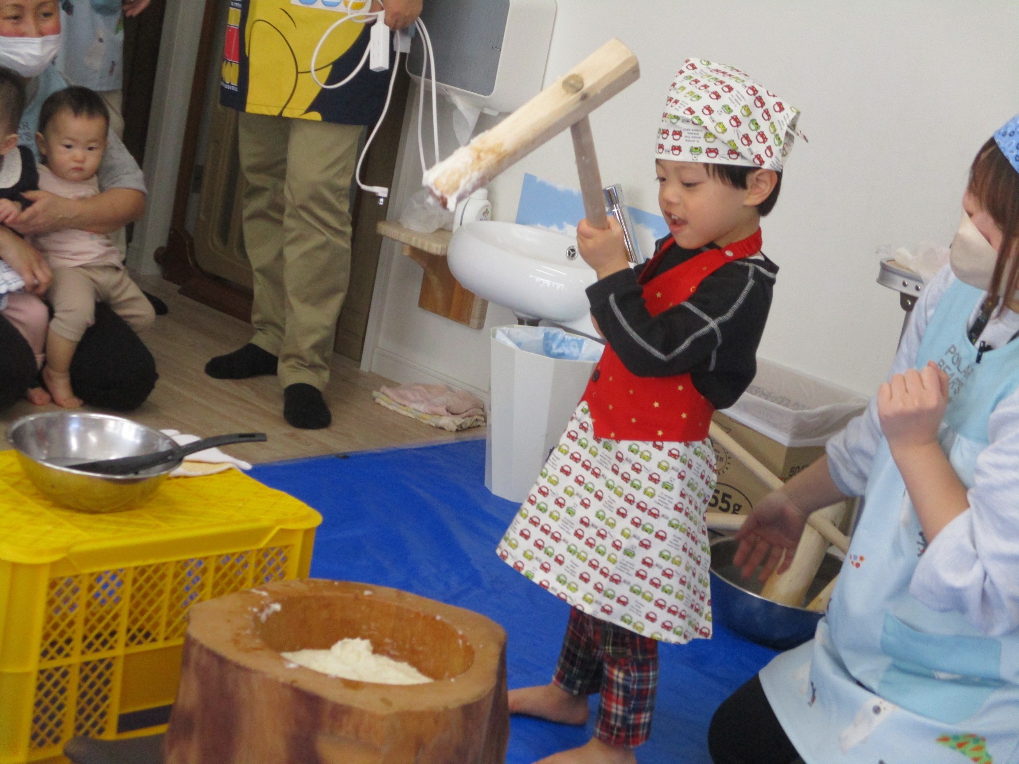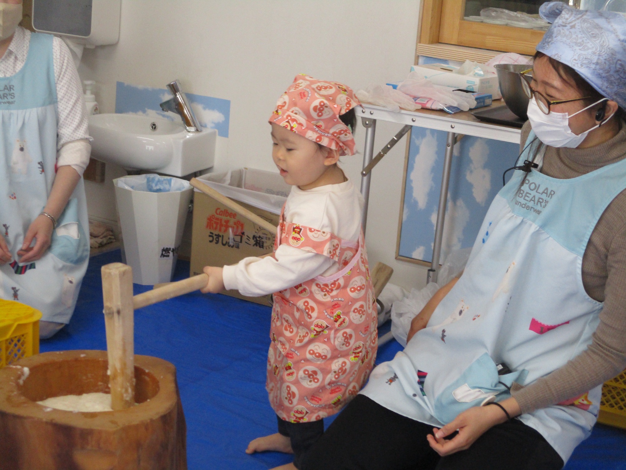 12月はもちつきやクリスマス会がありました。もちつきでは、全員が保育者と一緒に杵を持ち、「も~ちつ~き~ぺったんこ~🎵」の歌に合わせて何度も小さな臼の中の餅をつきました。臼の中を覗きながら恐る恐るついている子や、「もっとやりた~い!」と一人で積極的についている子と様々でした。また、見ている時は不思議そうにジーっと観察している子や「がんばれ~!」と声を掛け応援してくれる子など、みんなそれぞれに楽しんでいました。子ども用臼の隣では、大きな臼を男性職員が「ドン!ドン!」とつきました。振動が体に響くので初めは少し驚いた様子でしたが、つくごとに少しずつ柔らかくなり「ビヨ~ン」と伸びる様子を見るとみんな興奮気味でしたよ!最近ではご家庭でもちつきをされているということはあまり聞かなくなりましたので、子ども達にとっても良い経験だったのではないでしょうか。