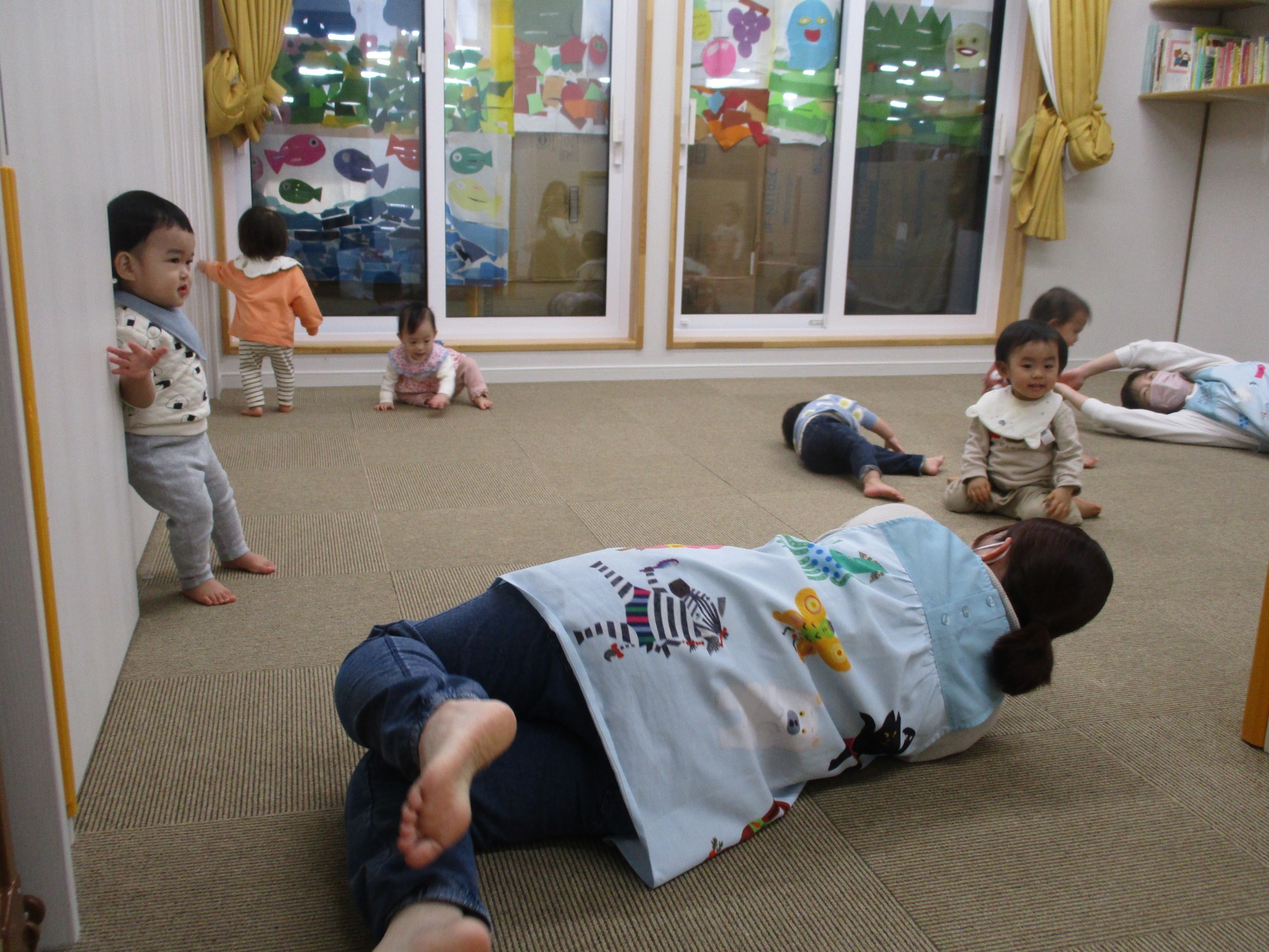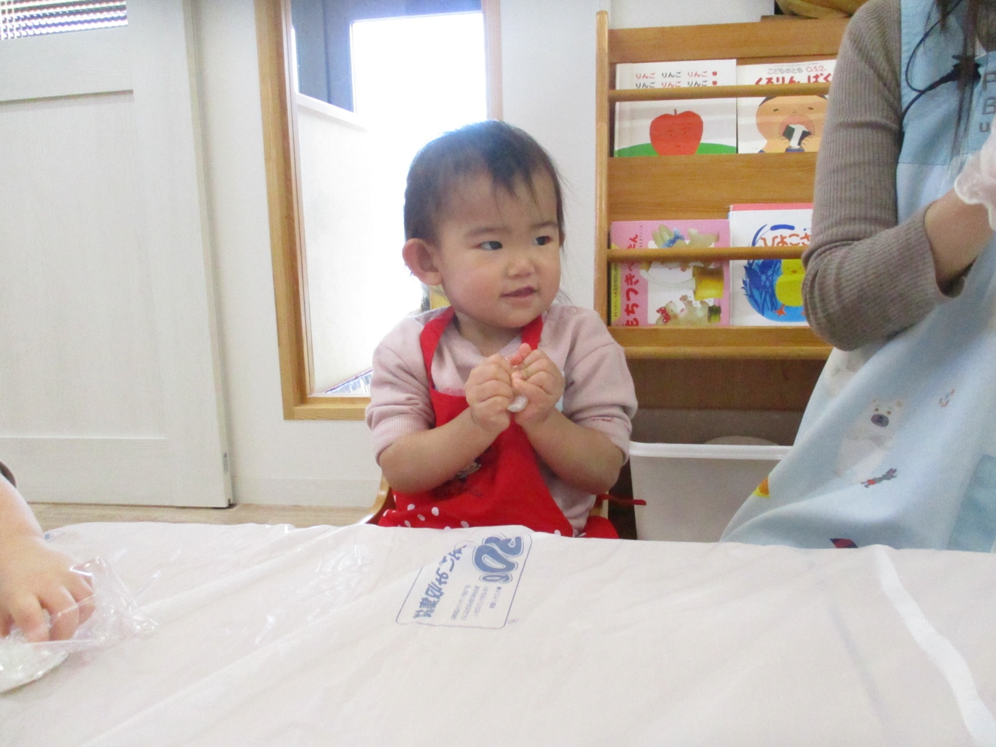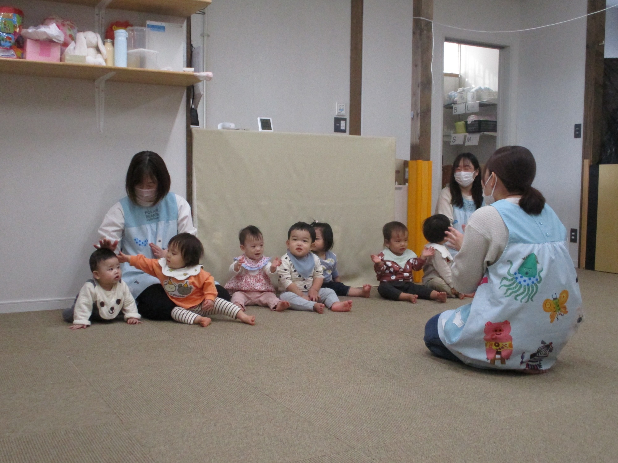0歳児りす組では、保育者との愛着関係を大切にし、発達に応じた好きな遊びがじっくりとできるように、そして、年明け頃からは友だちとの関わりも少しずつ持てるようにと、遊び方の工夫もしながら進めてきました。今後は、自我が芽生え始め色々な思いを主張するようにもなり、自己表現ができるように成長していく時期でもありますので、しっかりと子どもの思いを受け止めながら保育を進めて行きたいと思います。