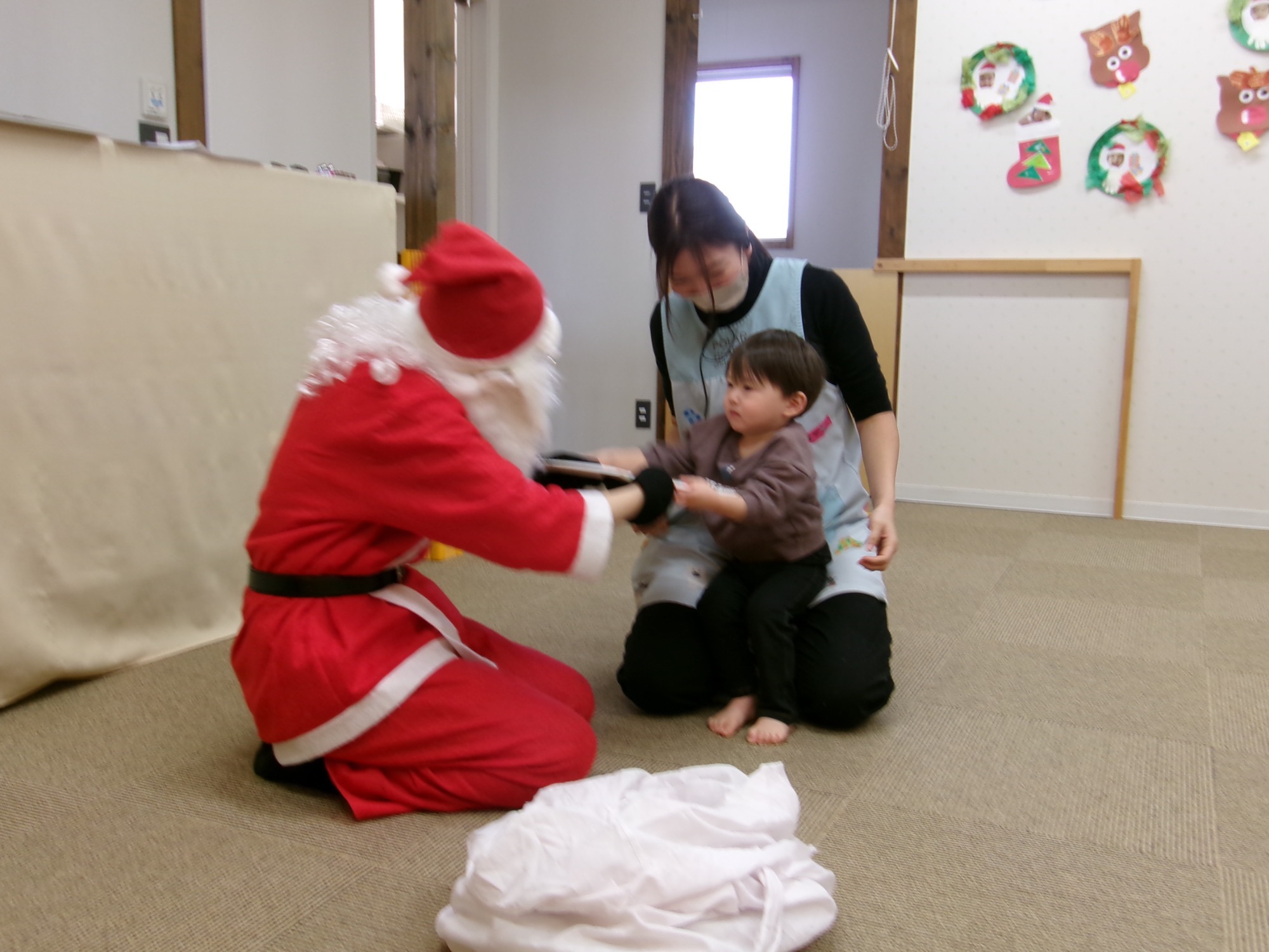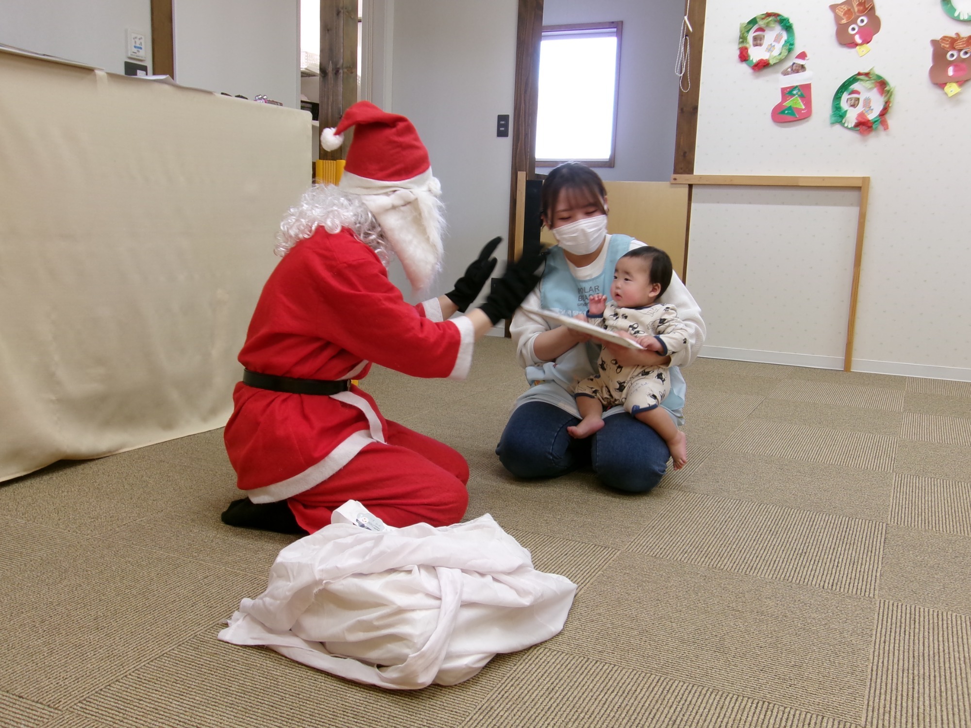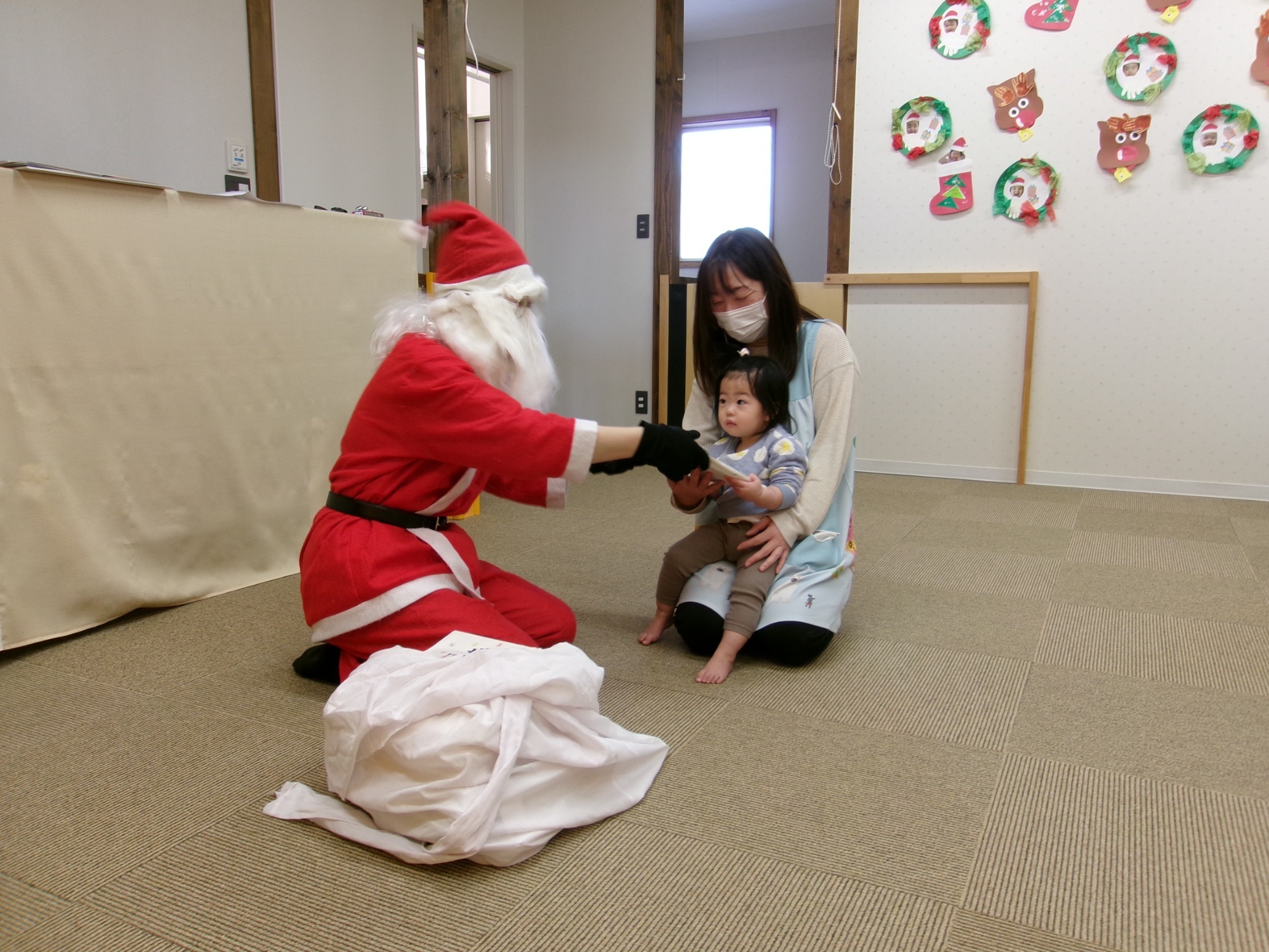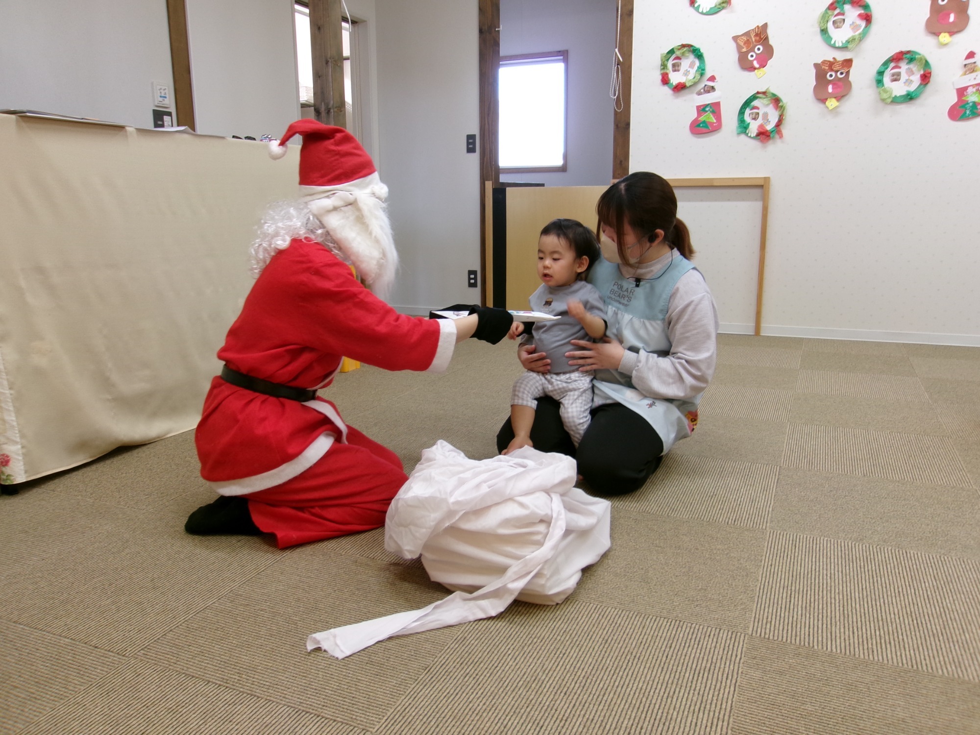 みんなが待ちに待ったクリスマス会では、サンタさんが登場するスケッチブックシアターを見ていると、どこからかシャンシャンシャンと鈴の音が聞こえてきました。みんなが不思議そうにしていると、なんとサンタさんが登場しました🎅みんな驚いた表情をしていましたが、サンタさんにどこから来たのか、好きな食べ物は何かなど教えてもらっているうちに、少しずつ笑顔が見られるようになりました。そして大きな袋を見せてくれながら「みんなにプレゼントを持ってきたよ」と、一人ずつにプレゼントを渡してくれました。プレゼントをもらうと、サンタさんとタッチをしたりぎゅっと抱きしめてもらったりと触れ合う姿があり、微笑ましかったですよ。プレゼントをもらったお礼にみんなで歌のプレゼントをすると、「ありがとう」と喜んでくれたサンタさん。最後にみんなで記念写真を撮って、遠くの寒いところに帰るサンタさんを、「ありがとう、また来てね」と見送りました。みんなサンタさんに会えて良かったね☆プレゼントはおうちで楽しんで下さいね。