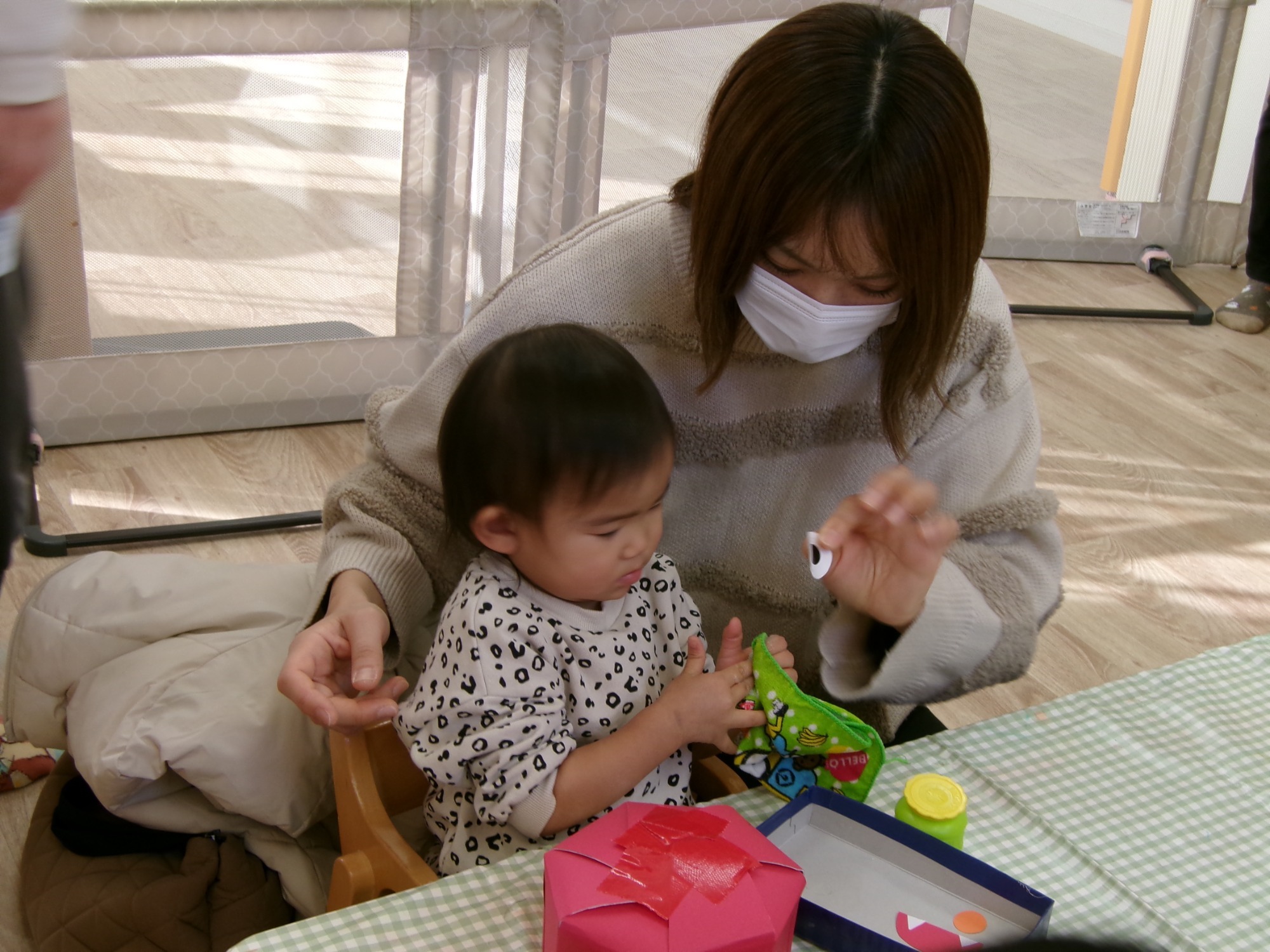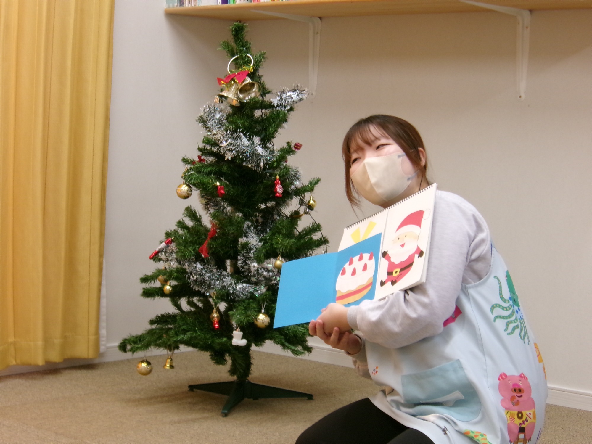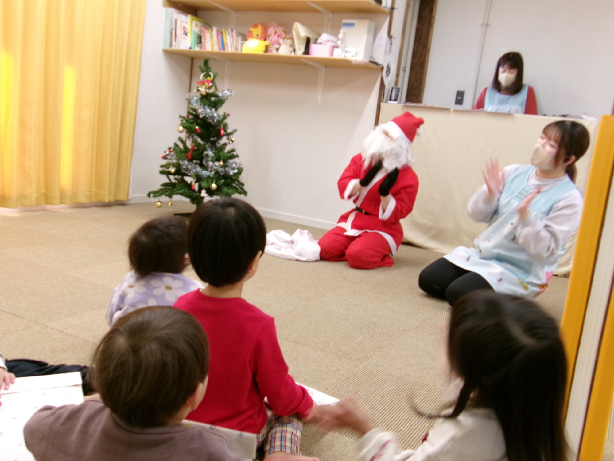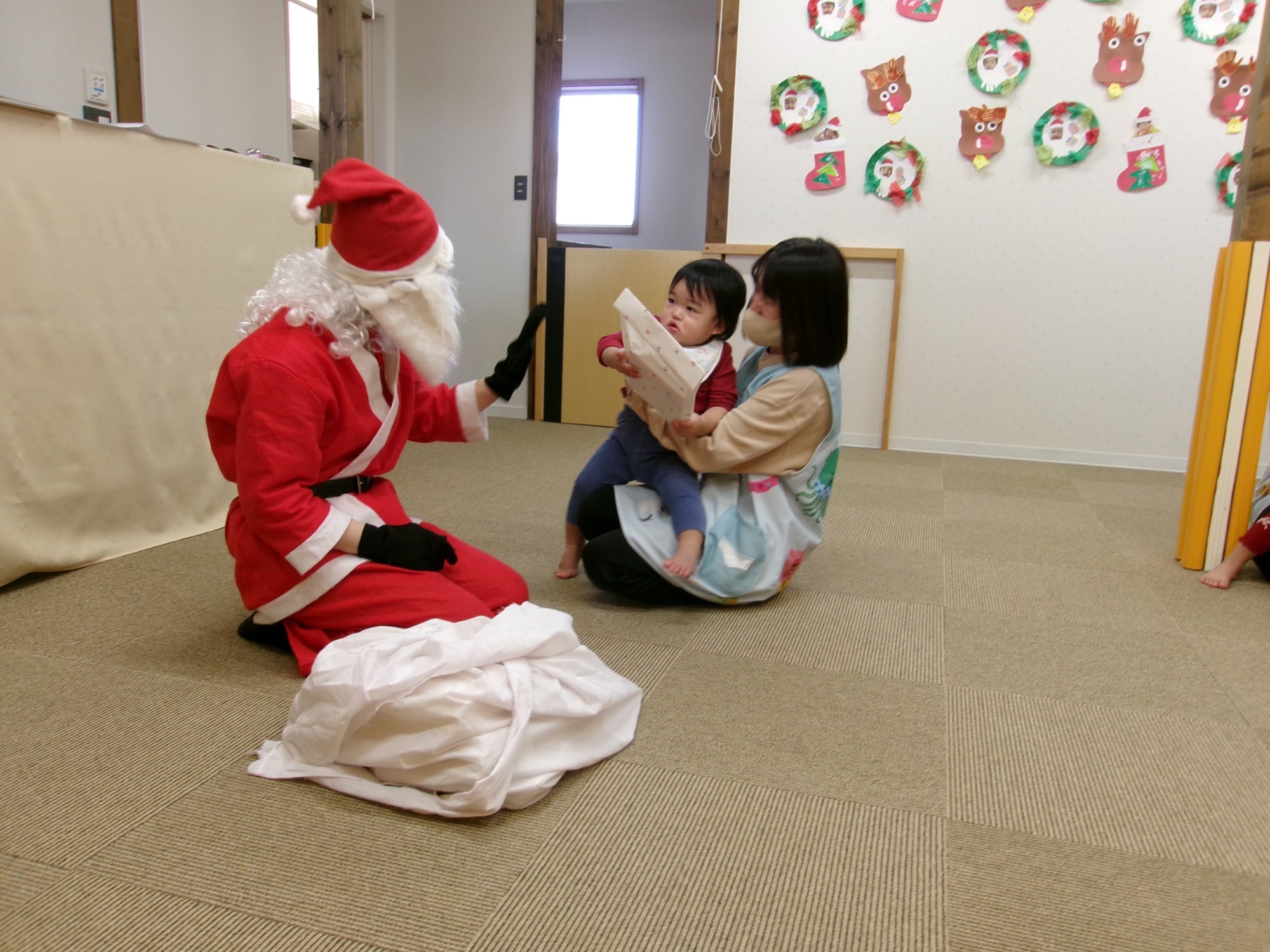 みんなが待ちに待ったクリスマス会では、サンタさんが登場するスケッチブックシアターを見ていると、どこからかシャンシャンシャンと鈴の音が聞こえてきました。みんなが不思議そうにしていると、なんとサンタさんが登場しました🎅みんな驚いた表情をしていましたが、サンタさんにどこから来たのか、好きな食べ物は何かなど教えてもらっているうちに、少しずつ笑顔が見られるようになりました。そして大きな袋を見せてくれながら「みんなにプレゼントを持ってきたよ」と、一人ずつにプレゼントを渡してくれました。プレゼントをもらうと、サンタさんとタッチをしたりぎゅっと抱きしめてもらったりと触れ合う姿があり、微笑ましかったですよ。プレゼントをもらったお礼にみんなで歌のプレゼントをすると、「ありがとう」と喜んでくれたサンタさん。最後にみんなで記念写真を撮って、遠くの寒いところに帰るサンタさんを、「ありがとう、また来てね」と見送りました。みんなサンタさんに会えて良かったね☆プレゼントはおうちで楽しんで下さいね。