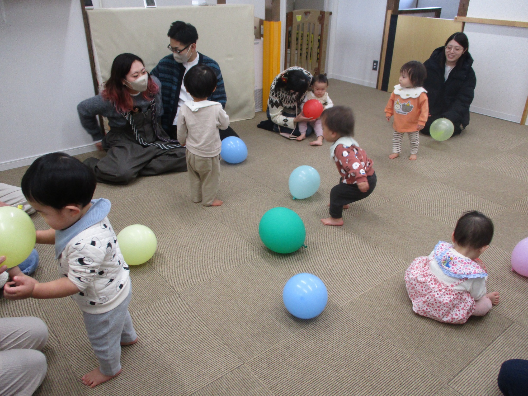 保育参観ではりす組は、リズム遊びや体操、感触遊びをしました🎈リズム遊びと体操は、保護者の方にこっそり隠れていただき、普段の子ども達の様子を観ていただきました。音楽に合わせて思い思いに体を動かしたり、保育者の動きをまねたりしながら楽しんでいましたね。感触遊びは保護者の方と一緒に遊び、リラックスした様子で保護者の方の膝の上で風船の感触を楽しむ子、『みてみて!これ、おもしろいよー』という様子で繰り返しスズランテープのトンネルをくぐる子と、色々な表情が見られました。