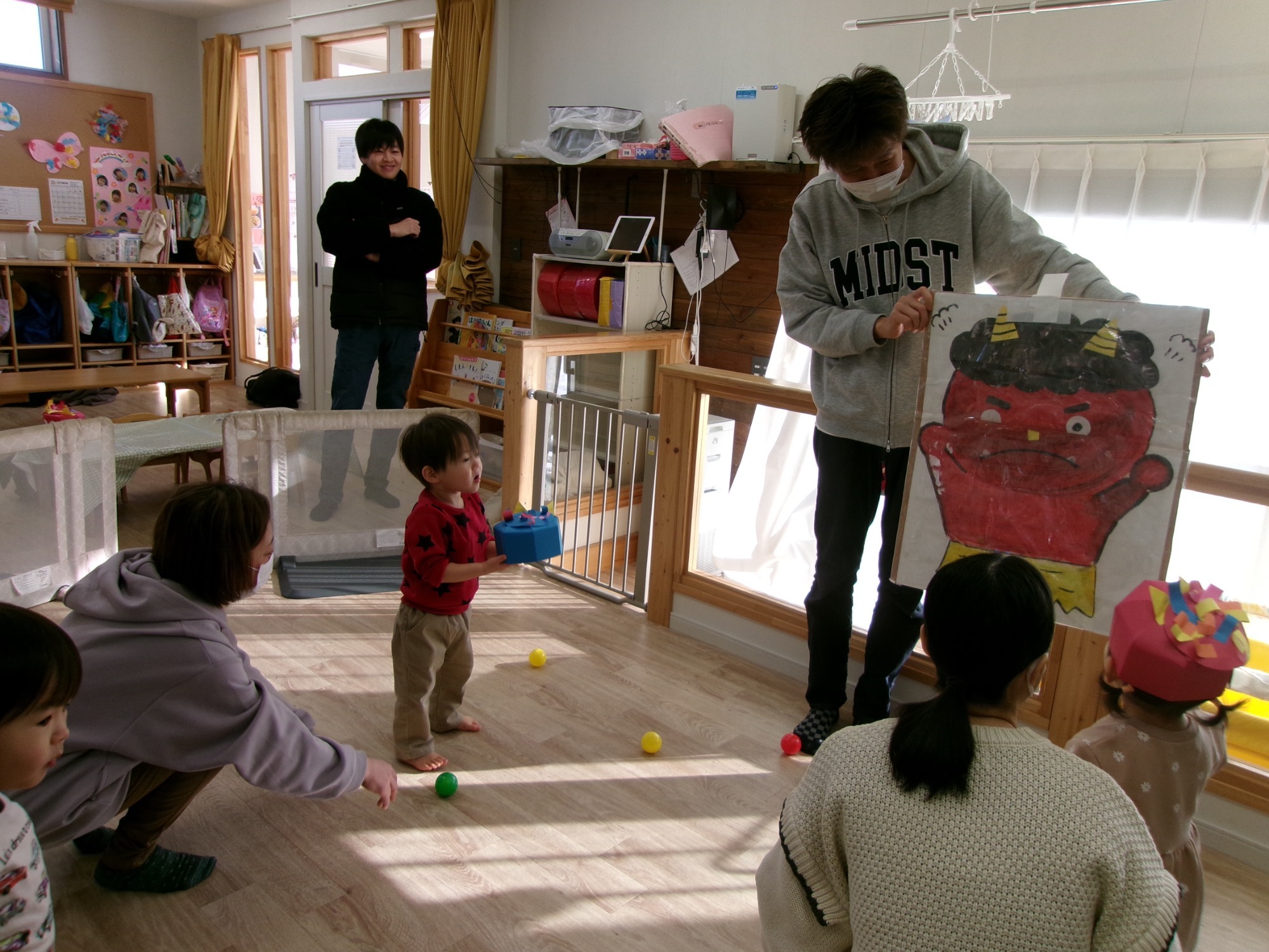 節分では自分で作った鬼のお面やカチューシャ、豆入れバックを身に付けて参加しました。新聞紙で作った豆を鬼にぶつけて、怖い気持ちに負けないように一生懸命退治していましたよ。これで自分の中の弱虫を退治することができ、今年1年元気で健康に過ごせますね!