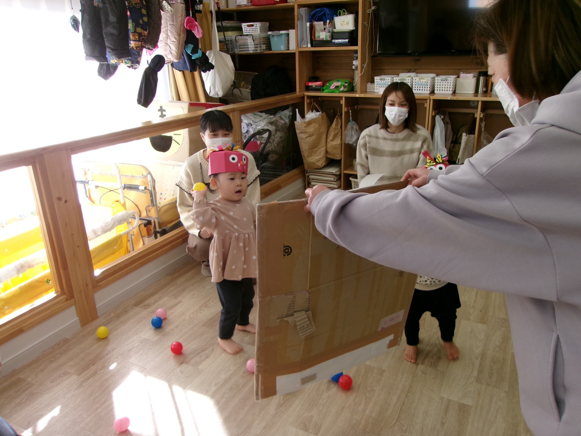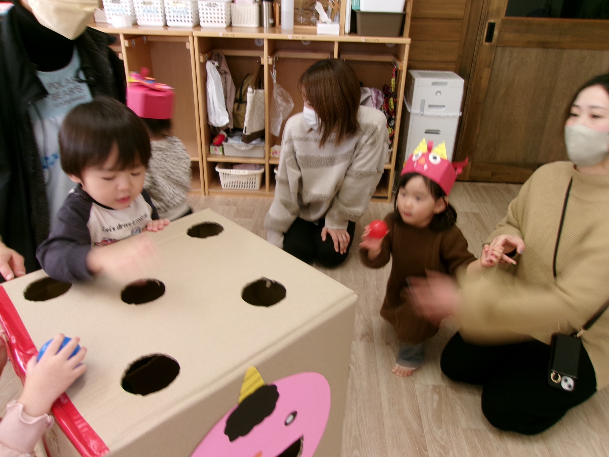 こあら組は、おにの帽子製作とボール遊びをしました👹製作では保護者の方と一緒に目や口などのパーツをのり付けし、つのや髪の毛もテープで貼っておにの帽子を作りましたよ。「どこに貼る?」「ここ!」など、親子の会話が聞こえてきて微笑ましい時間でした。同じパーツですがみんなそれぞれ個性あふれる可愛らしい帽子ができあがりました。早速できあがった帽子を被り、保護者の方に協力していただき、おにを退治したりぽっとん落としをしたりしてたっぷり遊びました。