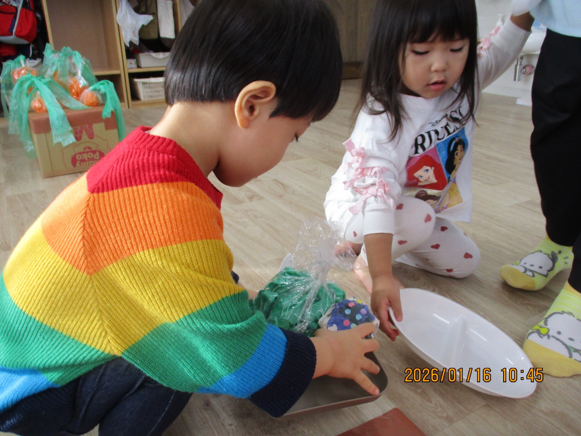 2歳児うさぎ組では、体を使った遊びや手先を使う作業なども行い、小さいシール貼りやのり・はさみなども上手に使えるようになってきました。また、子ども達が自分で考えた遊び方を展開していく場面も多々見られるようになり、なるほど~といつも関心させらます。そして、小さいお友だちに玩具を貸してあげたり泣いている子に声をかけてくれたりと、心の成長も大きく感じられるようになりました。