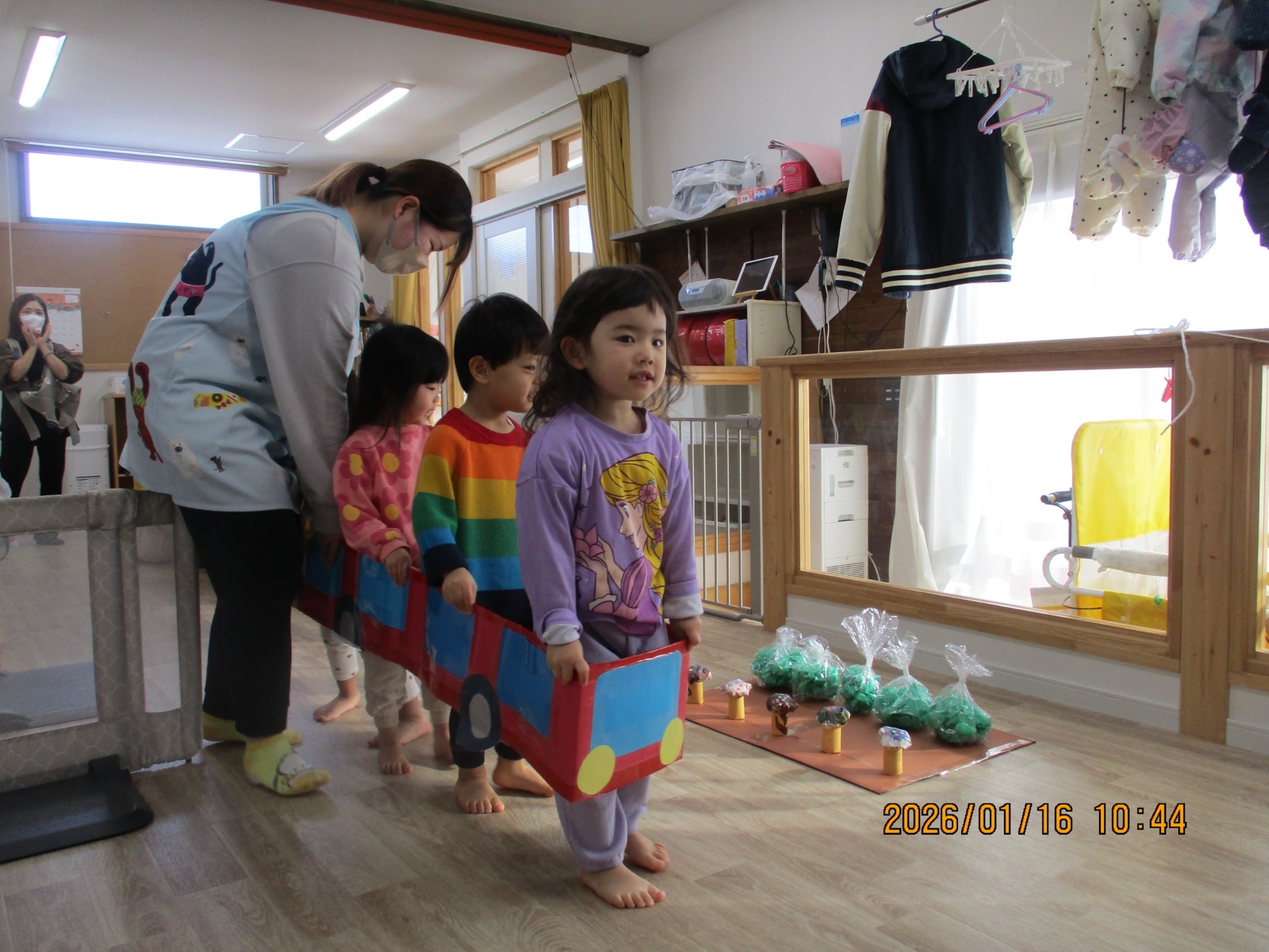 1歳児こあら組では、見立て遊びやごっこ遊びもたくさん行い、友だちを意識した遊び方や言葉でのやり取りも少しずつできるようになってきました。子ども達に遊びの興味関心を持たせイメージが膨らむようにするためには、どのような声掛けをしたら良いかを考えることで、じっくりと遊び込める環境づくりを工夫してきました。最近では、約束事やルールのある遊びもできるようになり成長が感じられます。