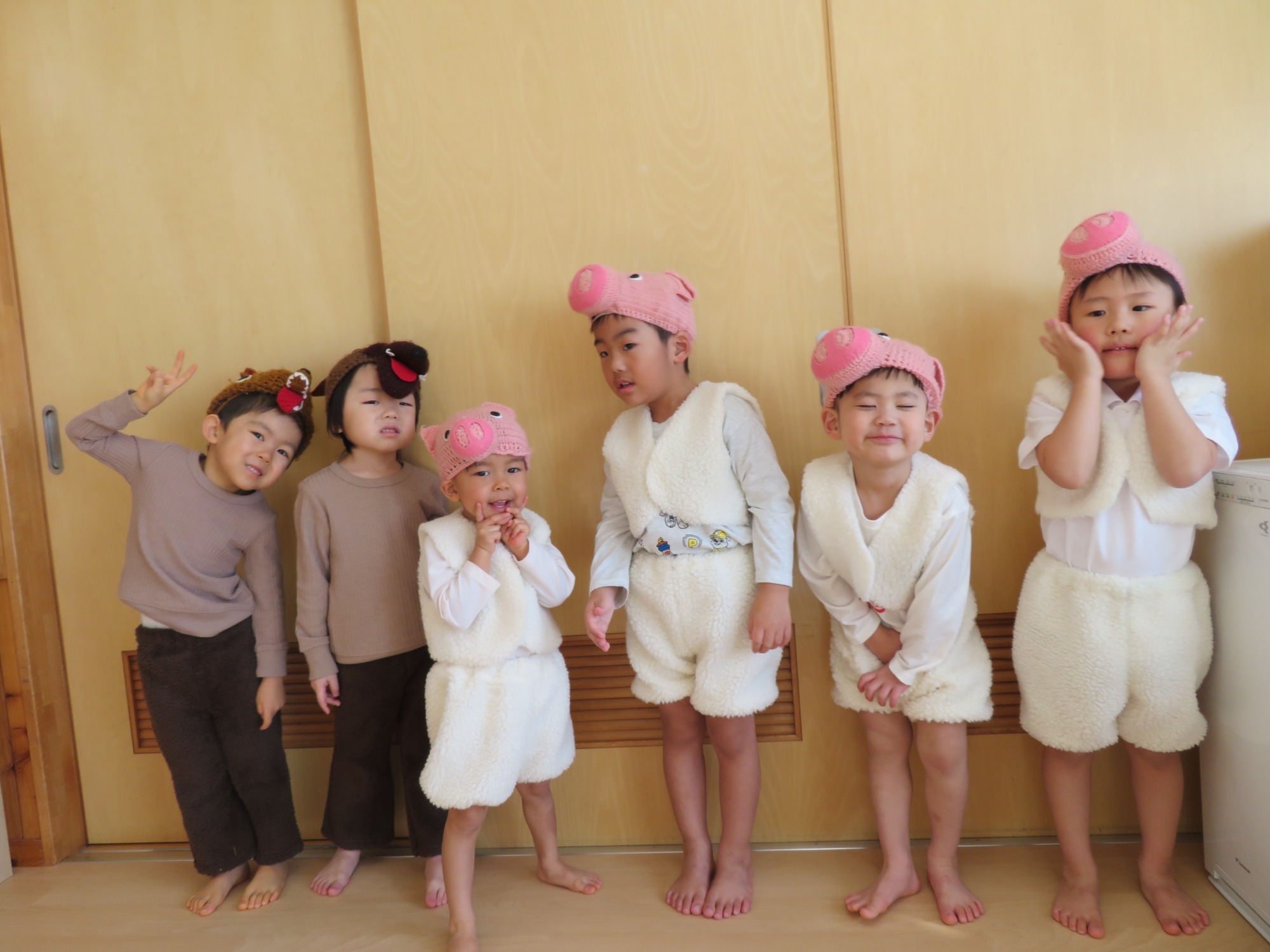 生活発表会で三びきのこぶたの劇遊びをしました。本番では緊張することなく、子どもたちのいつもの姿を保護者の方に観てもらうことができました。