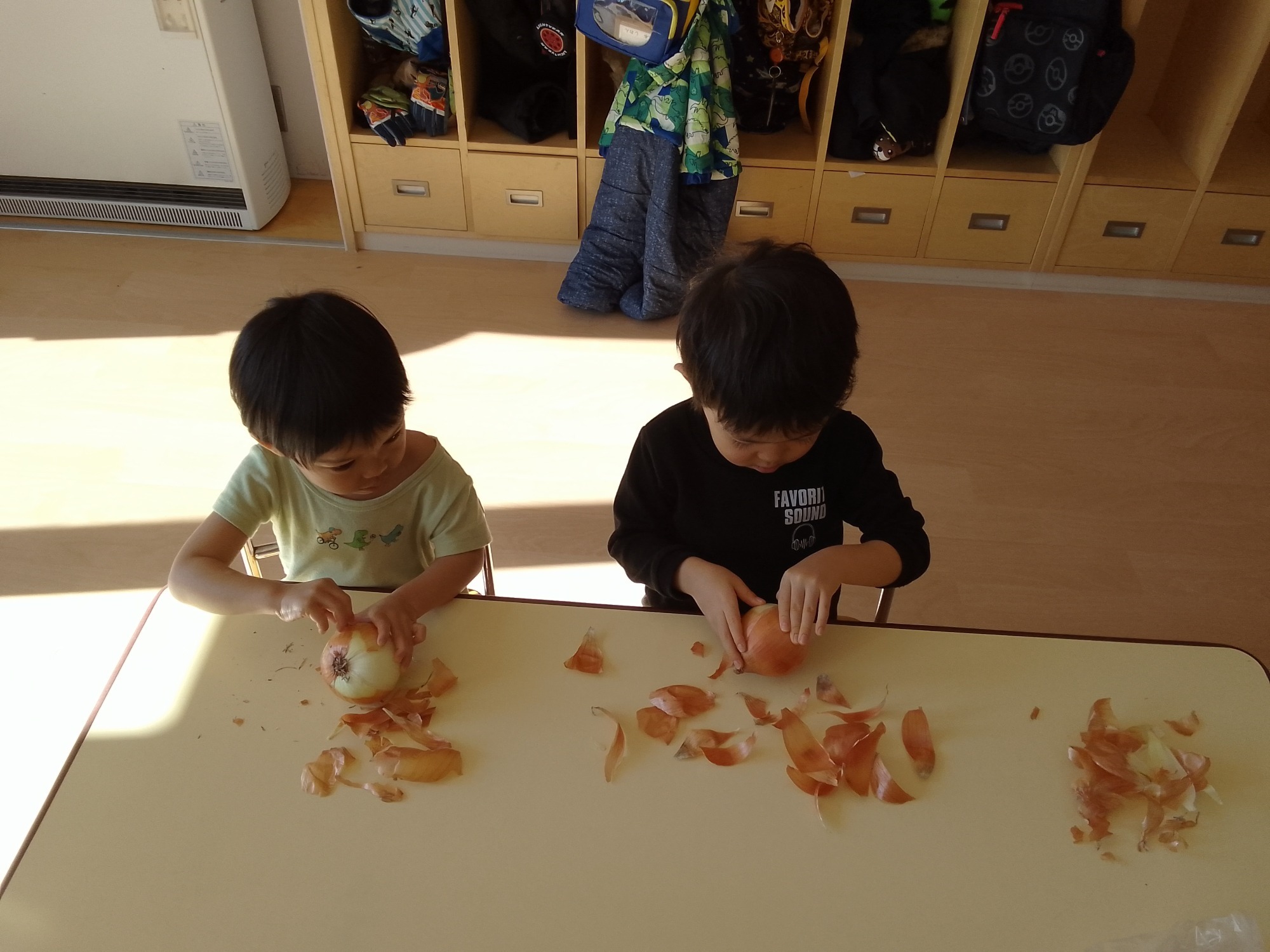 給食で使う玉ねぎの皮むきをしました。指先を使い、真剣に玉ねぎを見て皮をむいていました。自分たちでむいた玉ねぎはおいしかったようです。
