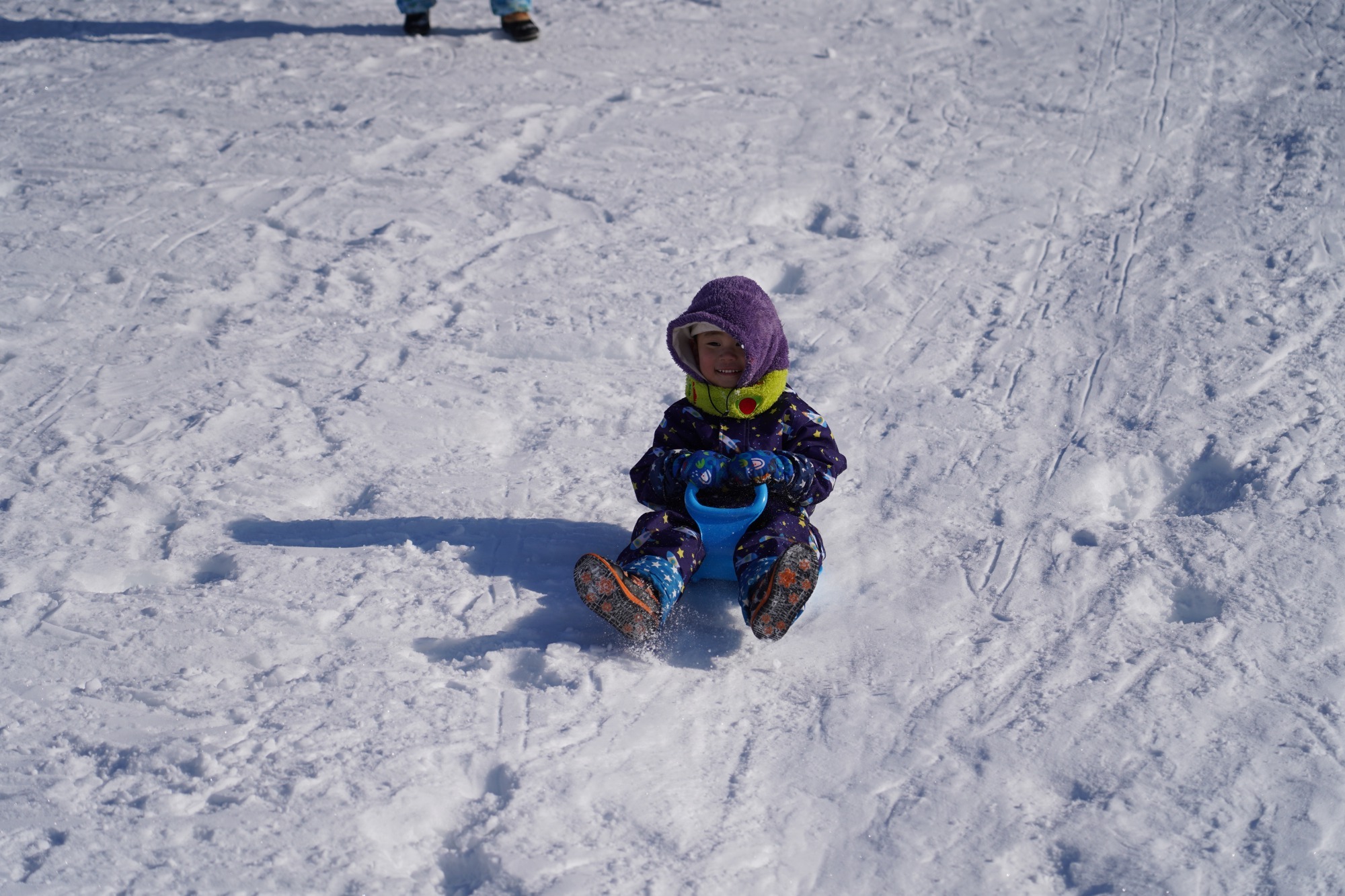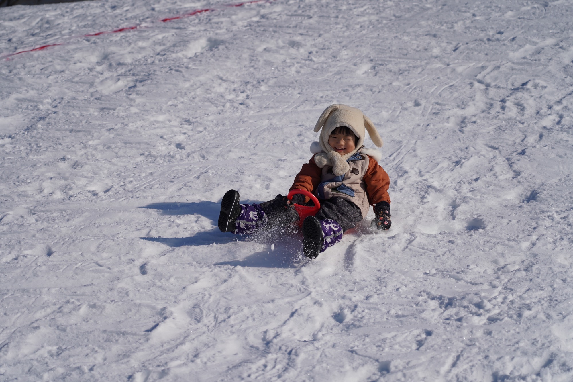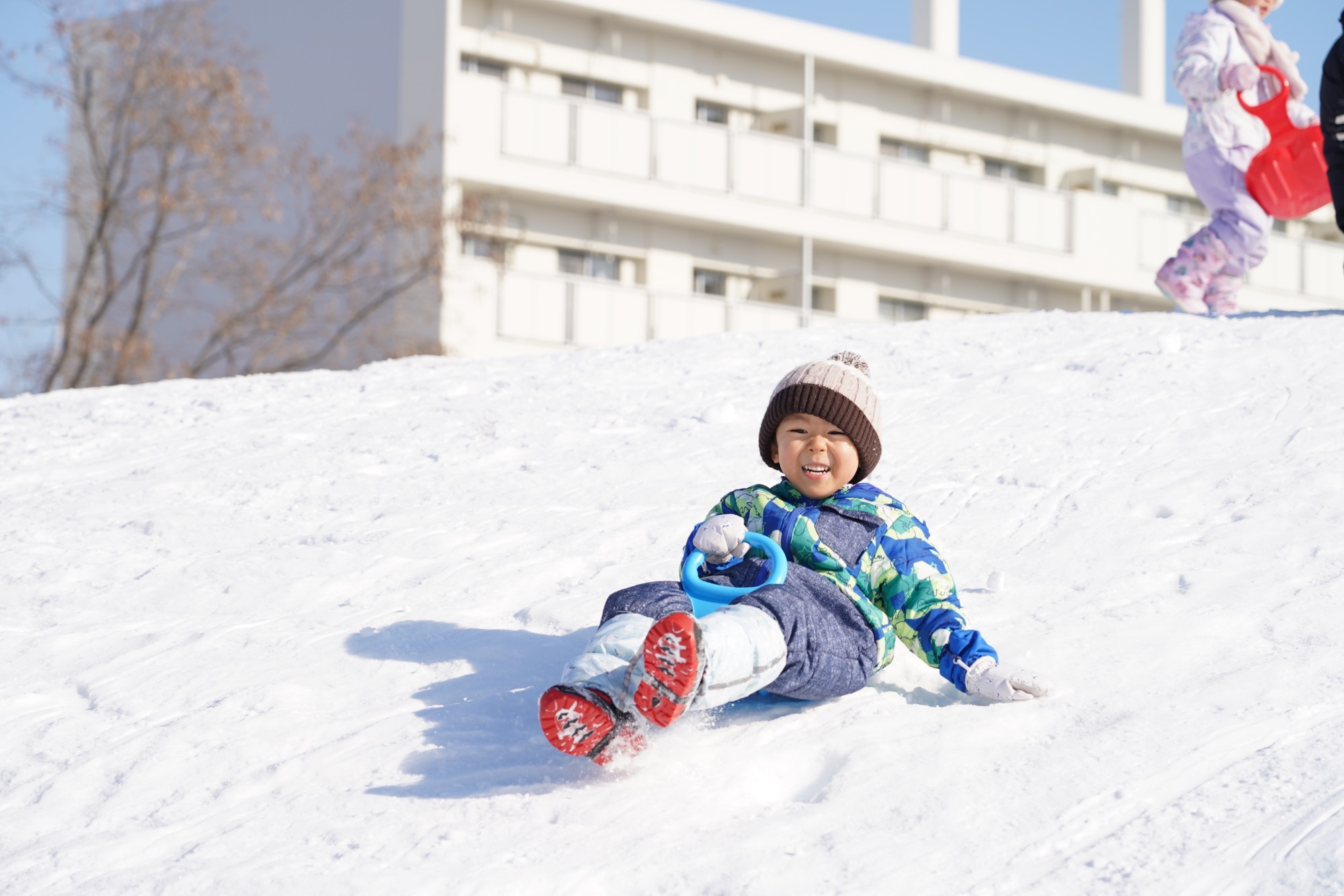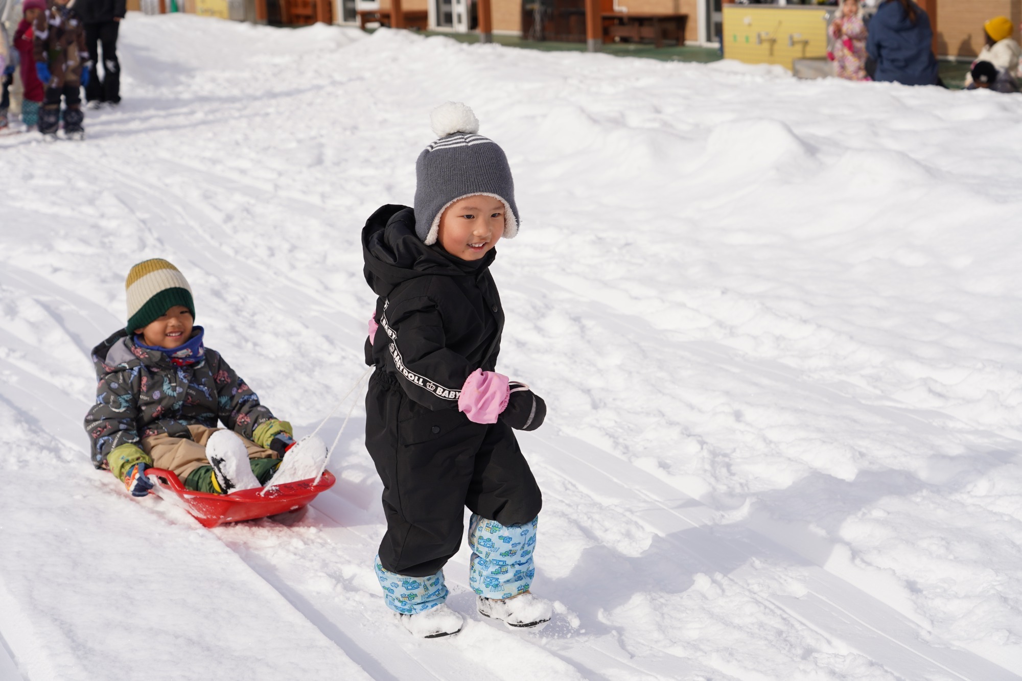 雪遊びが大好きな子どもたちは園庭でのそり遊びを楽しんでいます。今月は園バスに乗って市内の公園へそり遊びをしに行ってきました。園庭より大きな雪山に大喜びでした。