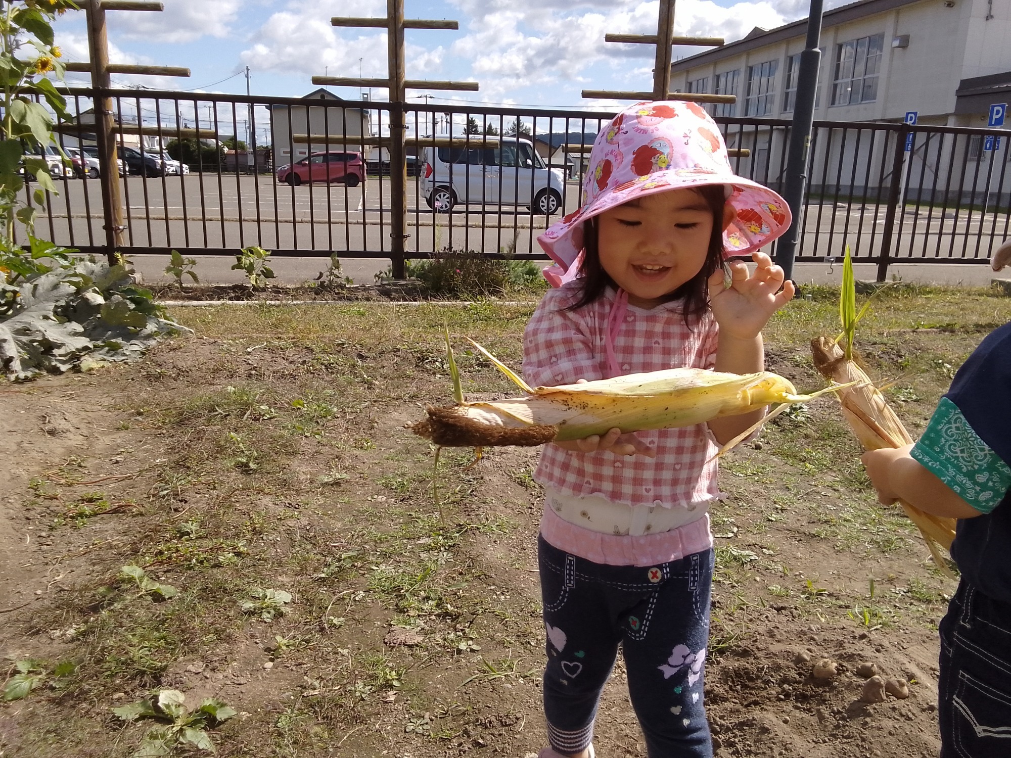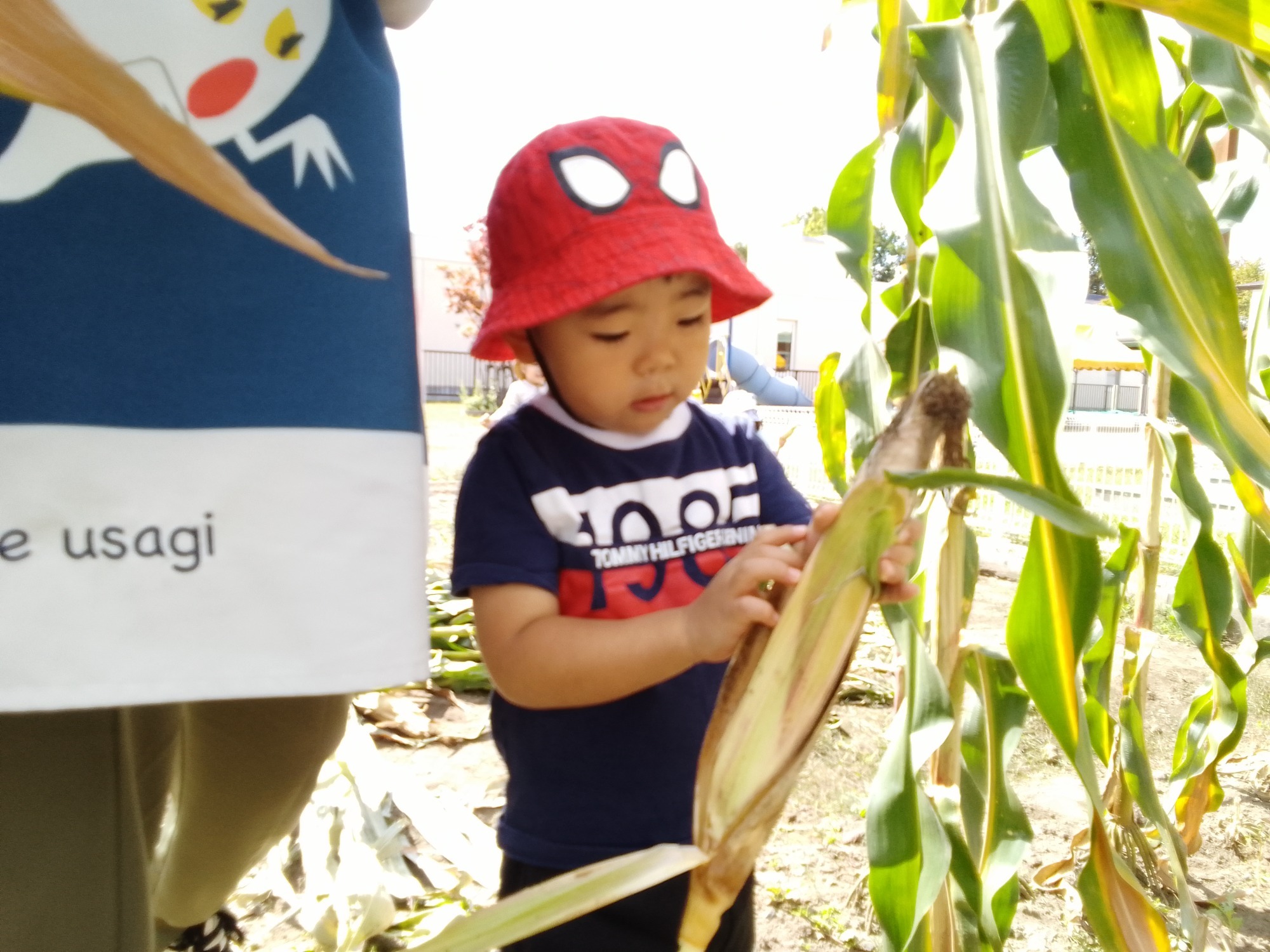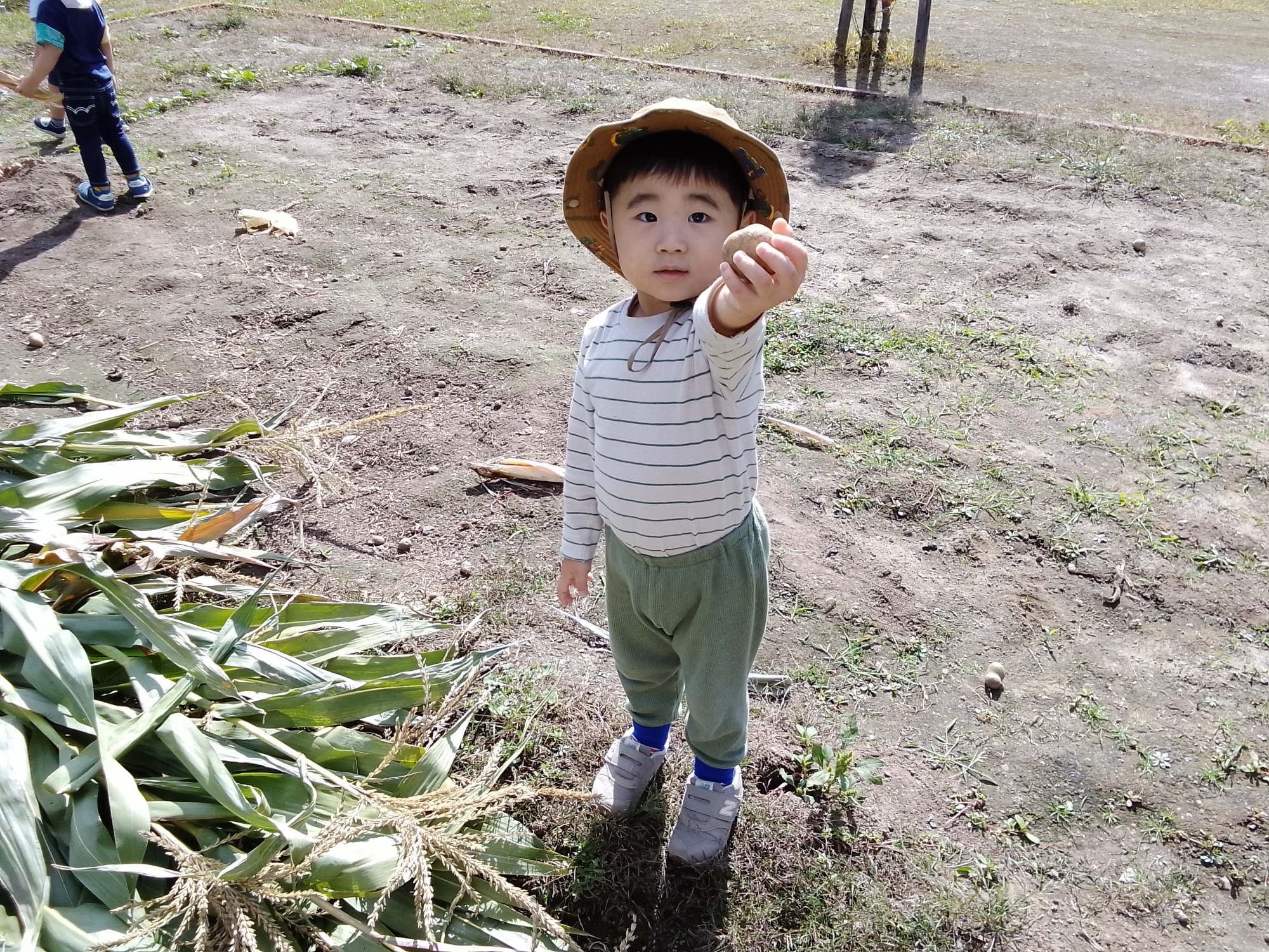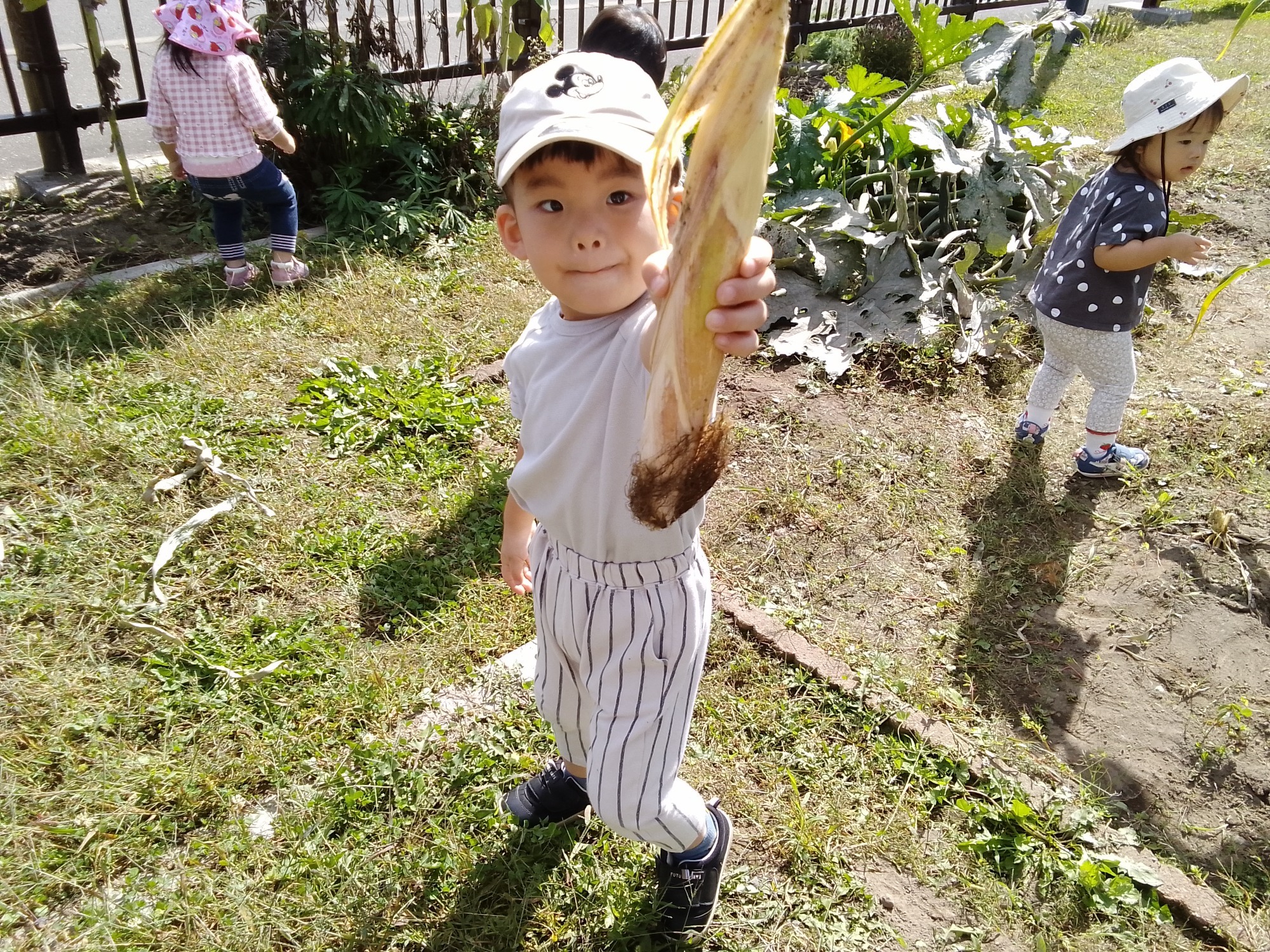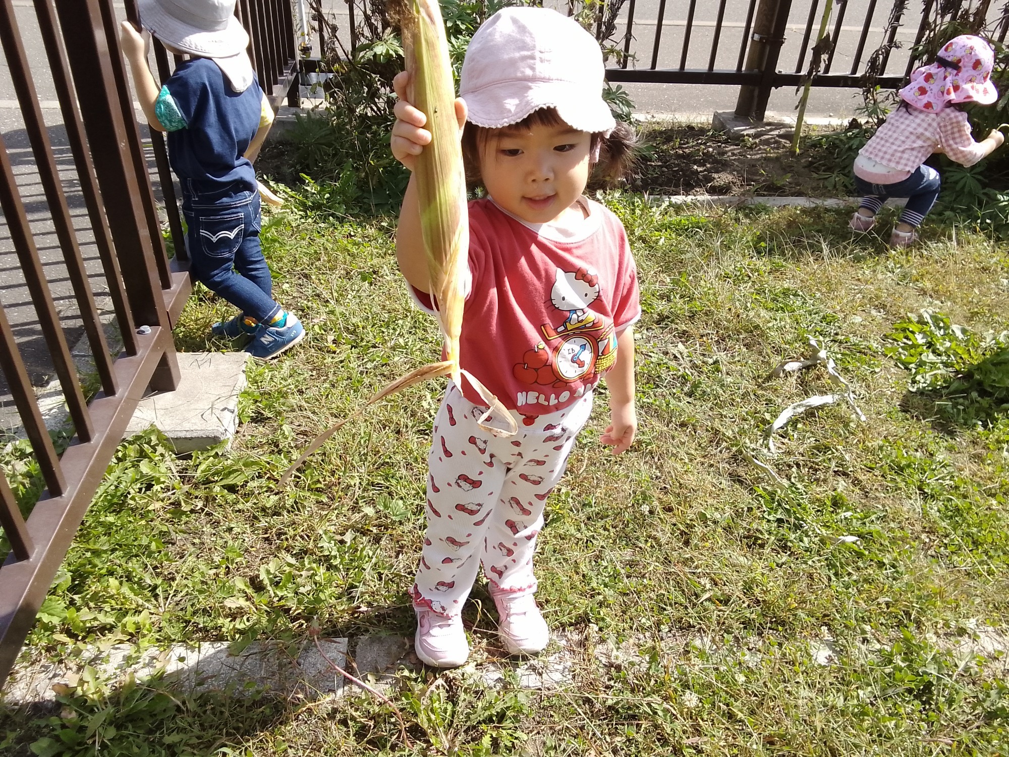 園庭の畑で育てたとうもろこしの収穫をしました。「このとうもろこしをポップコーンにして食べるんだよ」と伝えると、「いつ食べるの?」と、心待ちにしている様子です。「もう少し乾燥してからね」「かんそうってなに?」「とうもろこしがもっと硬くなったらね」とお話しすると、保育室に吊るしているとうもろこしを見るたびに、「もういいかなー」「あと何回寝たら食べられるの?」と、子どもたちの表情や言葉から楽しみにしていることが伝わってきます。子ども達の気持ちも弾けるぐらいに美味しいポップコーンが出来ますように、今からとっても楽しみです。