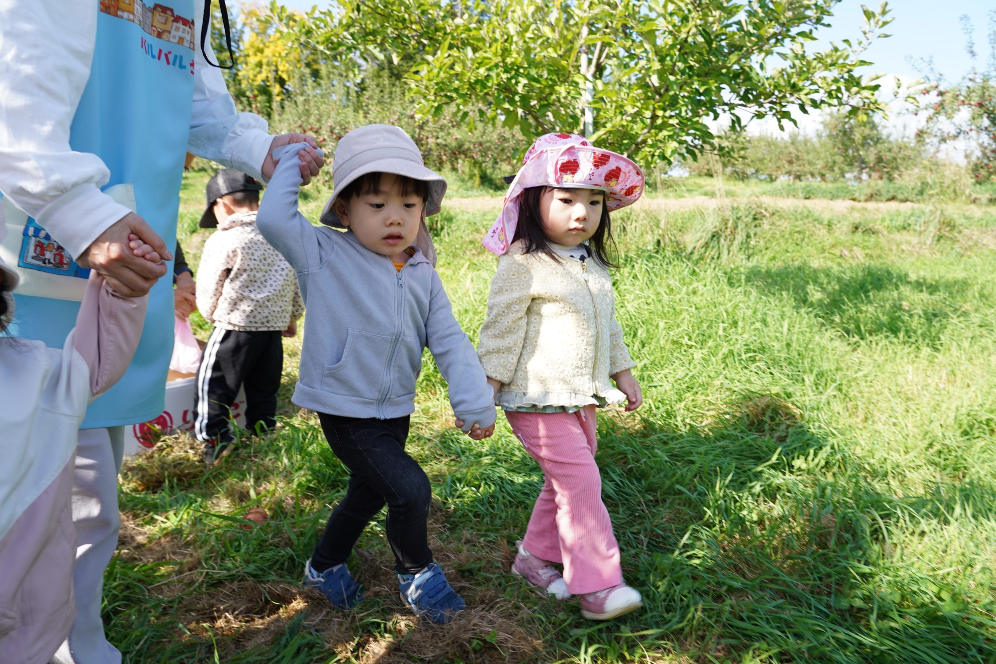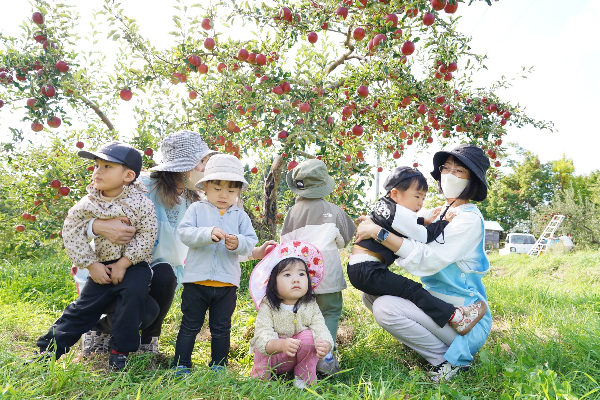 10月は秋の遠足「りんご狩り」の行事がありました。りんご狩りの日には、お弁当をもって大きなバスに乗り、みんなで元気に出発!木になったりんごに手を伸ばし、「どれにしょうかな」とたくさんのりんごの中からどれを採ろうか迷う子どもだちの姿も見られました。自分で採ったりんごを嬉しそうに見せてくれる表情から秋の実りを感じる素敵な一日となりました。