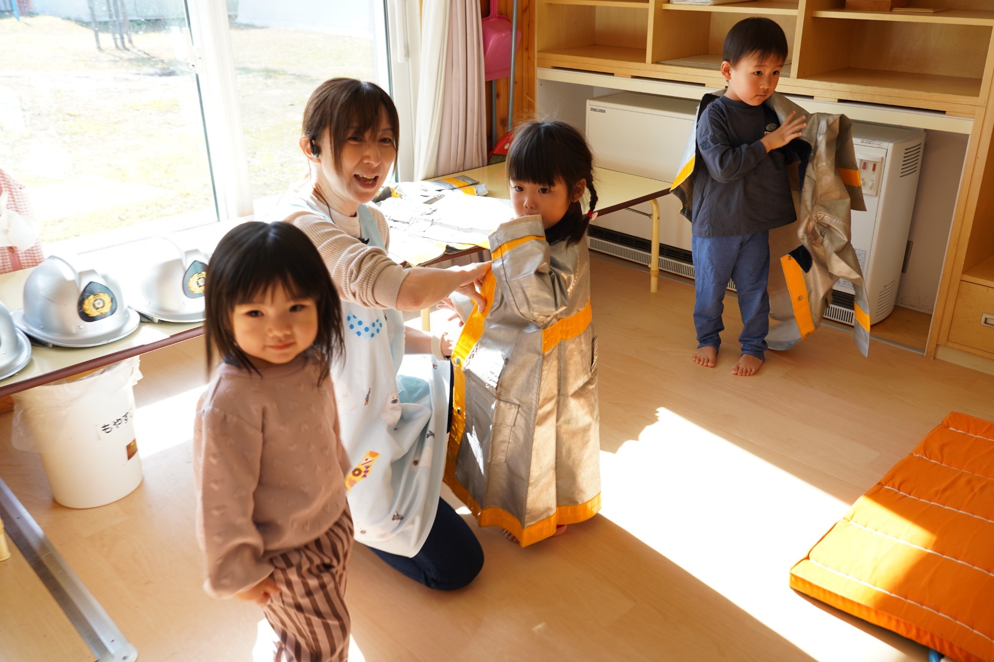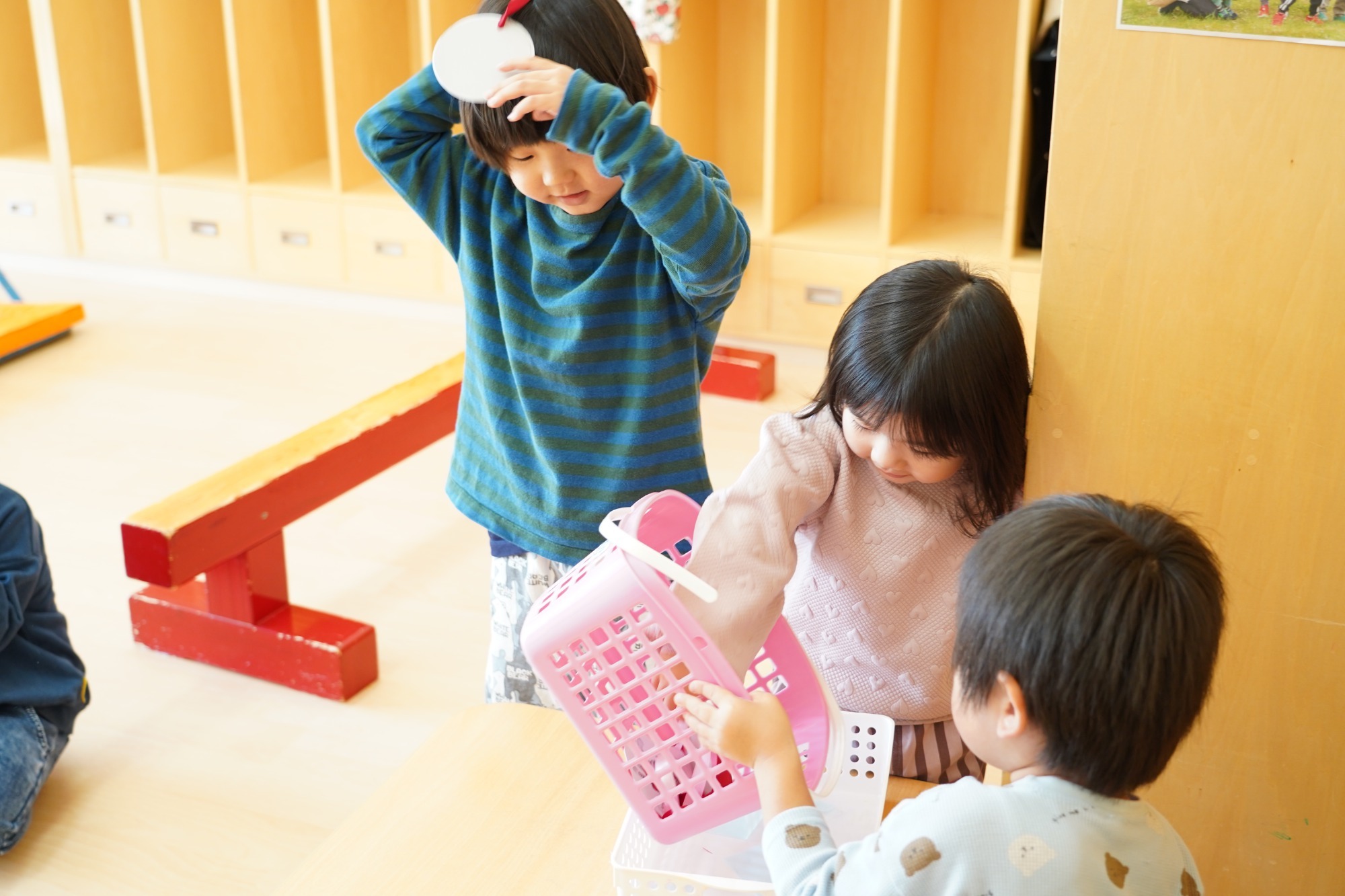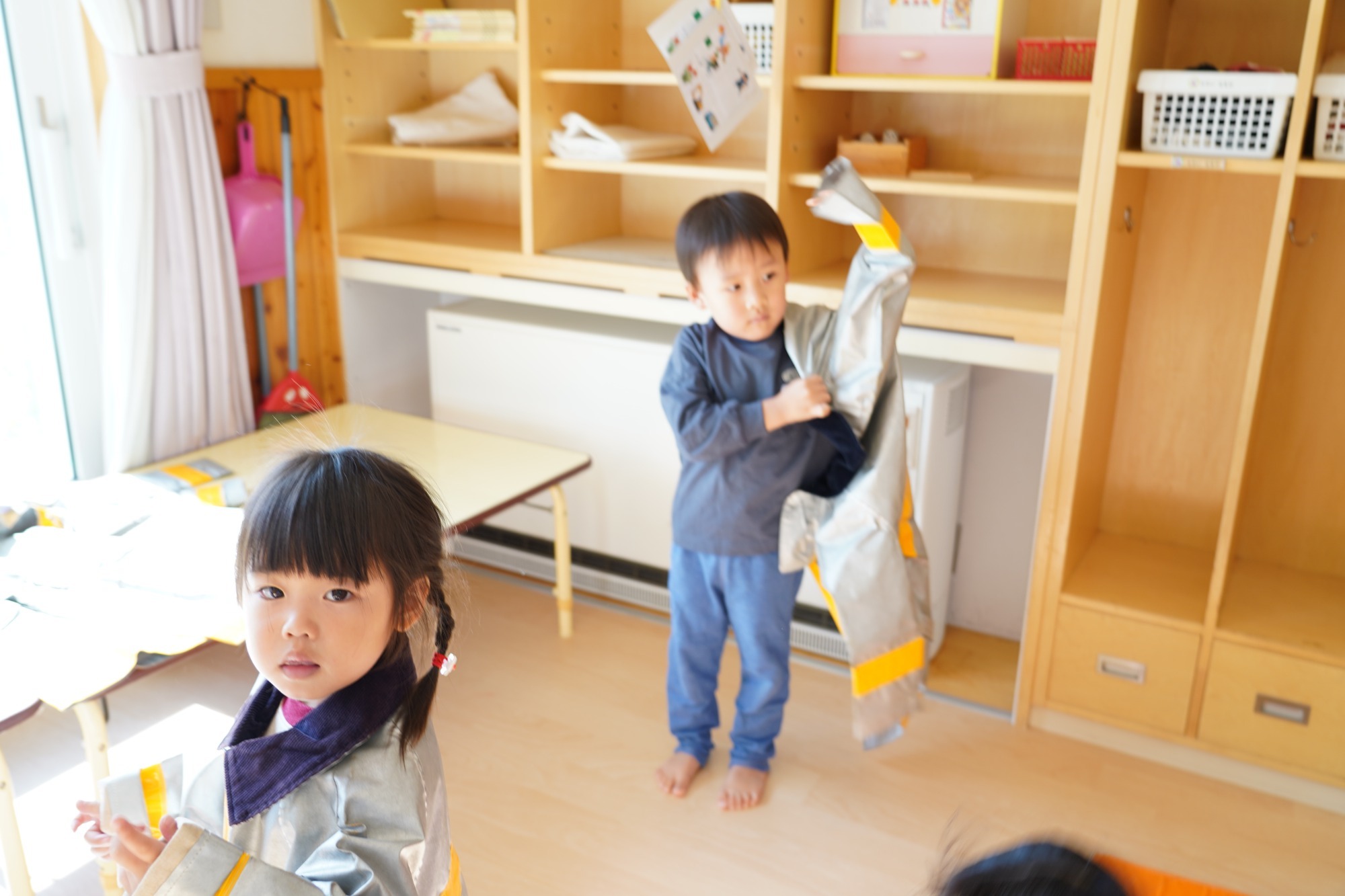 ごっこ遊びを全クラスで「消防士」「ウーバーイーツ」「忍者の修行」を楽しみました。消防士は防火服を着て、色画用紙で作った火にボールをぶつけて、火消しをしてちびっこ消防士になりました。ウーバーイーツは注文したピザやアイスクリームなどの食べ物を届けてくれましたよ。忍者の修行はハードルをまたいだり、トンネルくぐりをしたり、山を登ったりしてたくさん体を動かして遊びました。