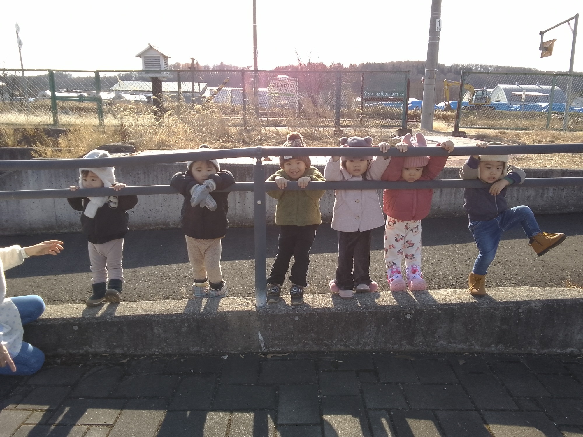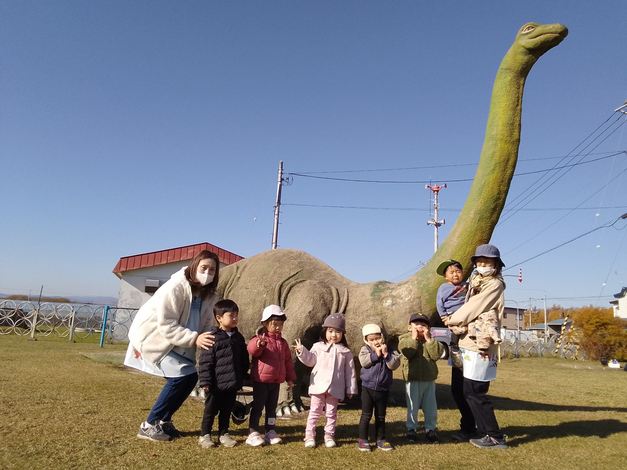 11月は園外保育があり、訓子府町にある「恐竜公園」に行ってきました。大きい恐竜の前で撮影すると、あまりの大きさにビックリする子ども達でしたが、「はい、ポーズ」のかけ声にピースする姿が見られましたよ。生活発表会の練習が始まり、子ども達は元気いっぱい練習をしています。練習の合い間に、お散歩に出掛けて落ち葉を拾って集めたり、園庭では砂遊びやかけっこを楽しんでいます。もうすぐ、冬がやってきますが、雪が降るのを心待ちにしている子ども達です。