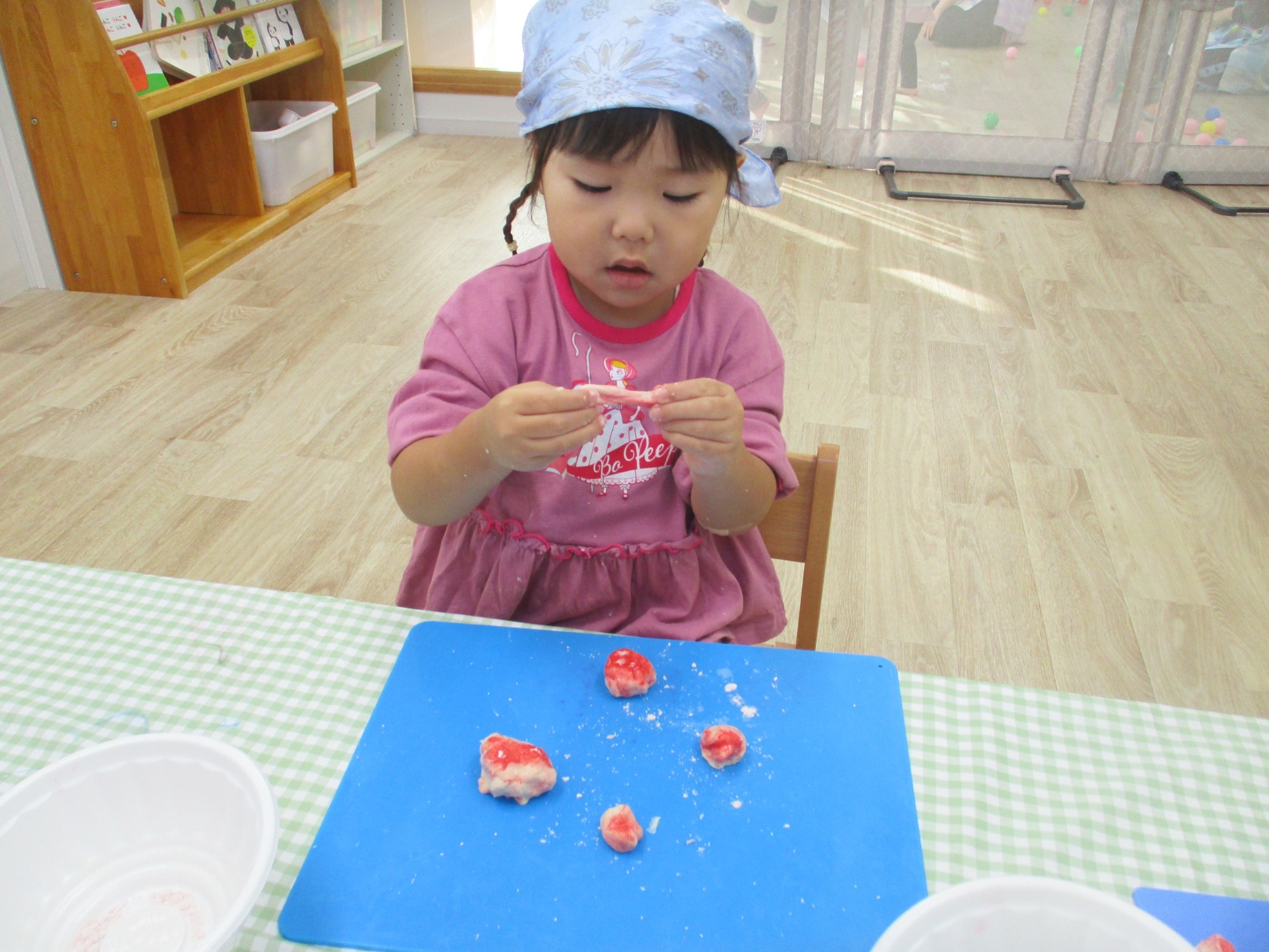 行事のおもちつきの前に、おもちつきごっこをしました!一人でついてみると少し緊張した様子の子も、お友だちとついてみると笑顔になりましたよ。お友だちのパワーは凄いですね✨待っている間は「もちつき」の歌を歌いました。おもちつきを楽しんだ後は、みんなでおもちを小さく丸めます。おもちに見立てた小麦粉粘土をちぎって丸めたくさん並べると「いっぱいできた!」「お店みたいだね」と、とても嬉しそうな子ども達。行事ではあんこ等をつけて食べるため、あんこに見立ててアイシングパウダーをつけてみました。白っぽいパウダーに小麦粉粘土をつけてみると、段々赤色に変わってきて目を輝かせる子ども達!「赤色になったよ」「美味しそう」と喜んでいました。「早く本物のおもち食べたいね」と行事への期待が高まったうさぎ組さんでしたよ。