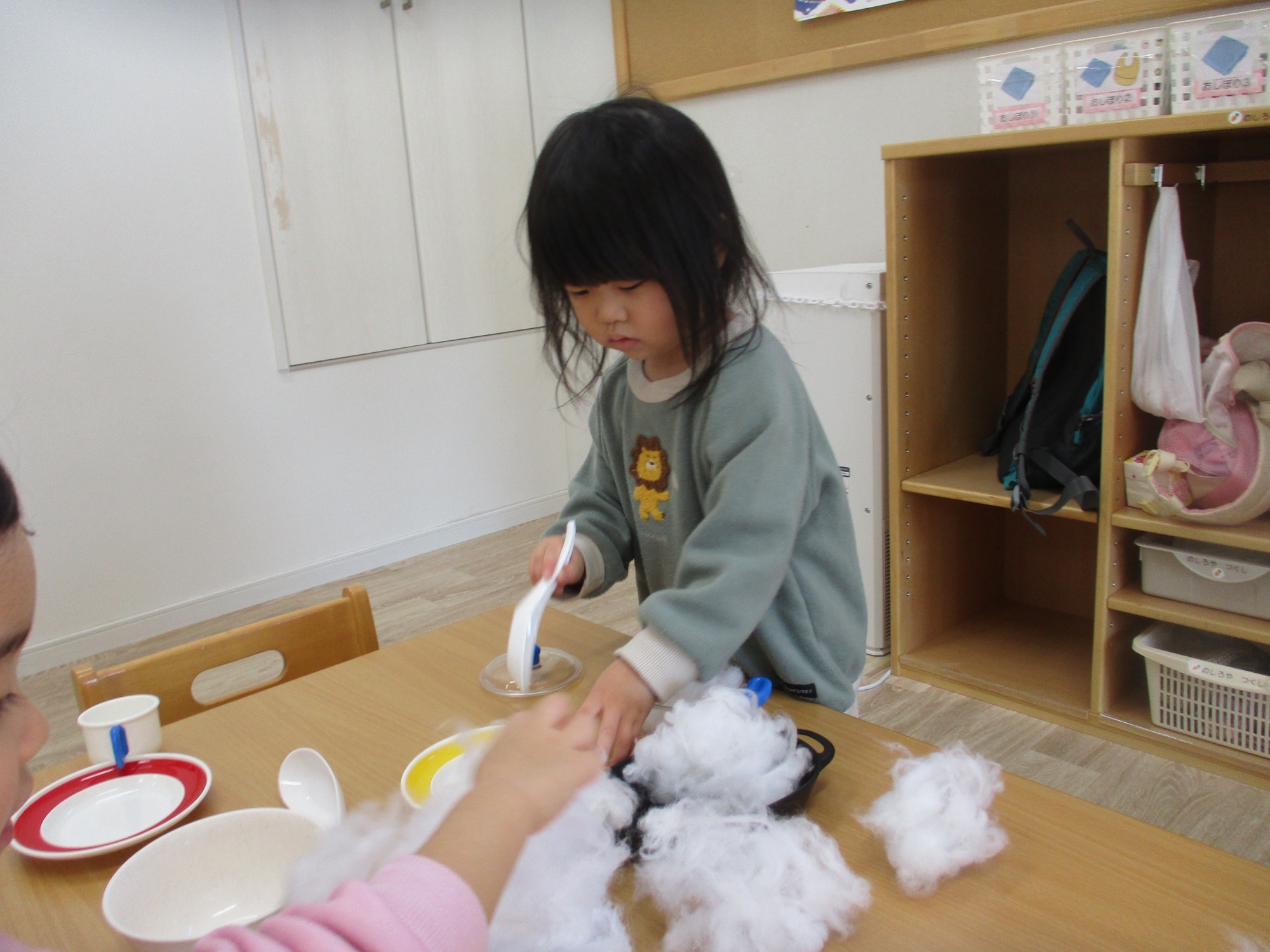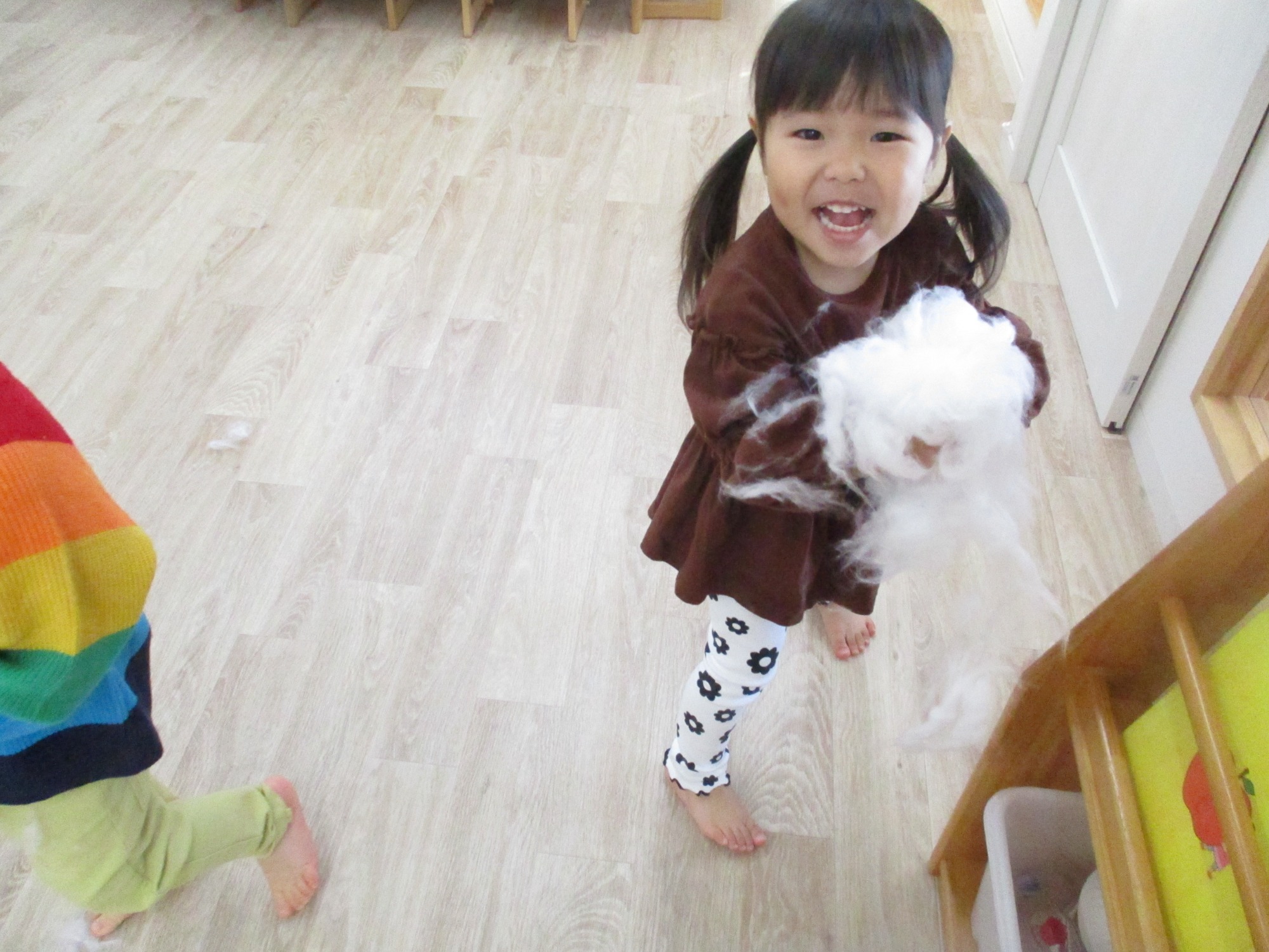 手芸等で使う、綿で遊びました。普段あまり触れる事のない素材のため、大興奮の子ども達!まずはちぎってみたり、空中にふわりと舞わせてみたりしました。「フワフワで気持ちいい」「雪みたい」と全身で綿の感触を堪能しましたよ。お皿を出してみるとおままごとの材料に早変わり。ご飯にしたり、ケーキにしたりとそれぞれ綿から連想した食べ物に見立てていました。中には、おもちつきの事を思い出して手で丸める子もいましたよ。さらにフェルトと組み合わせて、サンドイッチやクレープ作りも楽しみました♪次々と食べ物が出来上がり、子ども達の発想力に驚きました。最後は袋に集めて布団を作り、交代で身体にかけるととても嬉しそうな子ども達。「眠くなってきた」と寝ているまねをする子もいて可愛らしかったです💖綿で色々な遊びを楽しんだうさぎ組さんでした。
