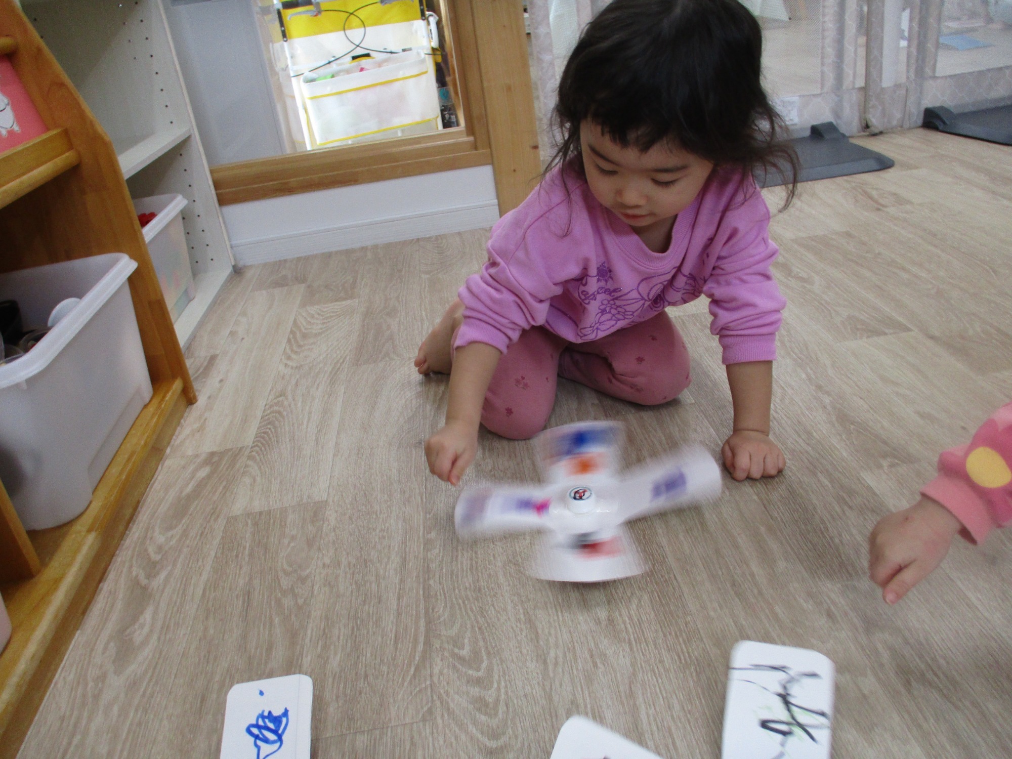 紙皿とキャップを使ってこまを作って遊びました♪今年度こま遊びは2度目なのですが、好きな色のペンを使って色を塗ることに加えて模様や好きなキャラクターを描いたり、前はコマを上手く回せなかった子も今回は挑戦して徐々に回せるようになっていたりと成長を感じる場面も見られました。好きな色を何色か混ぜてグラデーションのように塗り「見てみて綺麗!」と見せてくれる子もいれば、紙皿の周りのガタガタ感ペンでなぞりながら楽しんでいる子もいました。また、隣で完成した友だちがこまを回していても、とても集中して最後までお絵描きを楽しんでいる子もいました。まずは個々で自分のこまを回してみるうさぎさんだったのですが、保育者がある子と「よ~いどん!」と同じタイミングでこまを回してどちらが長く回っているかを競って楽しんでいると、周りの子ども達も集まってきて、皆でこま大会が始まりました。手拍子しながら自分のこまに「頑張れ~!」と念を送る様子がとても可愛かったです。こま遊びを楽しんだ後、ある子が両手にこまを持ってタンバリンのように演奏して楽しむ姿があり、音楽遊びへと発展していきました。マラカスも加え、タンバリン又はマラカスを持ってステージに乗って音楽会です♪馴染みのある「おもちゃのチャチャチャ」や子ども達からの提案曲「人魚姫の曲」などに合わせて全身を動かしたり歌ったりしながら楽しみました😊
